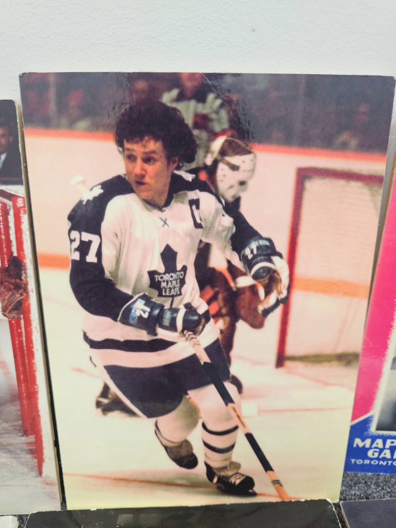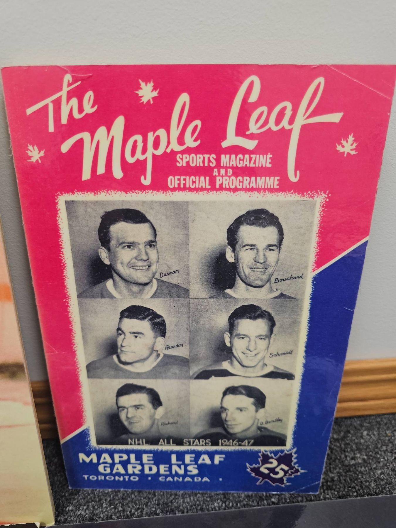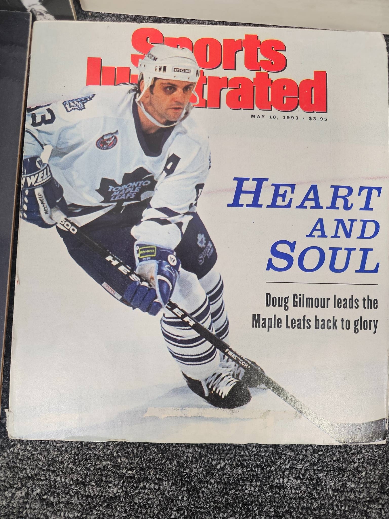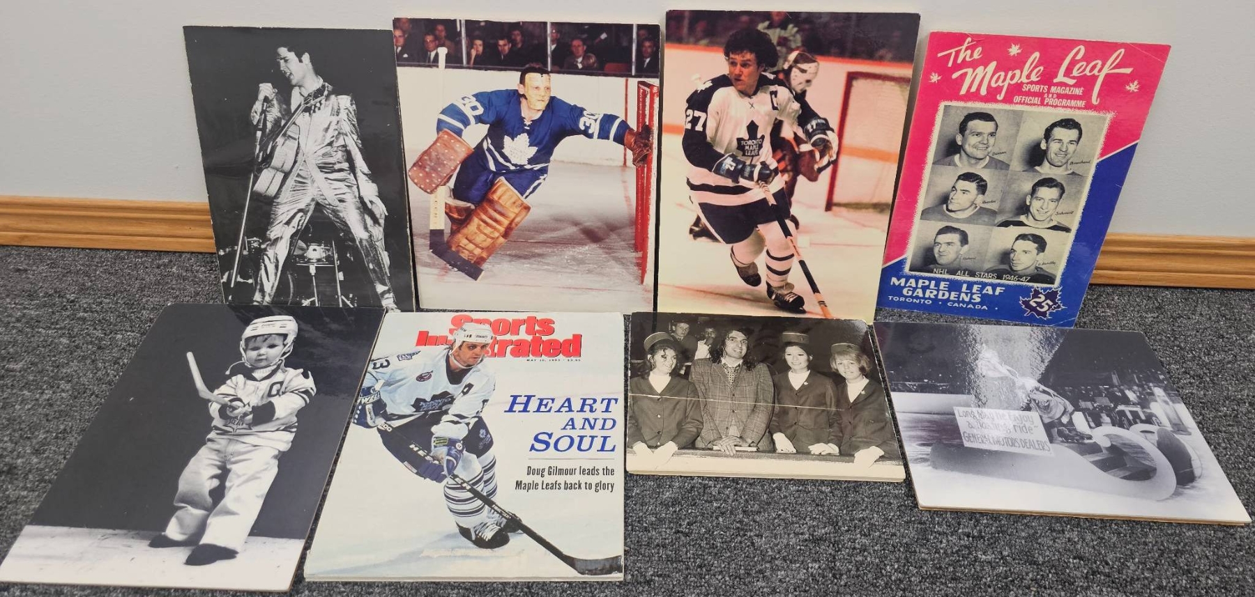 A curated collection centered around the Toronto Maple Leafs, including Sports Illustrated featuring Doug Gilmour (May 1993 issue), vintage Maple Leaf Gardens program (1946-47 NHL All-Stars), action and portrait photos of Maple Leafs players, and additional ephemera. Features hockey greats and includes interesting historical images, perfect for collectors or fans of the sport's rich history.