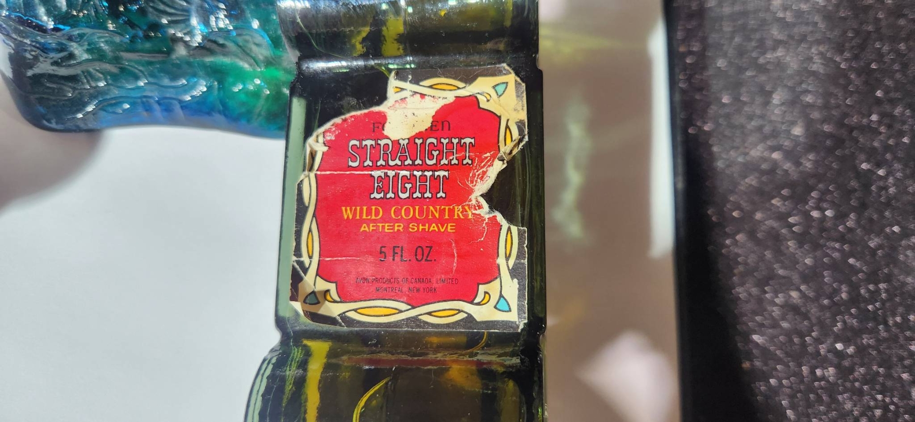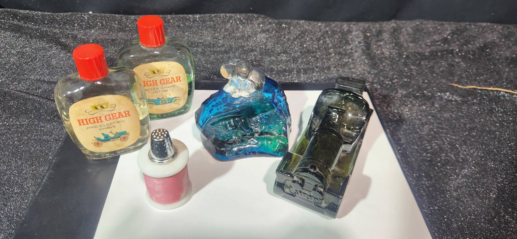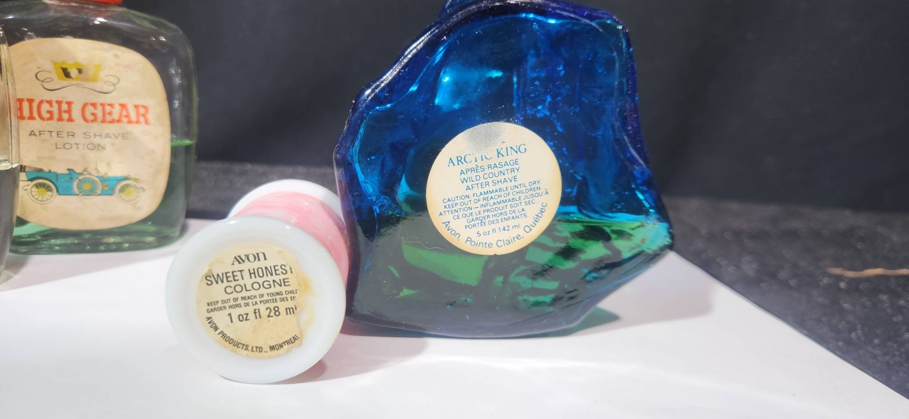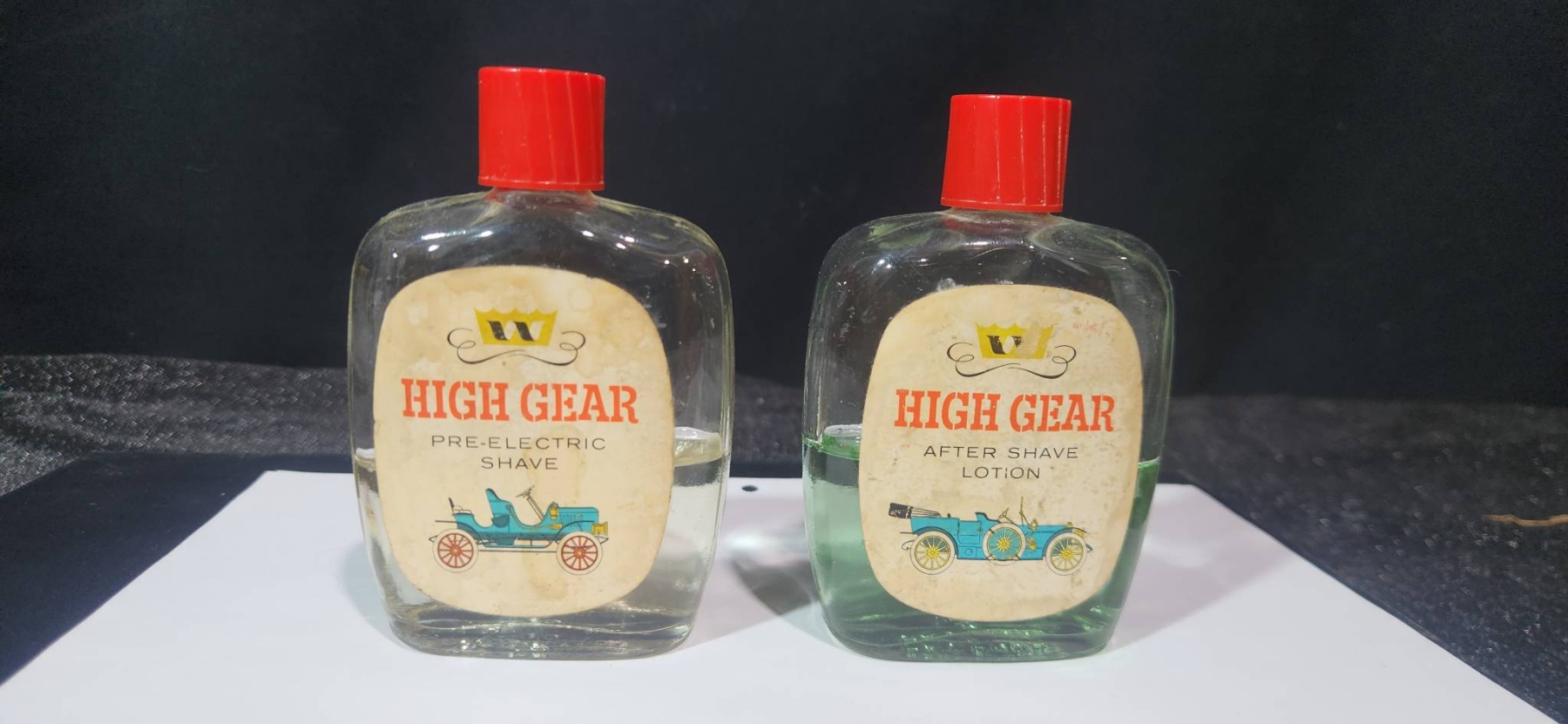 A captivating assortment of vintage-style men’s cologne and aftershave bottles, each with its own charm. Includes two ‘High Gear’ aftershave bottles with some product remaining, a cologne bottle with ‘Sweet Moments’ label, a cobalt blue glass whale-shaped bottle with metallic detailing, and a green glass car-shaped bottle labeled ‘Straight Eight’ Wild Country aftershave, also with some product inside. Great for collectors or vintage decor lovers.