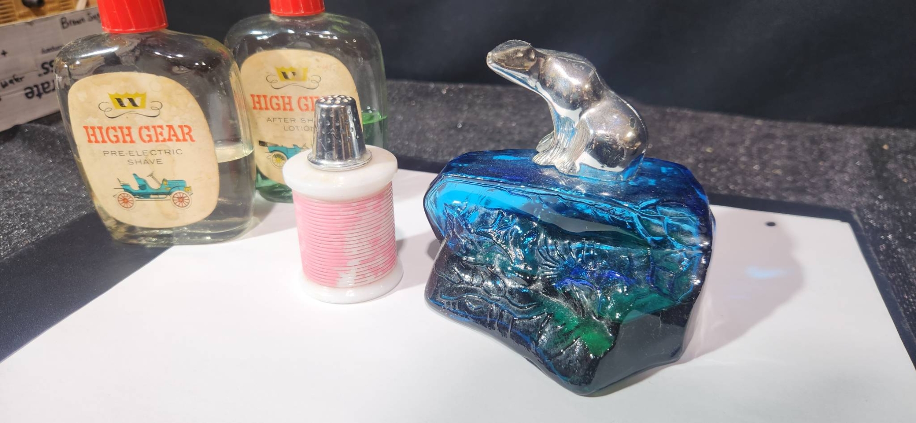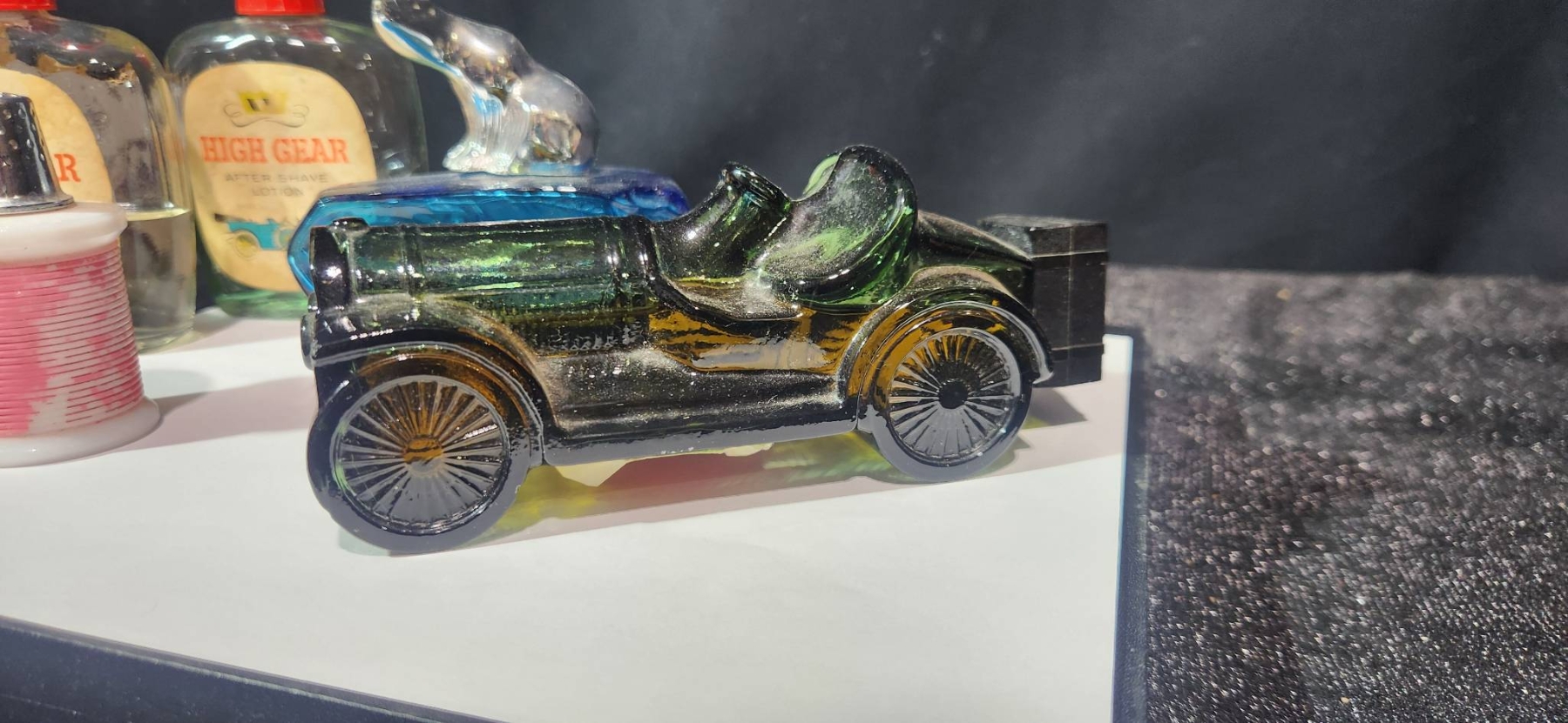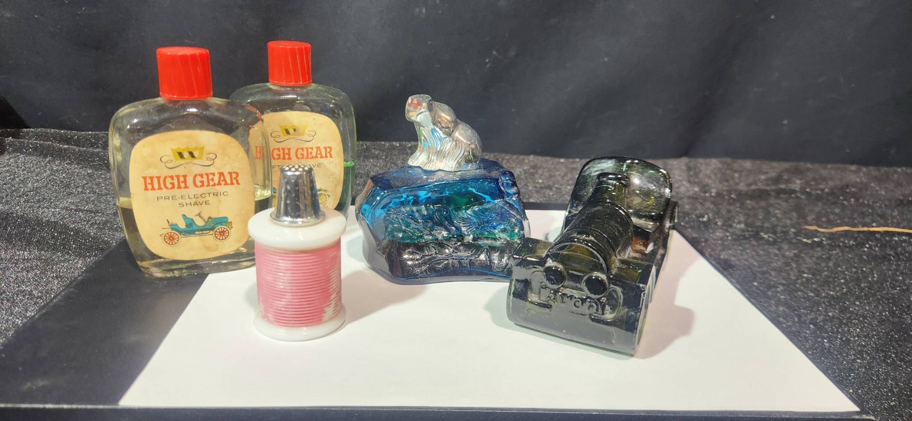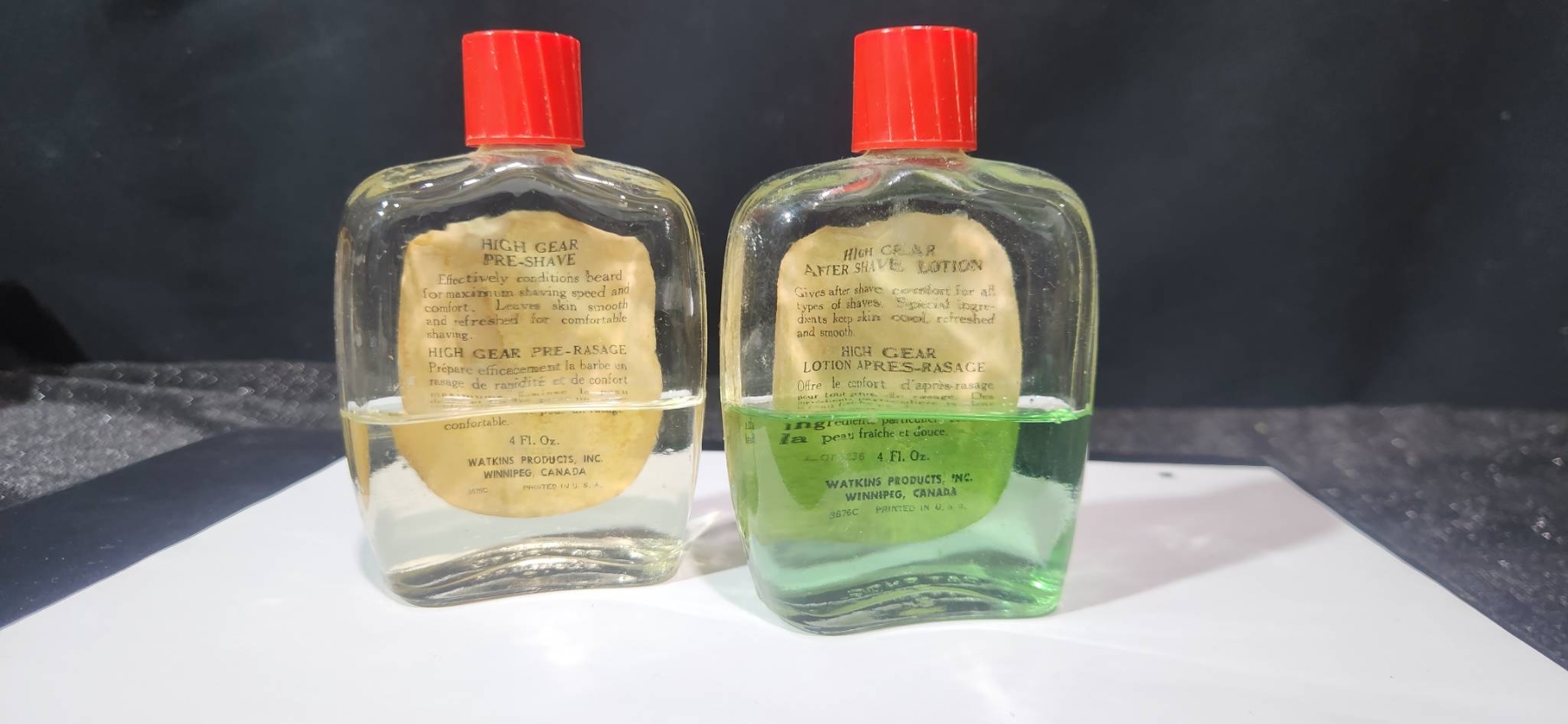 A captivating assortment of vintage-style men’s cologne and aftershave bottles, each with its own charm. Includes two ‘High Gear’ aftershave bottles with some product remaining, a cologne bottle with ‘Sweet Moments’ label, a cobalt blue glass whale-shaped bottle with metallic detailing, and a green glass car-shaped bottle labeled ‘Straight Eight’ Wild Country aftershave, also with some product inside. Great for collectors or vintage decor lovers.
