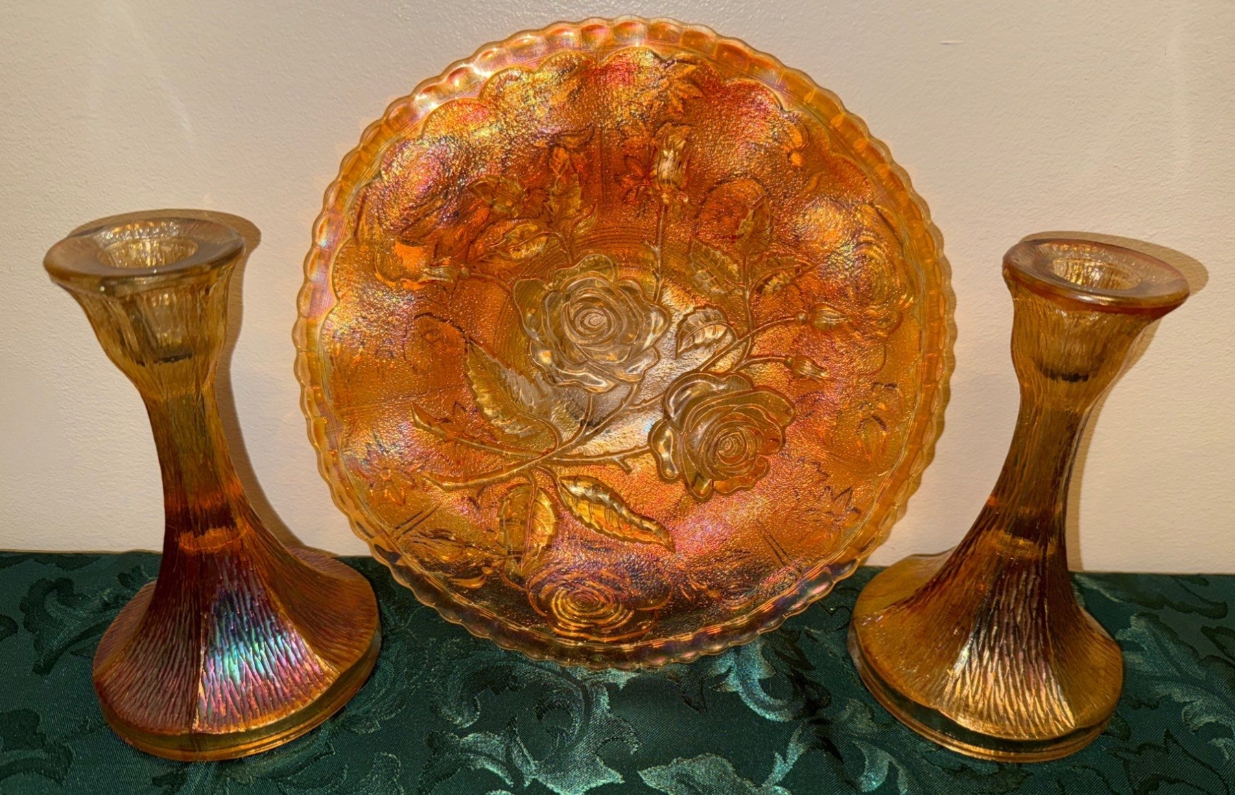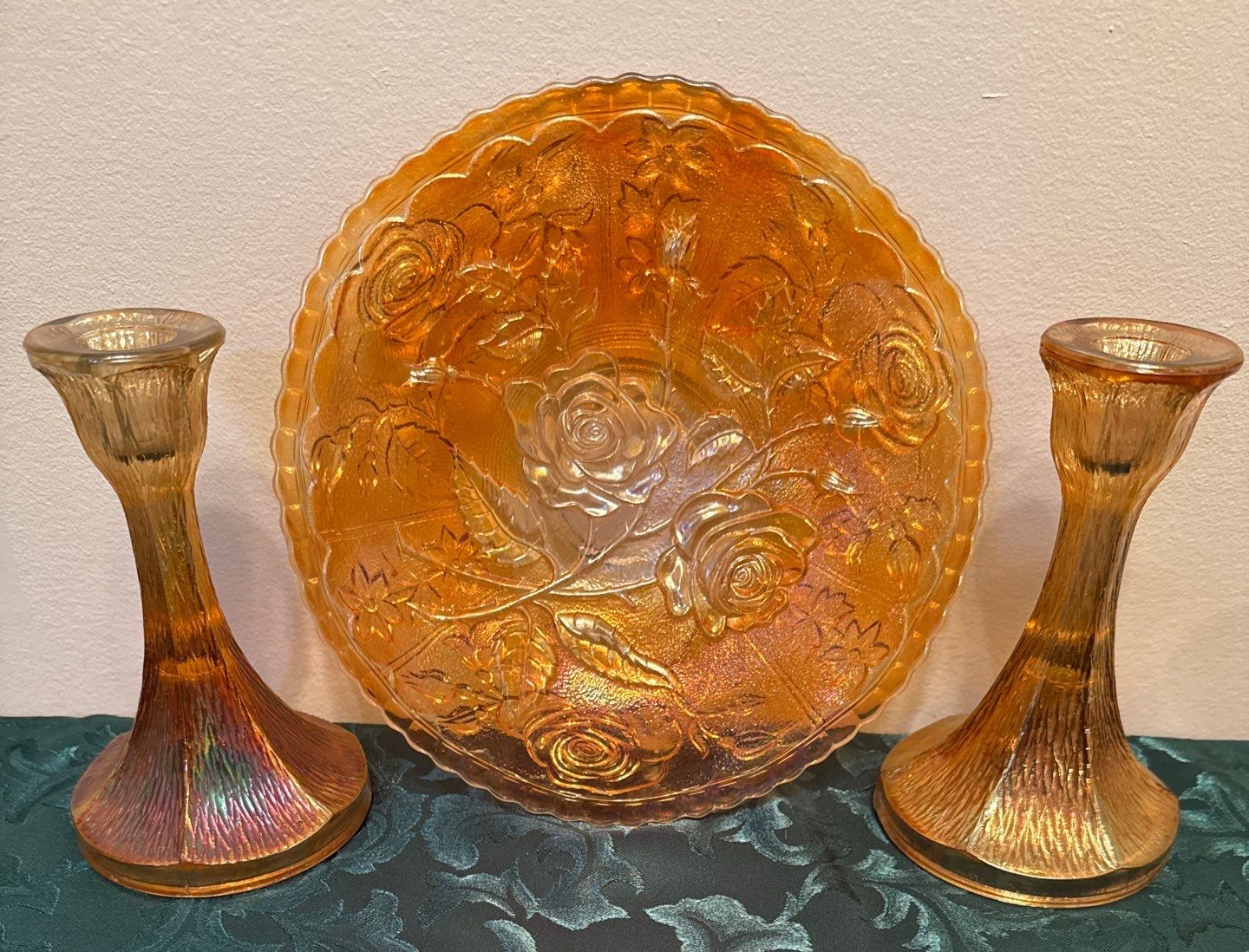 Tree Bark Pair of Marigold Carnival Glass Candlesticks & Prism Band Jeanette Glass Co.