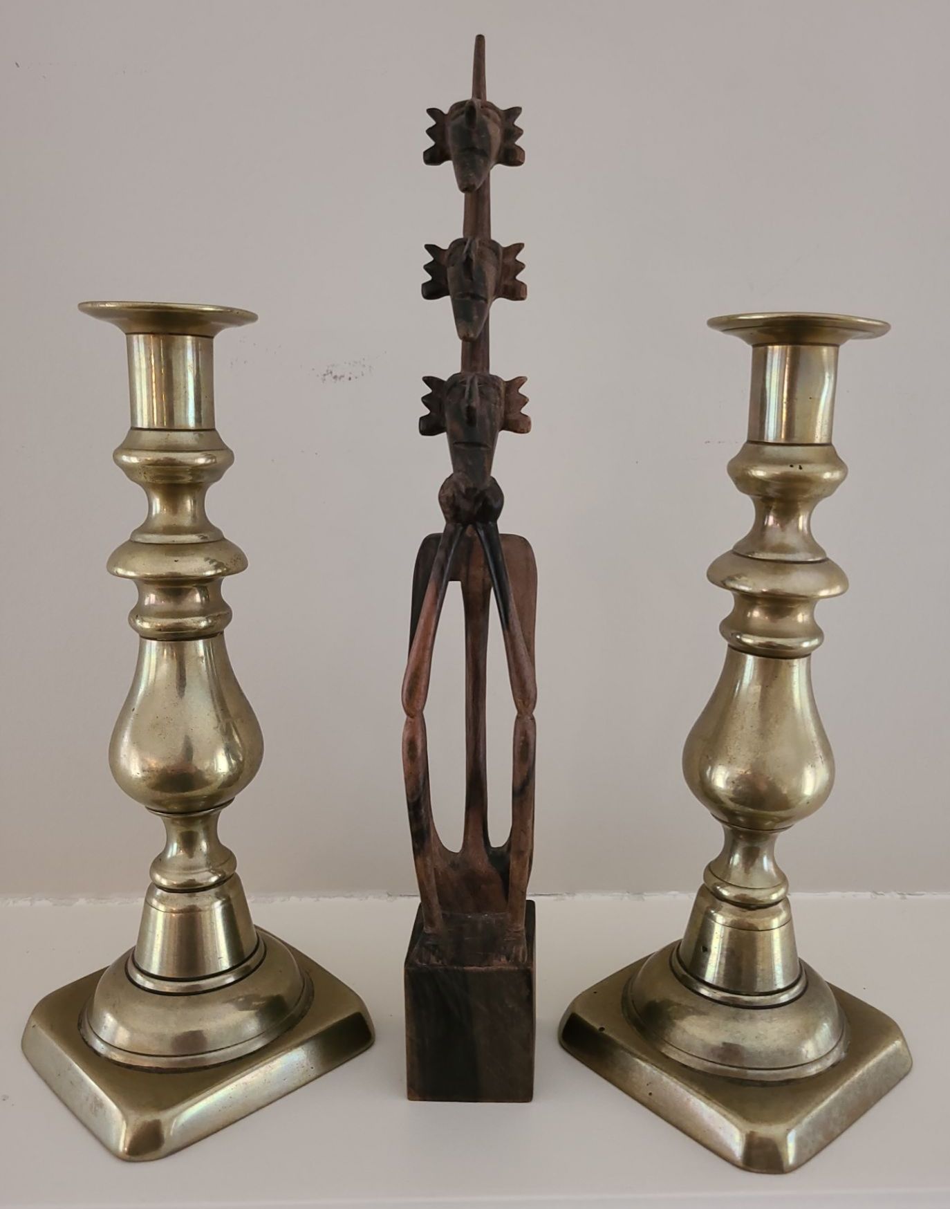 Tribal Hand Carved Wooden Art (2W, 12T) w/ Pair of Lovely Brass Candlesticks