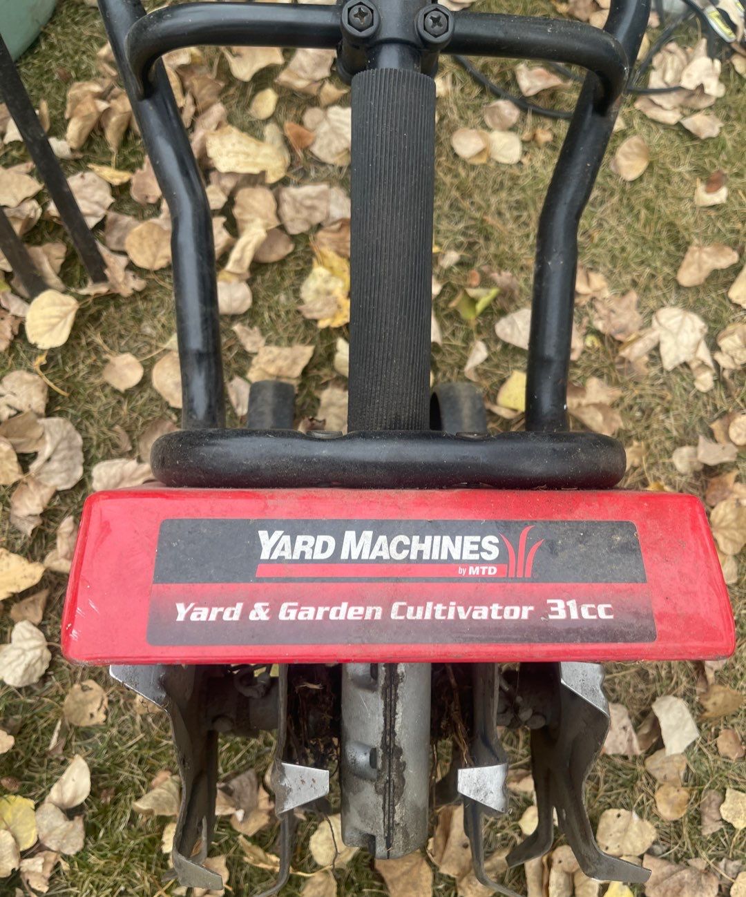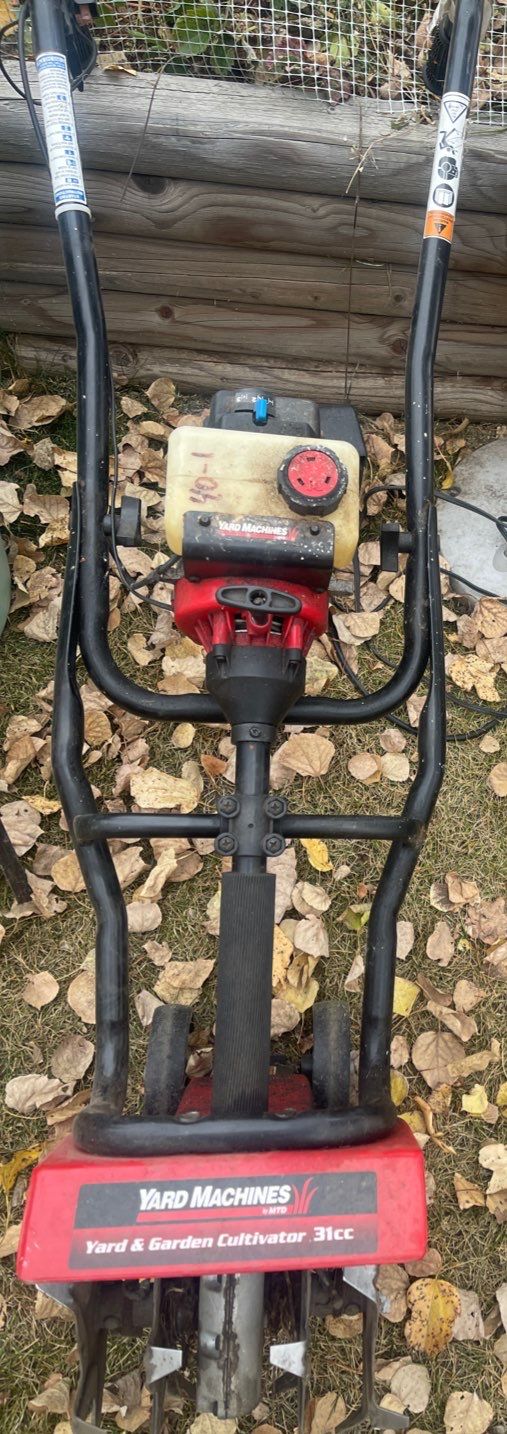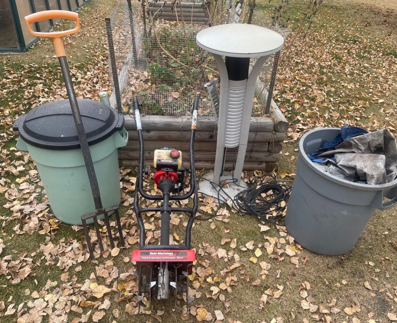 Troy-Bilt Garden Tiller, Garden Fork, Garbage Cans, & Bug Light/Zapper