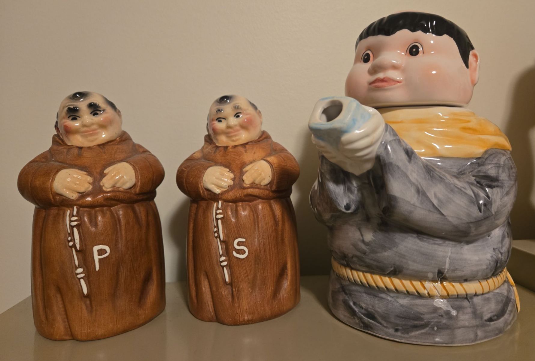 Twin Winton Salt & Pepper Shakers Plus Jug, Monk Themed