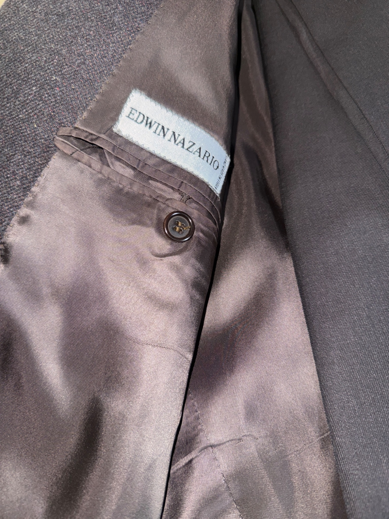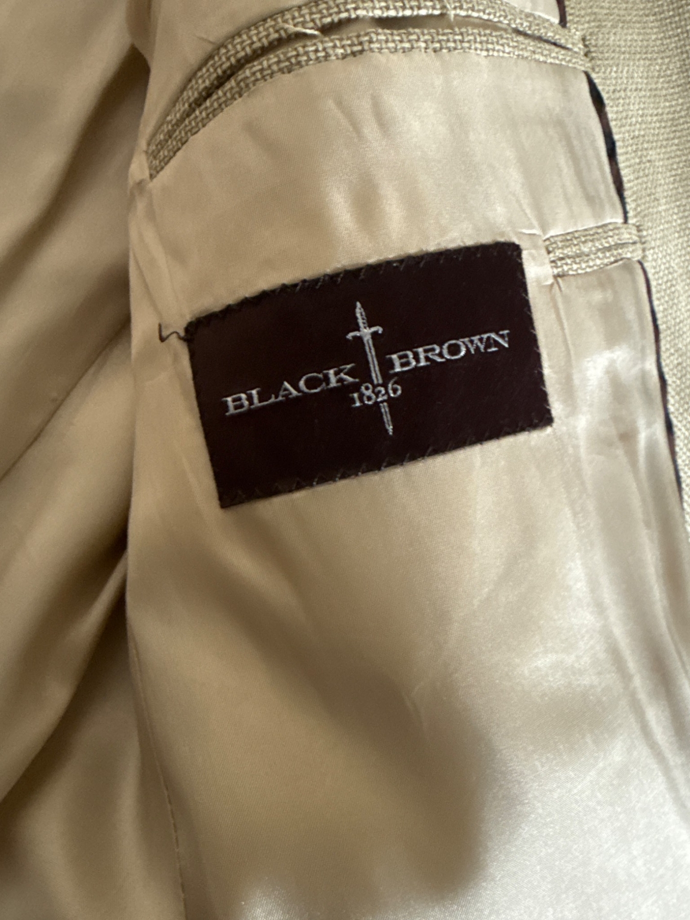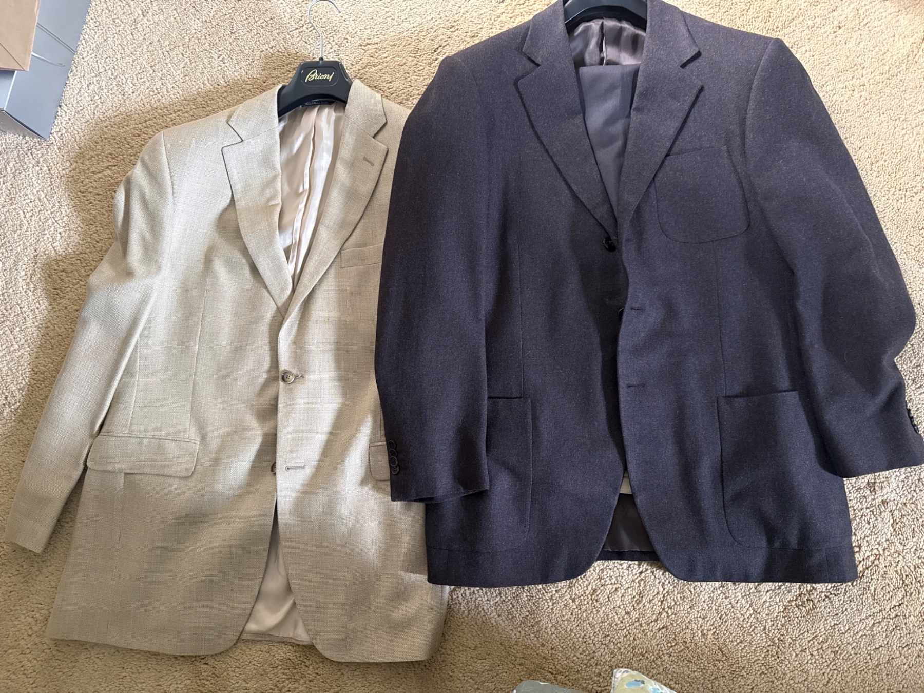 Two men's blazers in size 42T. Includes a light-colored blazer by Black Brown 1826 and a darker blazer by Holt Renfrew. Both crafted with attention to detail in Italy, featuring full interior linings and outer pockets. These timeless pieces combine comfort and elegance, perfect for formal or business events. Maintain their classic fit with long tailoring to suit taller frames.