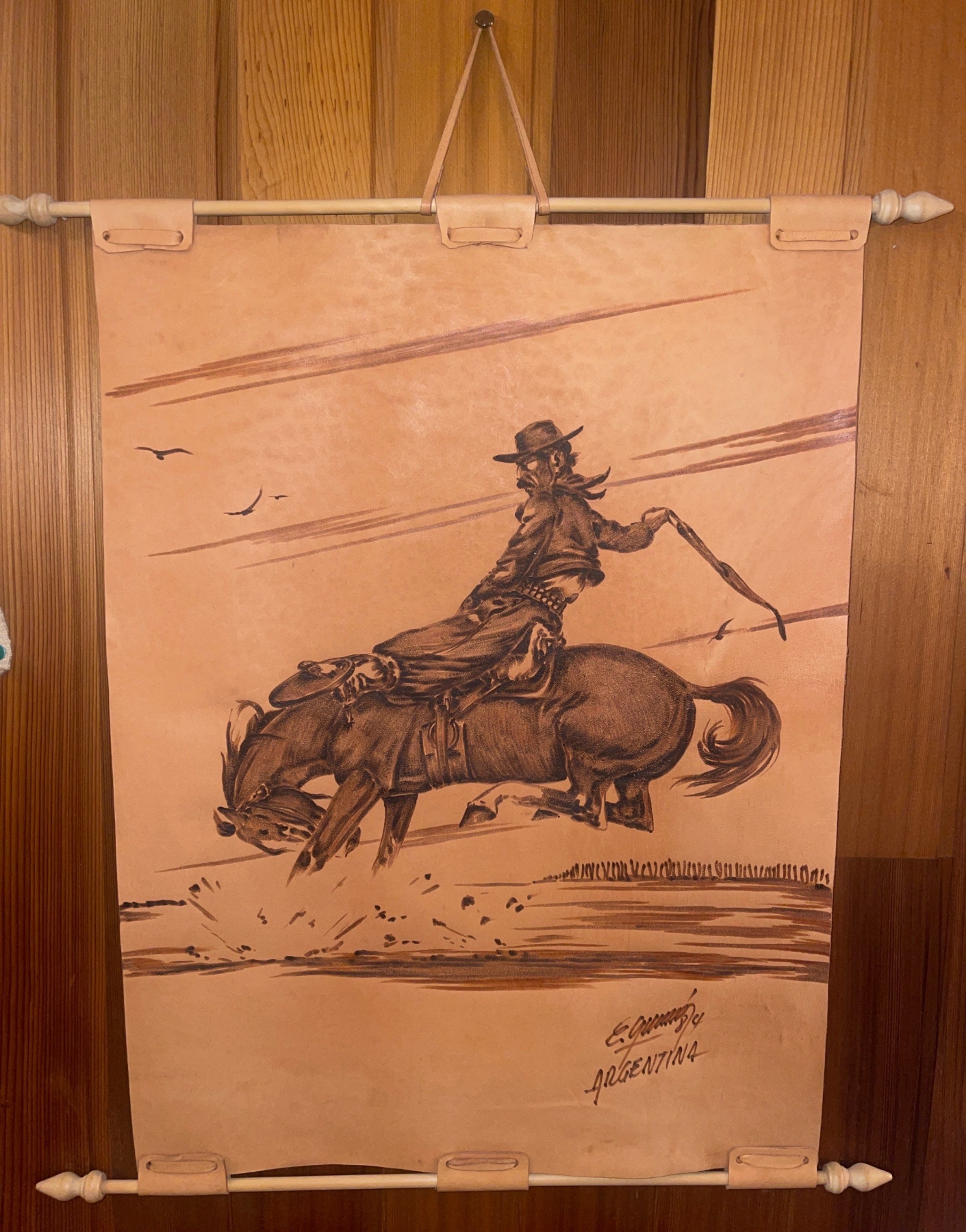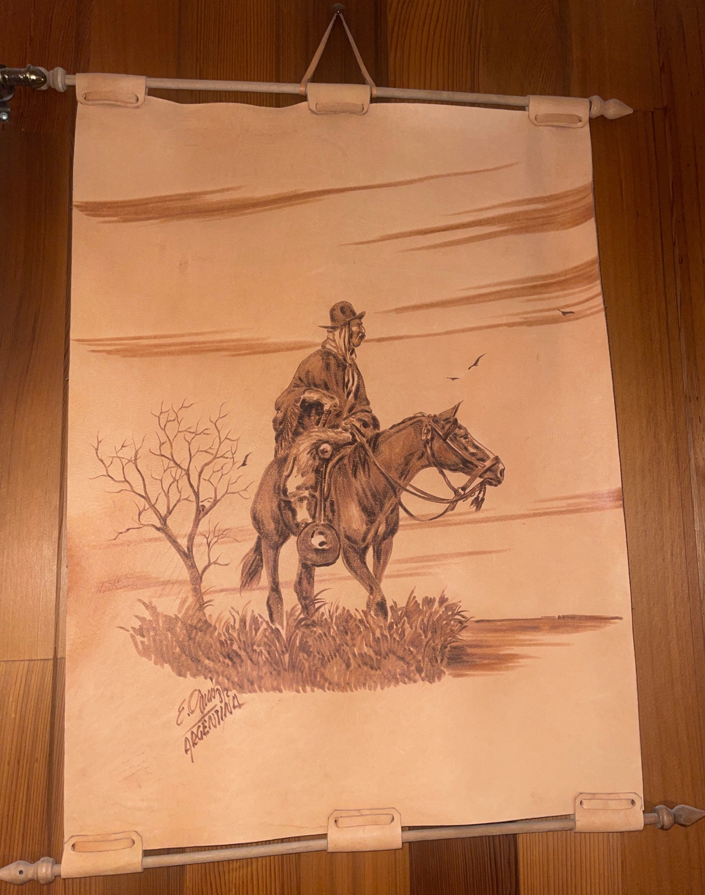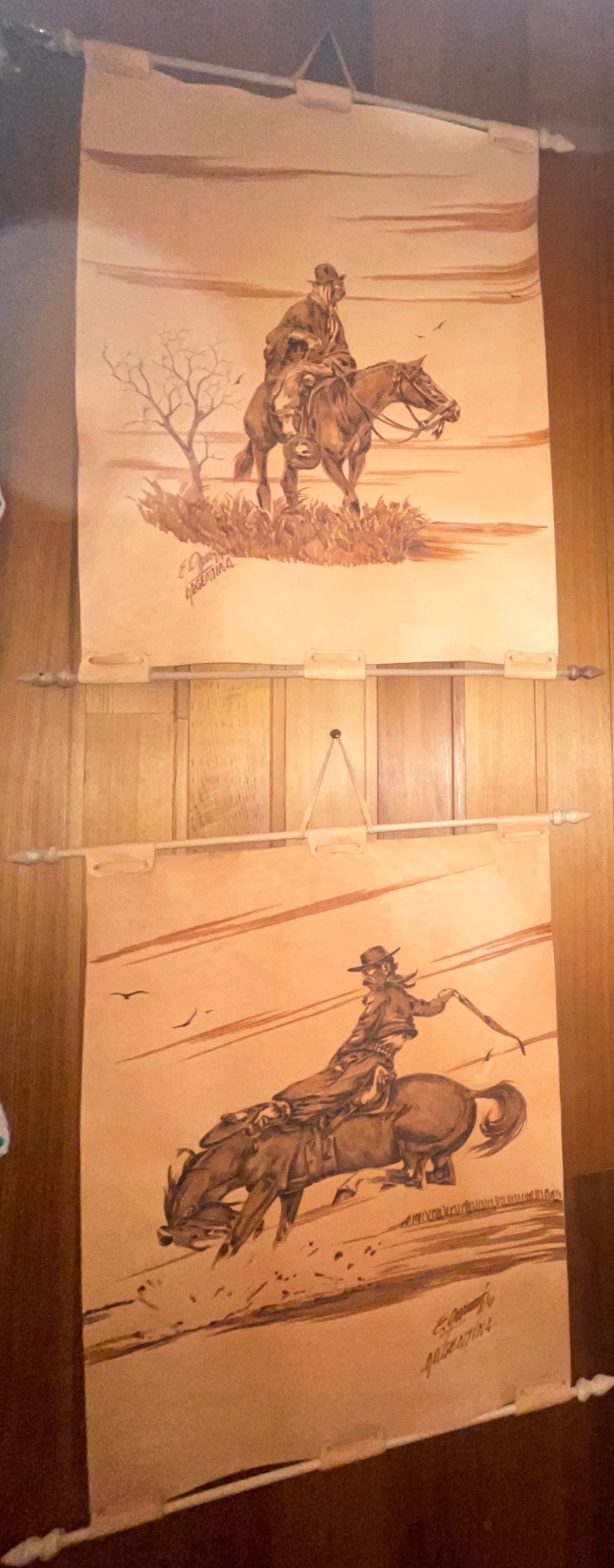 Two Etched Leather Wall Hangings Cowboys riding Horse 21"x 21" X2