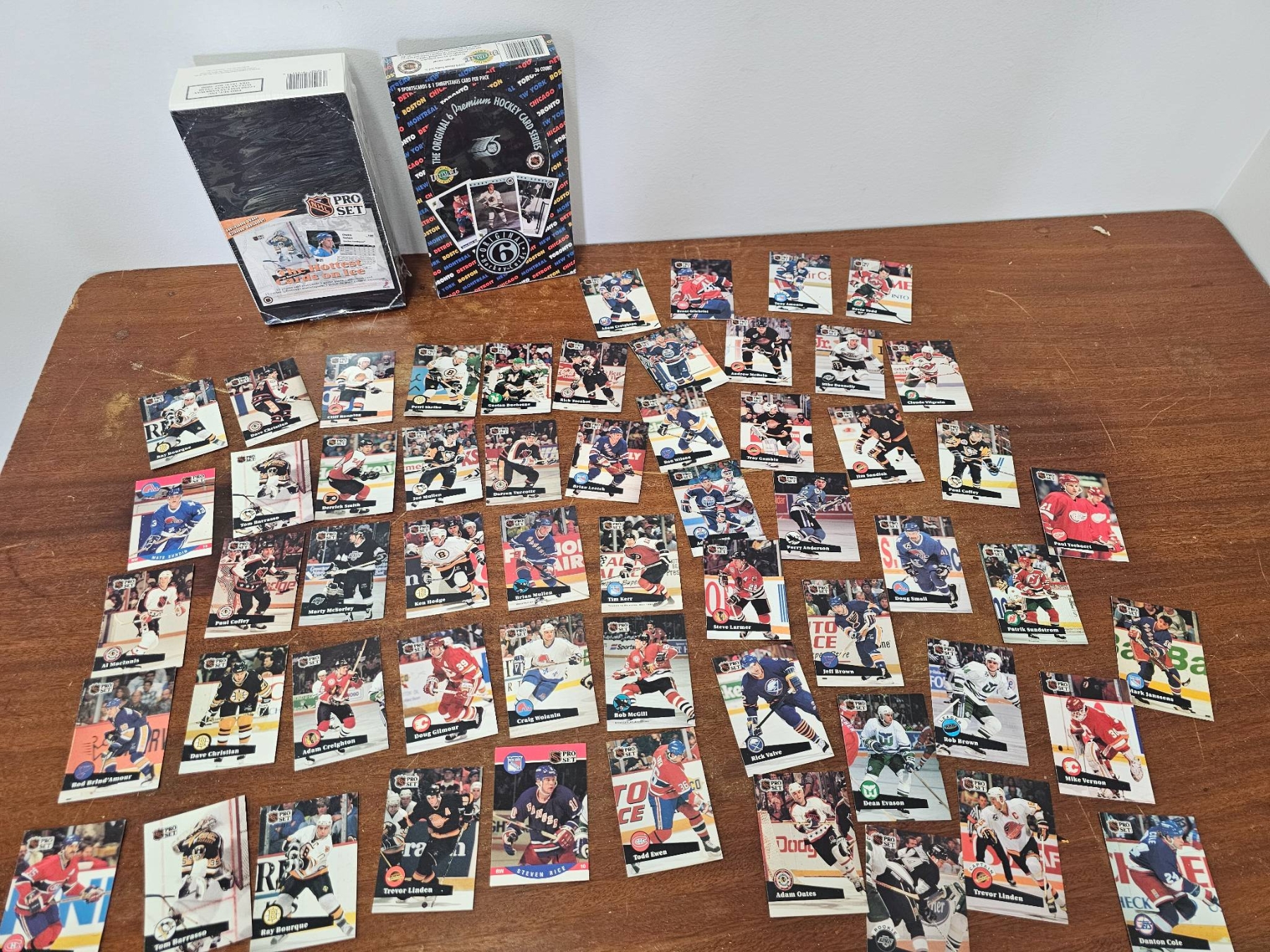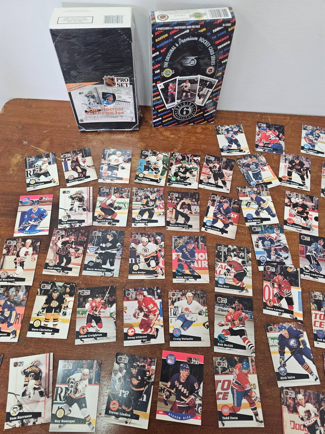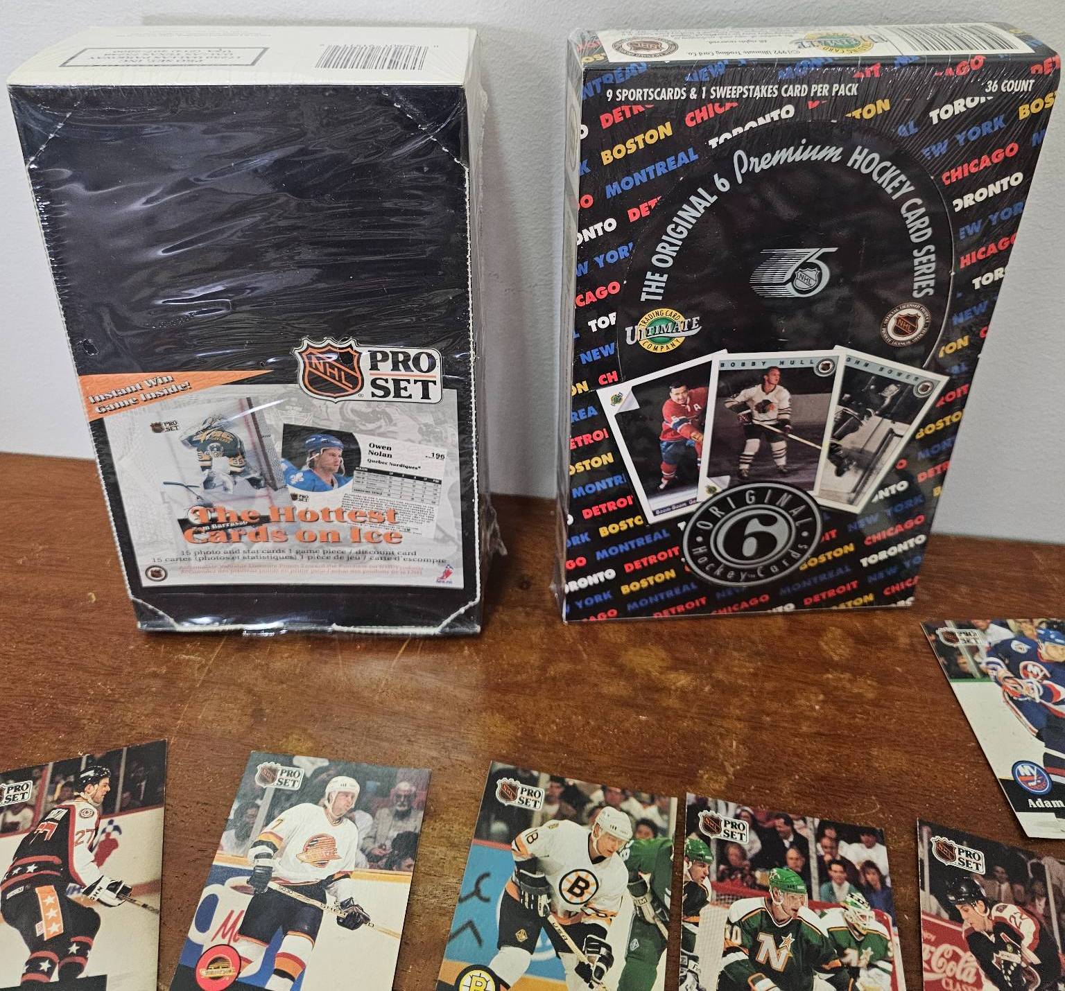 Includes two factory-sealed hockey card sets: a 1991 Pro Set Series 2 box and a 1996 Upper Deck's 'American Hockey Legends' 6th edition box. Also includes a collection of loose hockey cards featuring various players and teams. Cards are in mixed conditions, with sealed boxes presumed unopened and contents intact.