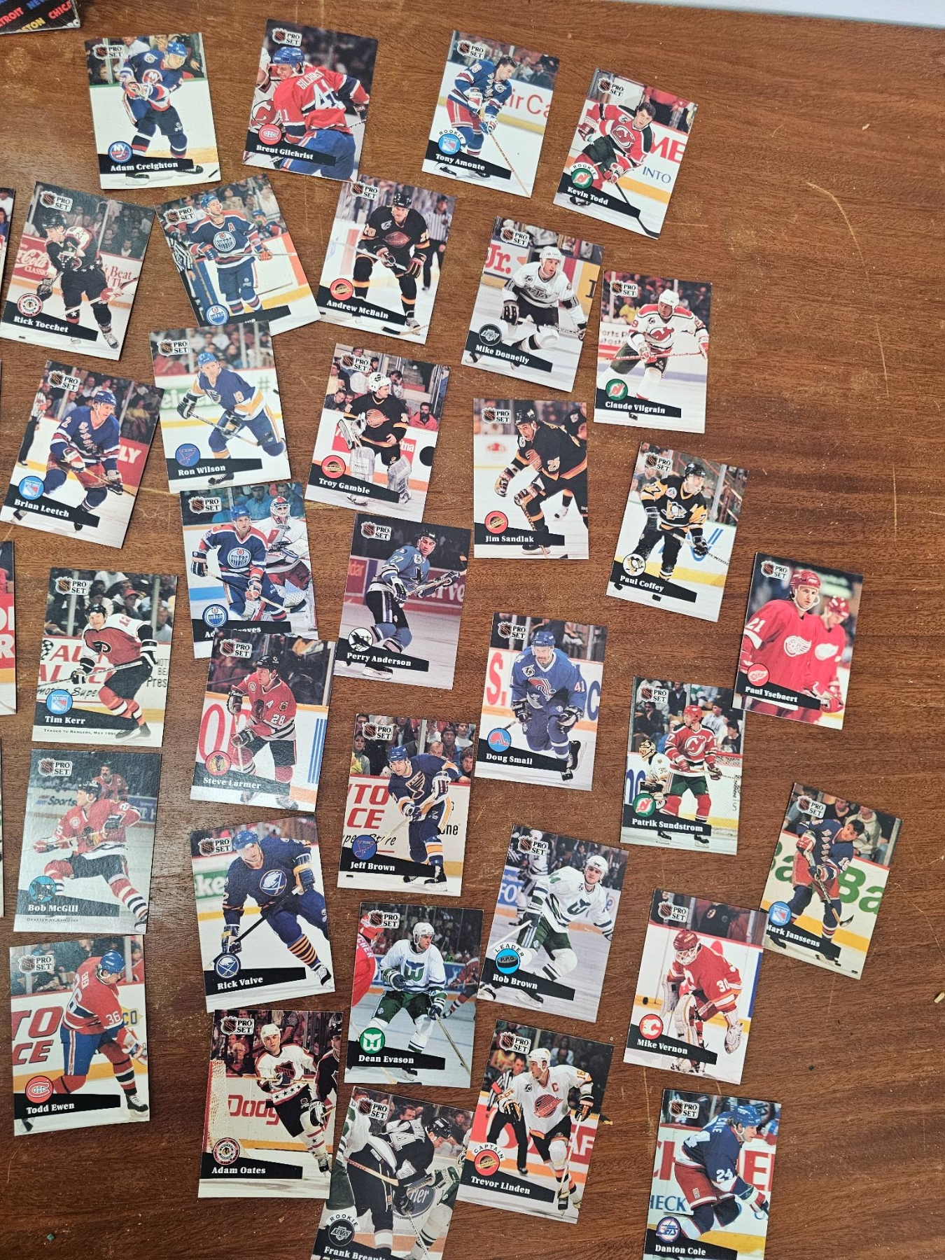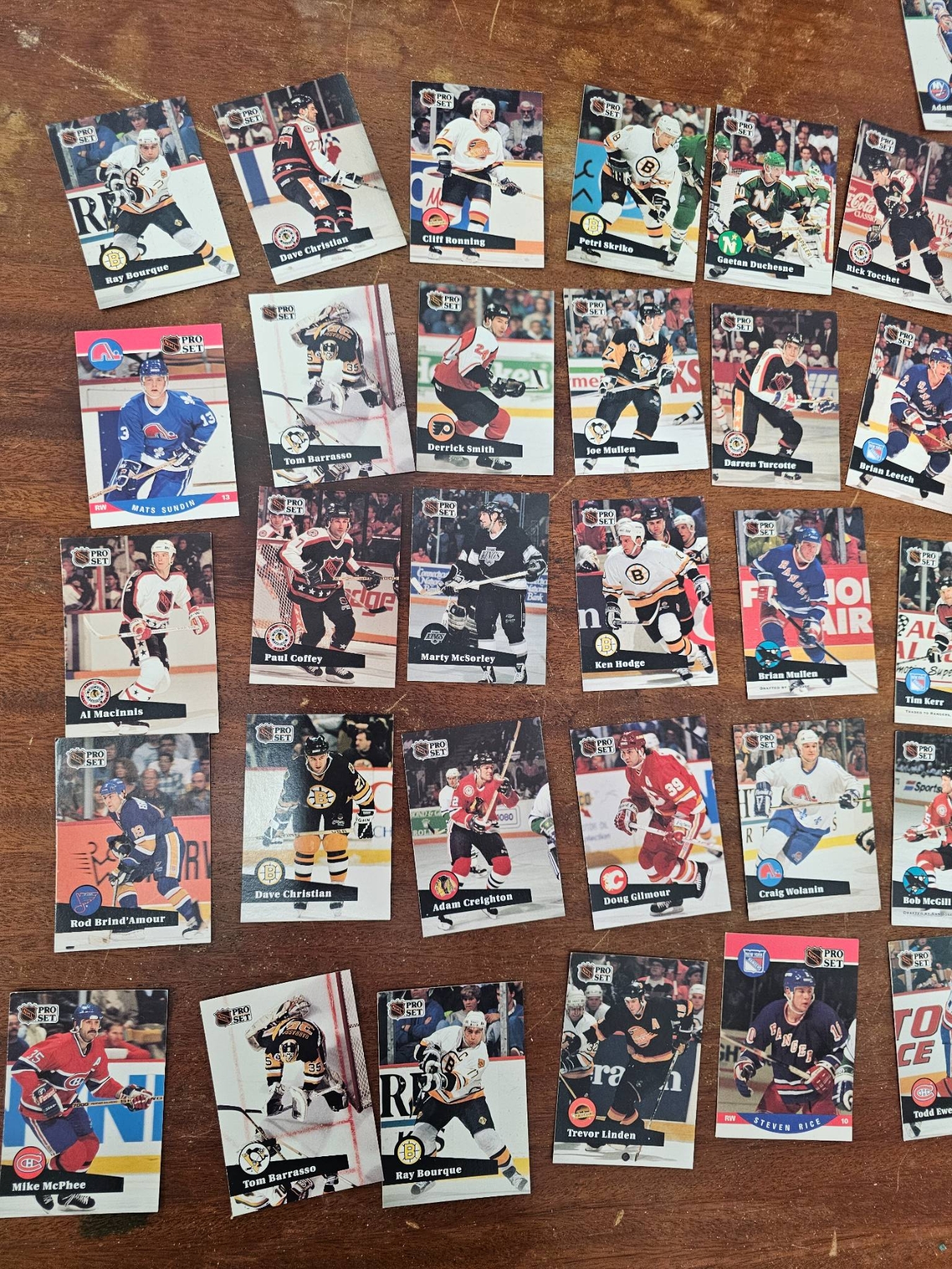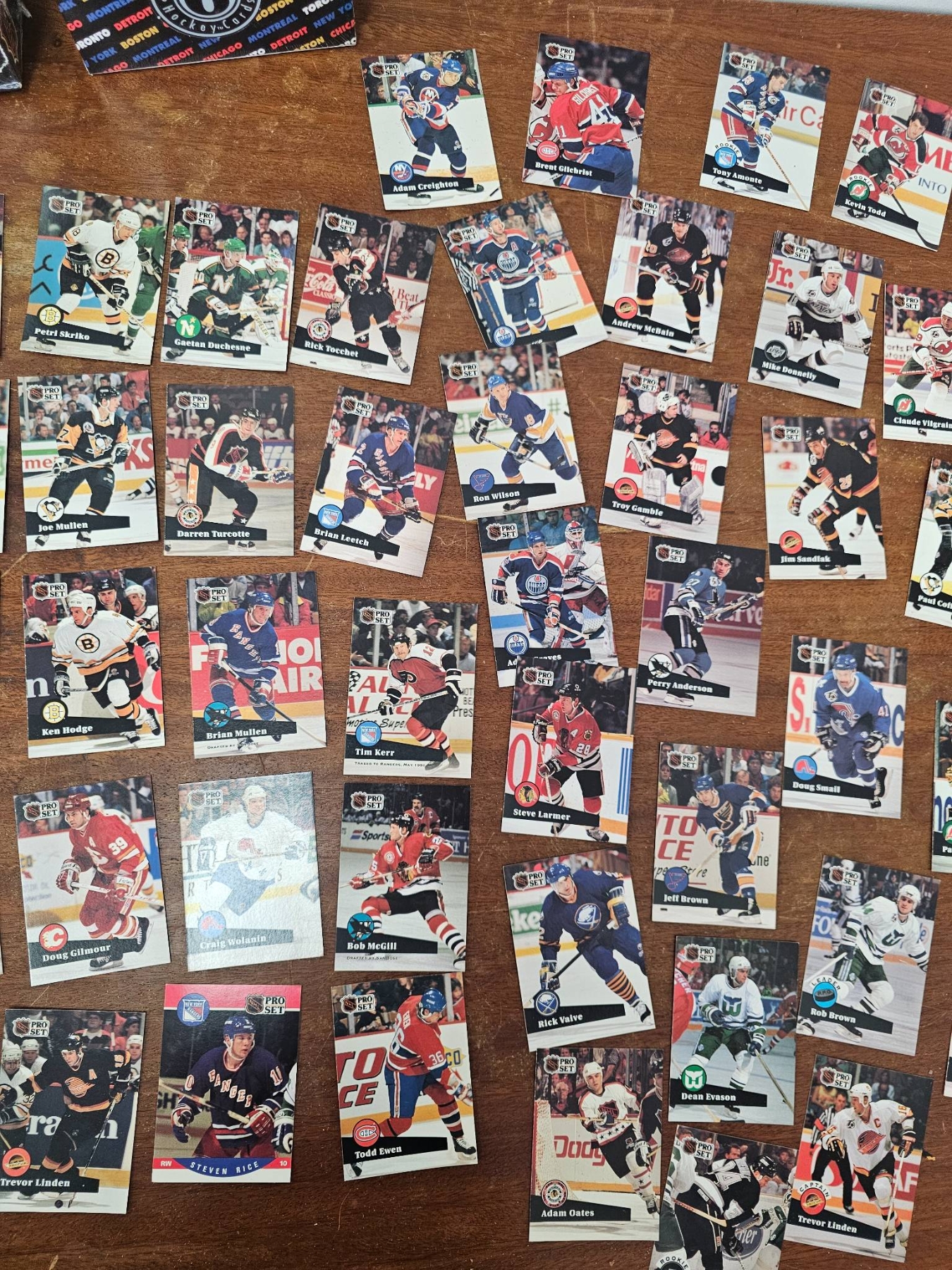 Includes two factory-sealed hockey card sets: a 1991 Pro Set Series 2 box and a 1996 Upper Deck's 'American Hockey Legends' 6th edition box. Also includes a collection of loose hockey cards featuring various players and teams. Cards are in mixed conditions, with sealed boxes presumed unopened and contents intact.