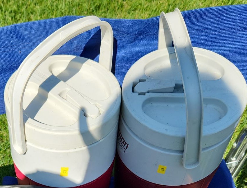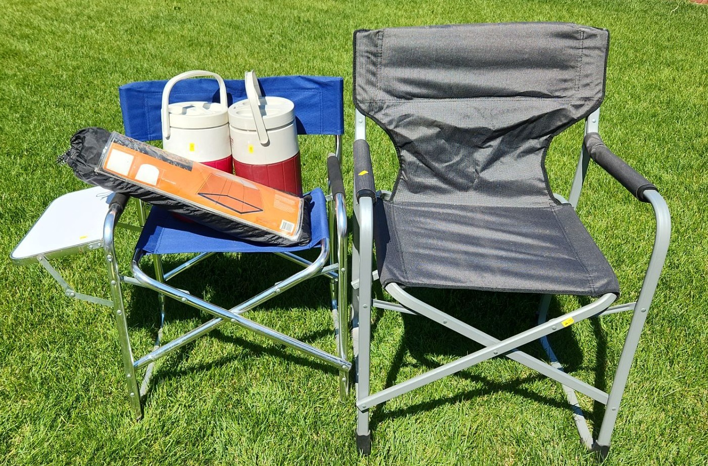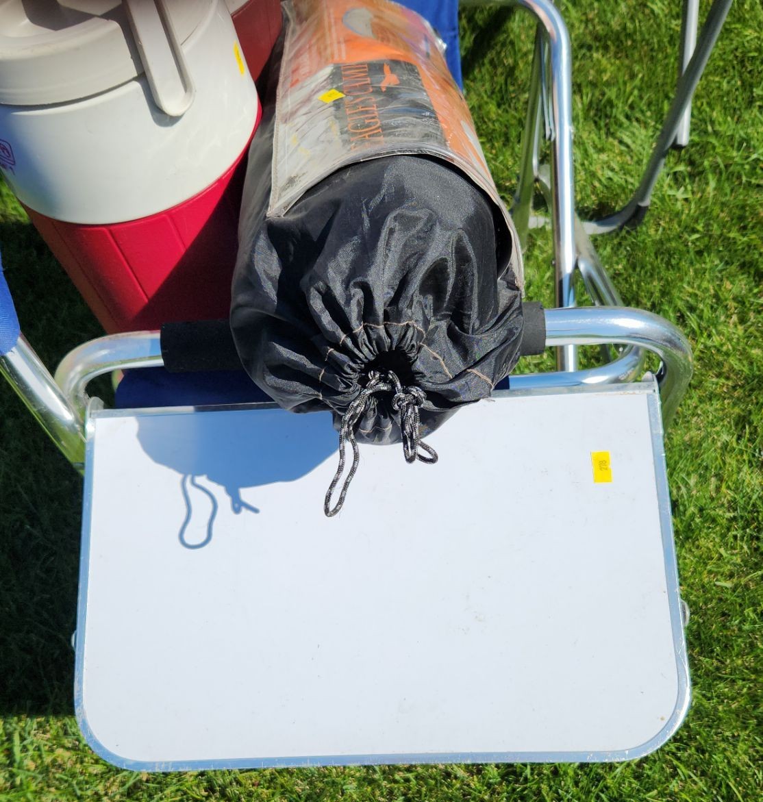 Two Folding Camp Chairs: Grey 24 W, 20 D, 36 T, Drink Coolers and Eagle's Camp 8 X 8 Screen House