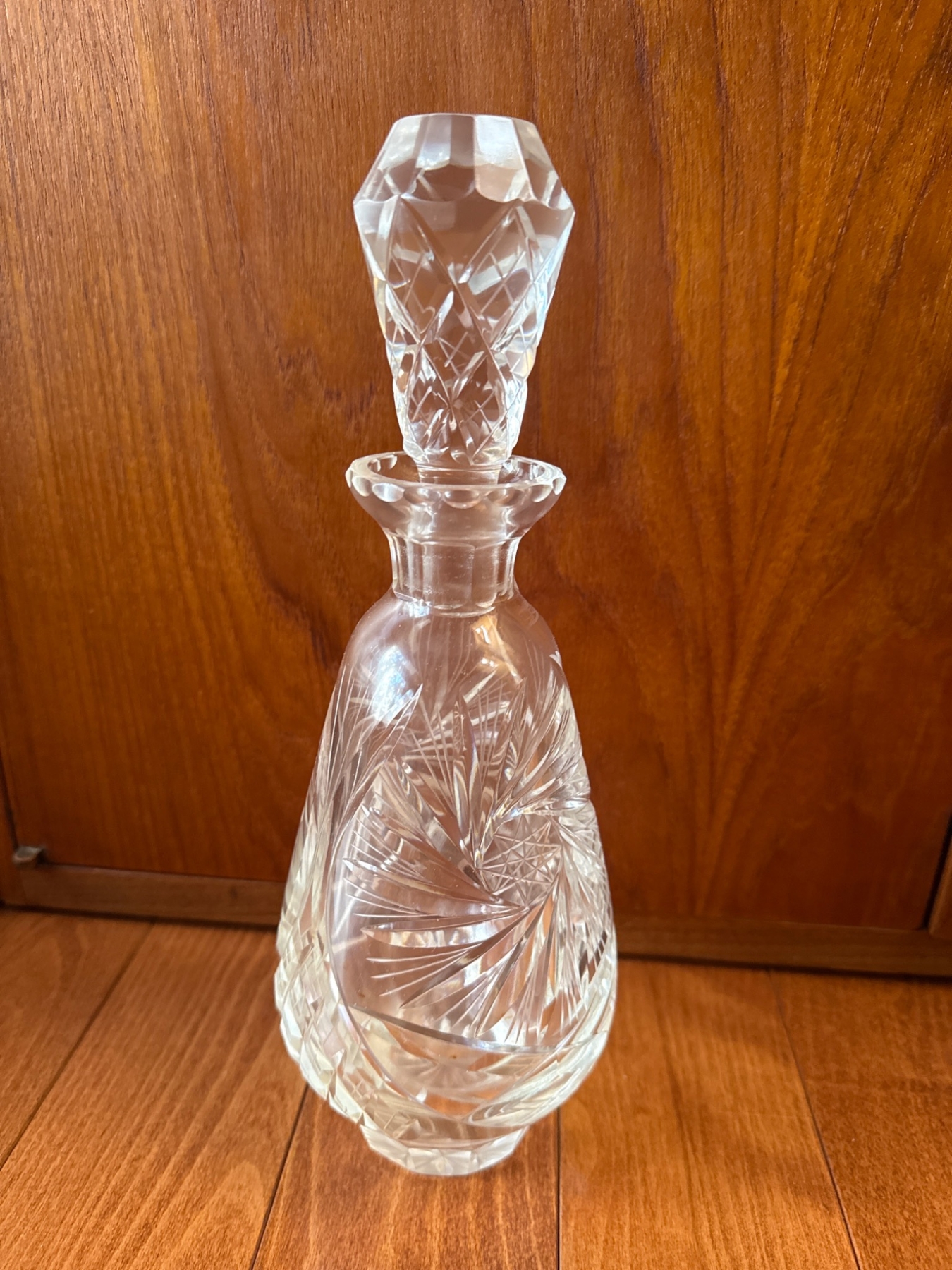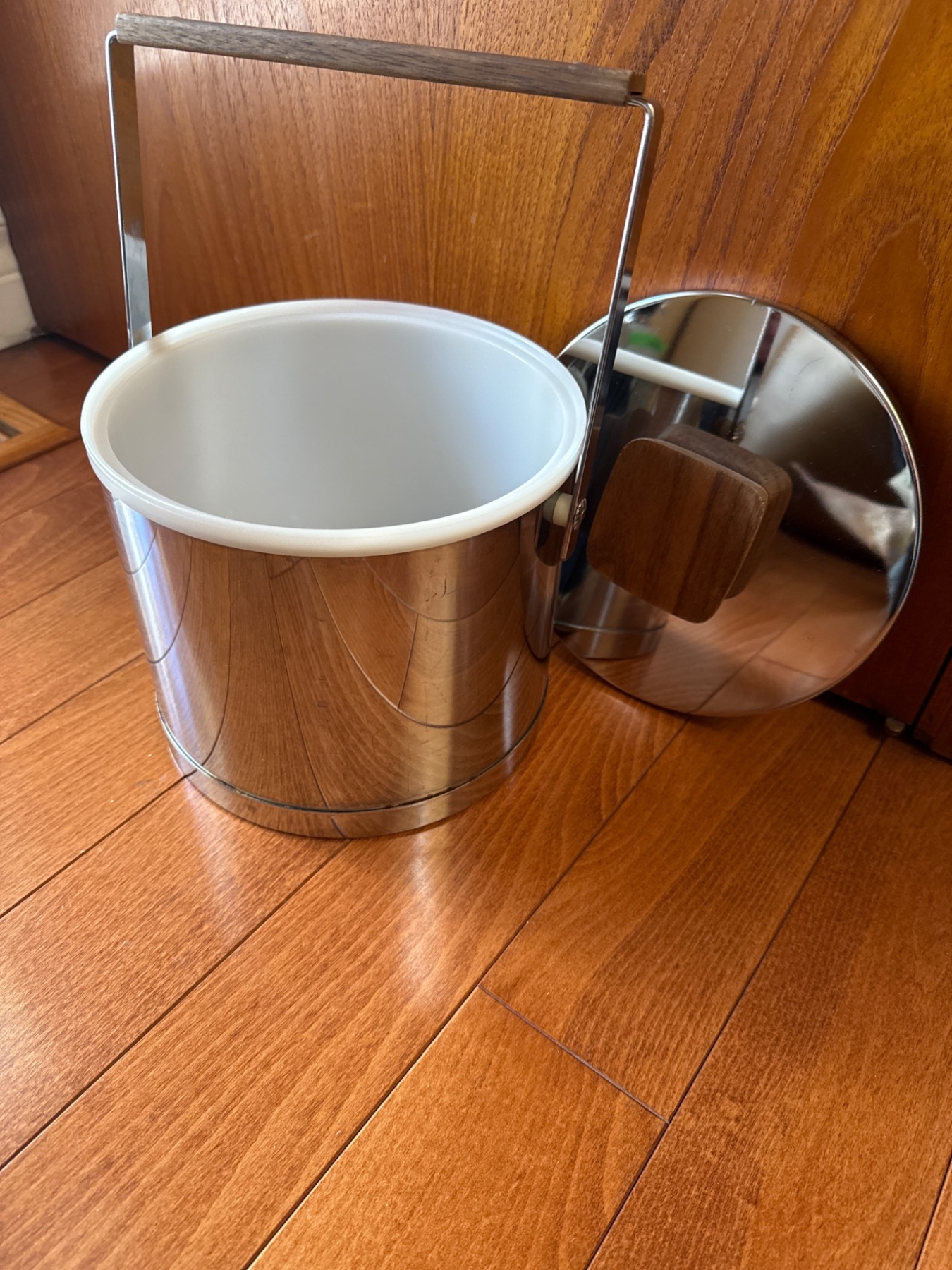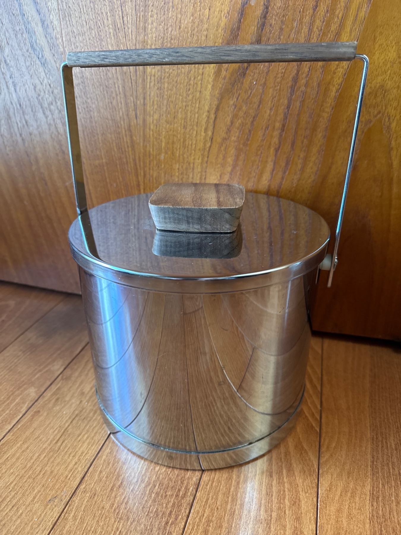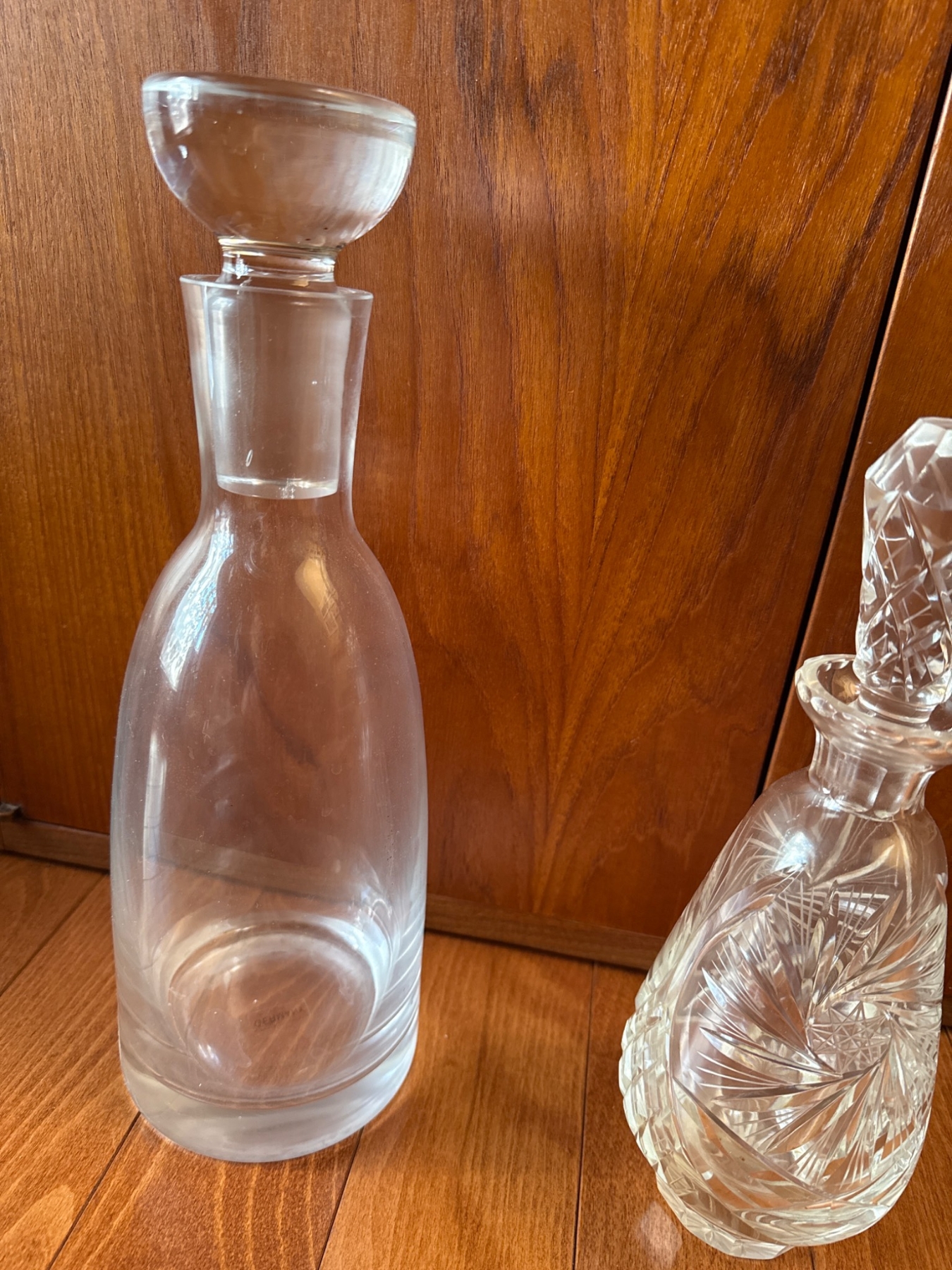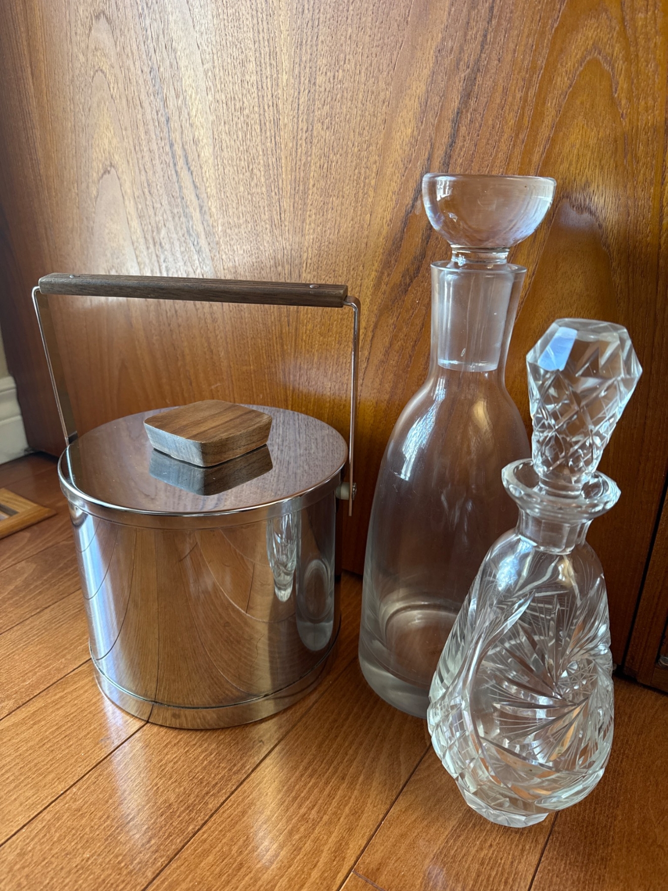 Includes two glass decanters and a stainless steel ice bucket. The lead crystal decanter (approx. 10.5in H) features intricate cuts and a faceted stopper. The frosted glass decanter (approx. 10in H) includes an integrated cup. Ice bucket (approx. 7in H x 6in Dia) is stainless steel with a wood-handled lid and swinging handle. Light surface wear is visible on all items, consistent with use.