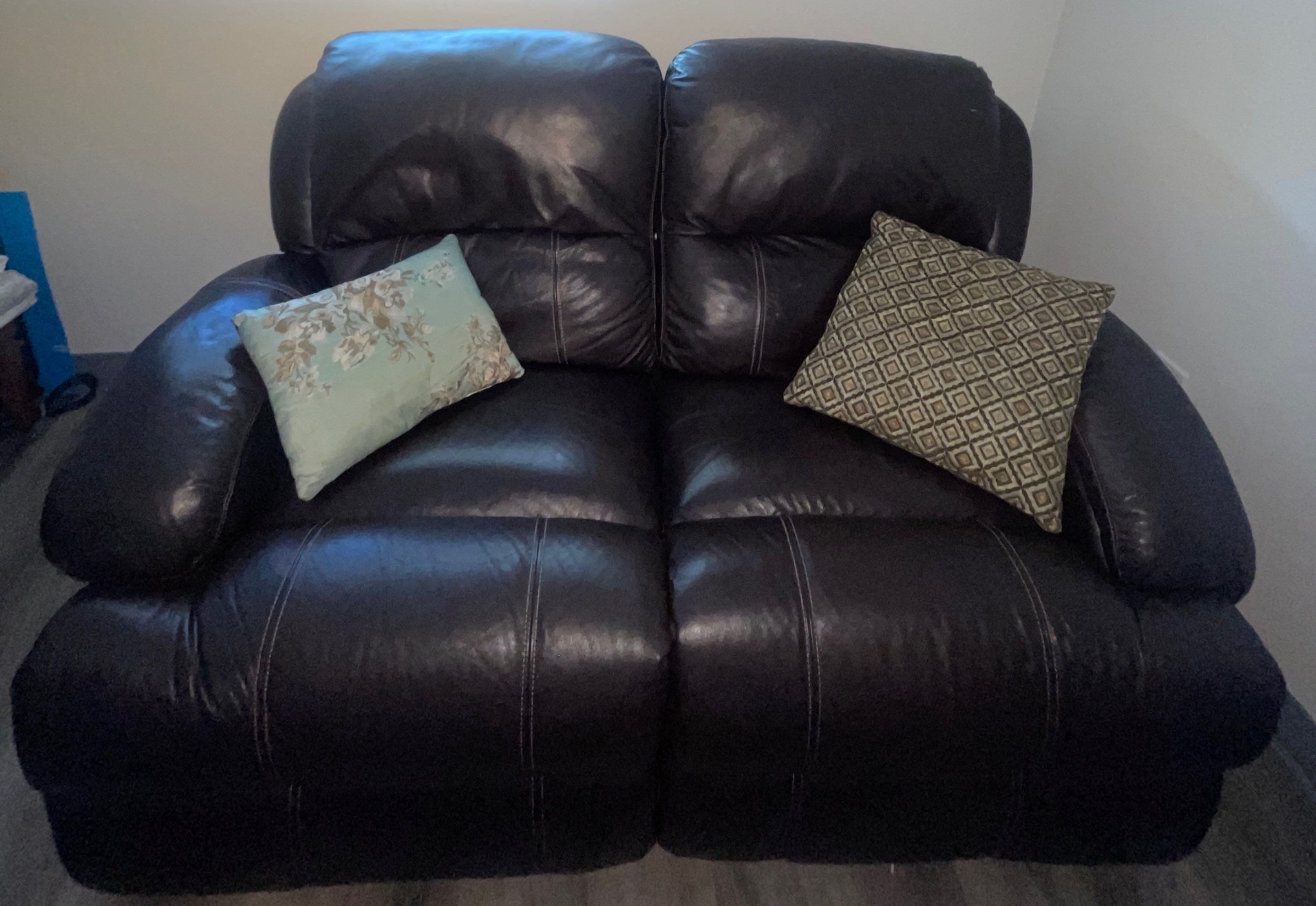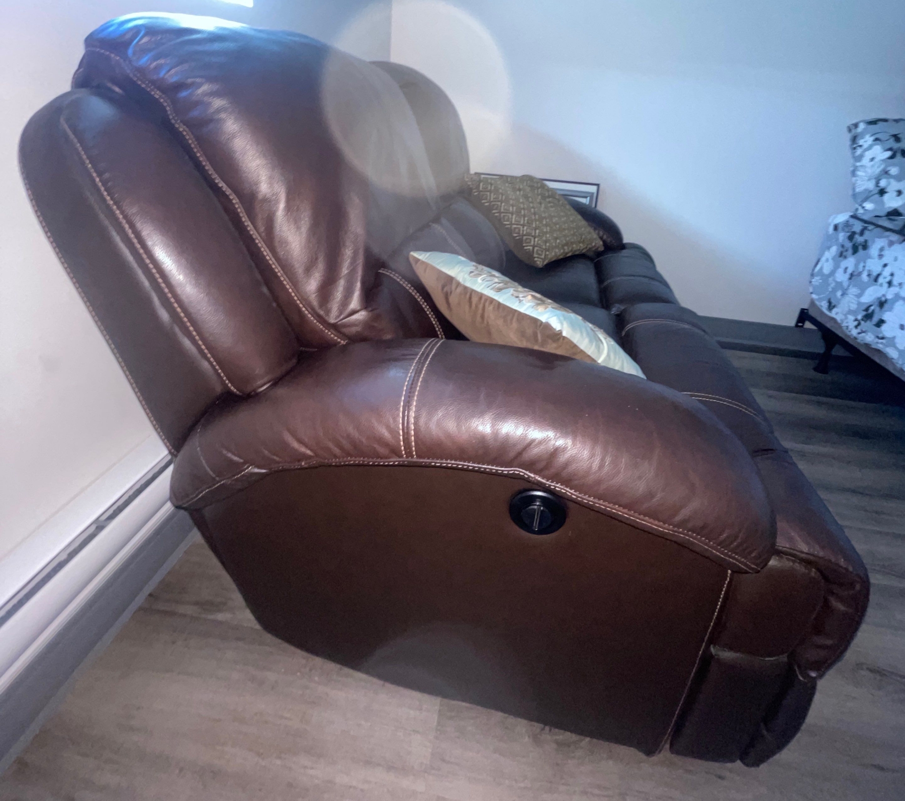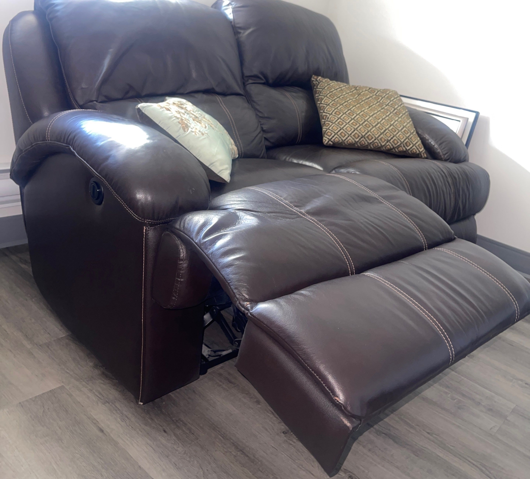 Two Seater Leon's Brown Leather Reclining Loveseat w/Cushions 67"w x 44"d x 37"tall