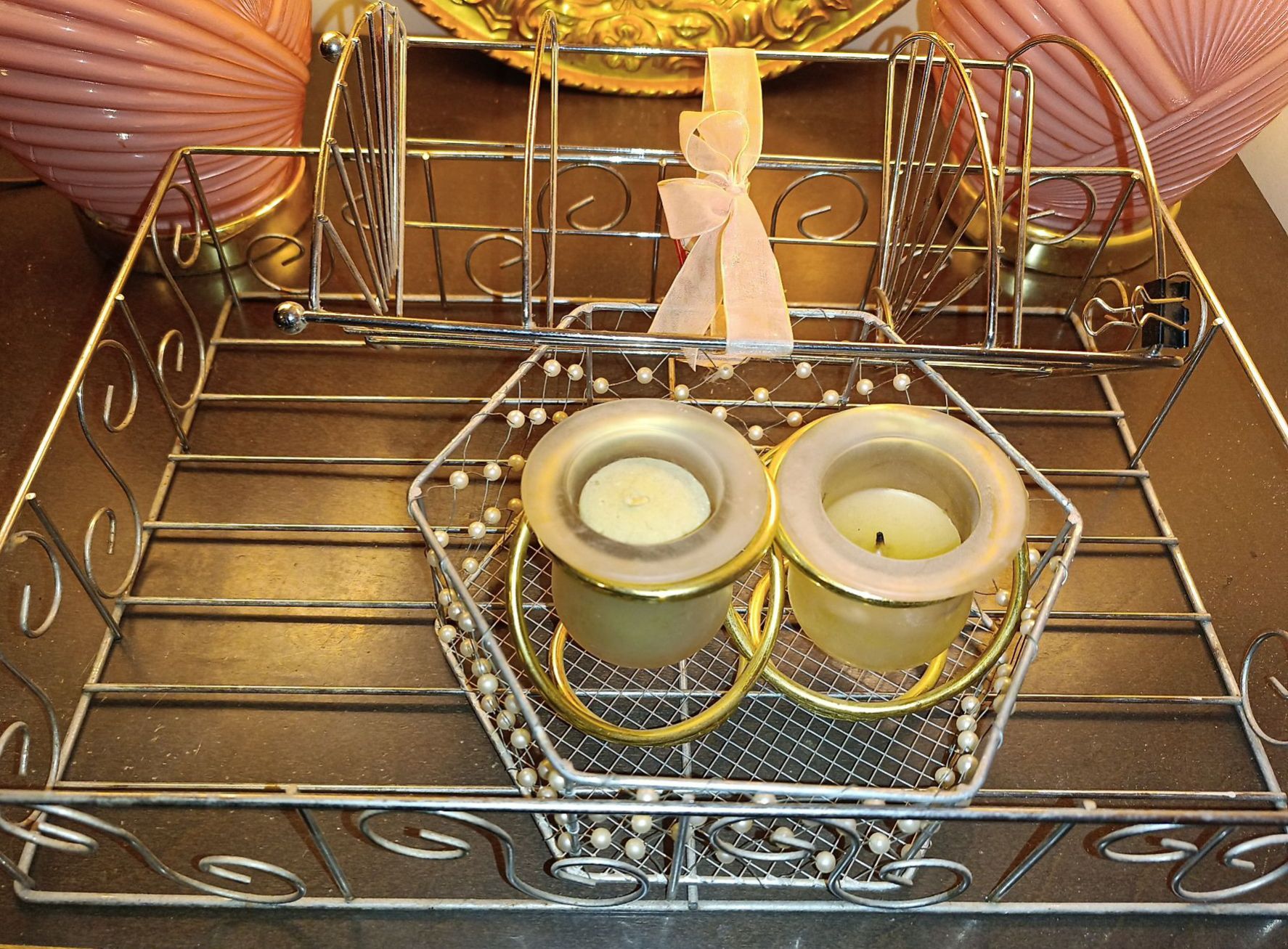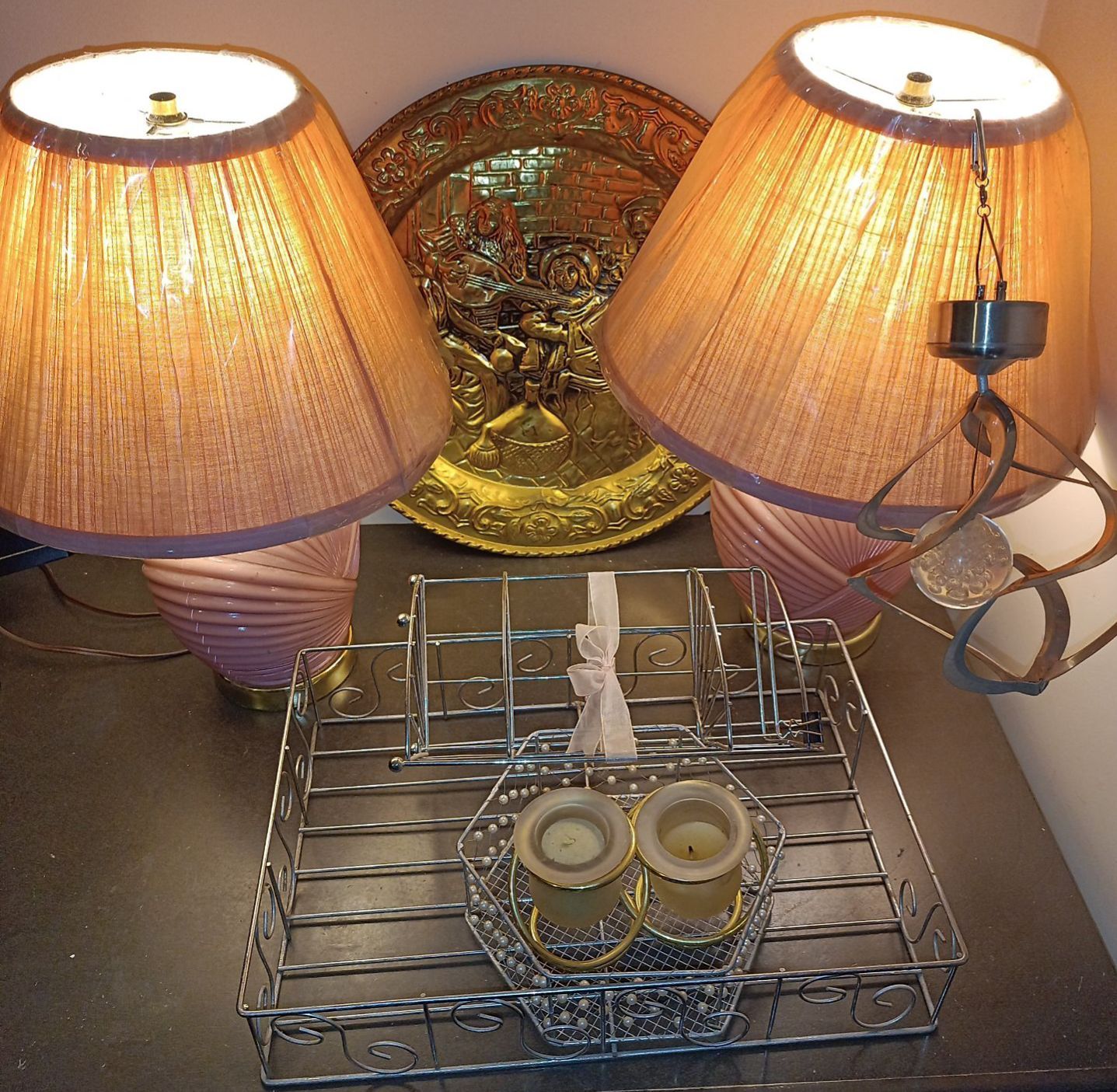 Two Vintage Pink Lamps w/ Brass Wall Hanging Candles & Baskets