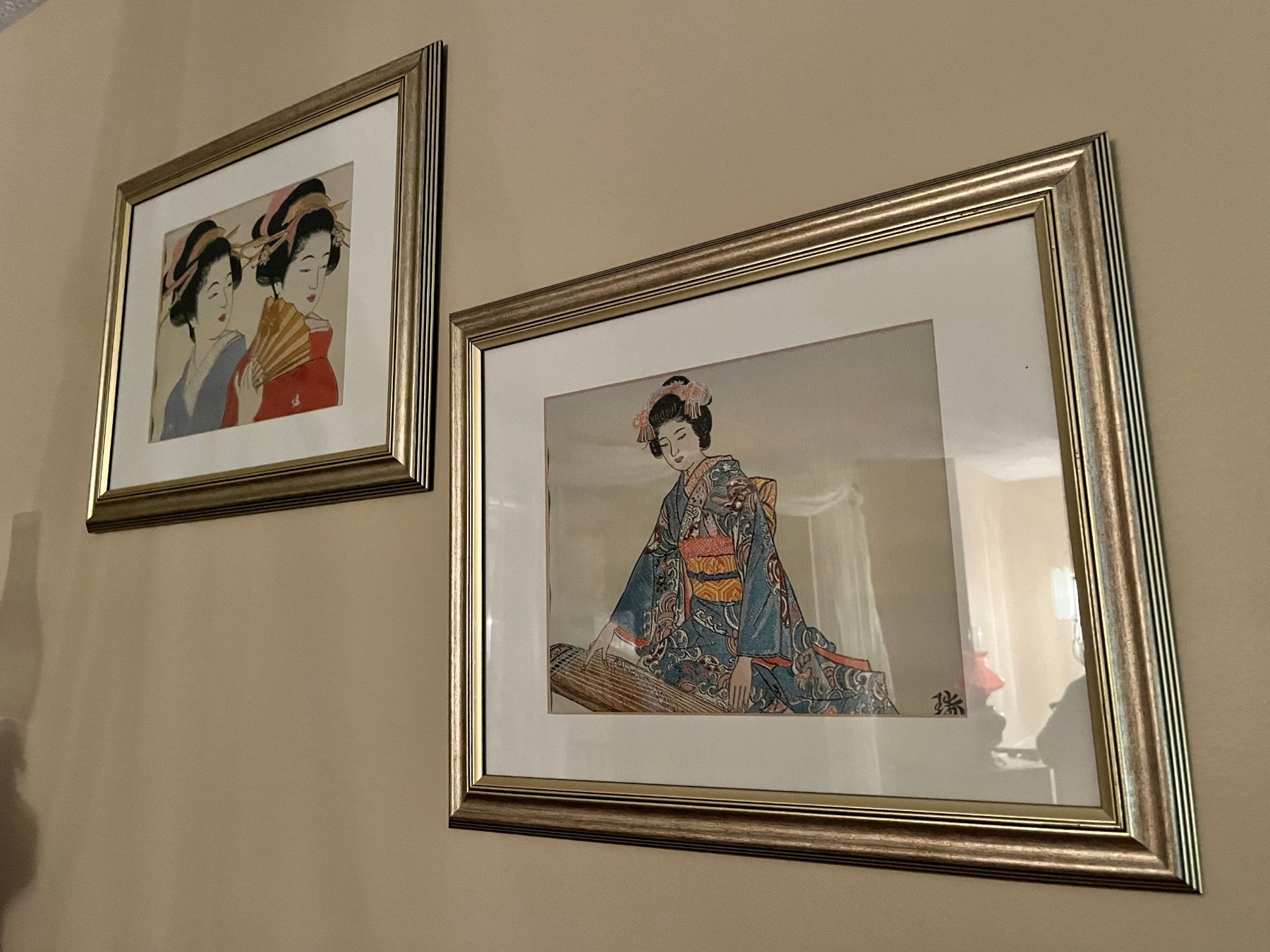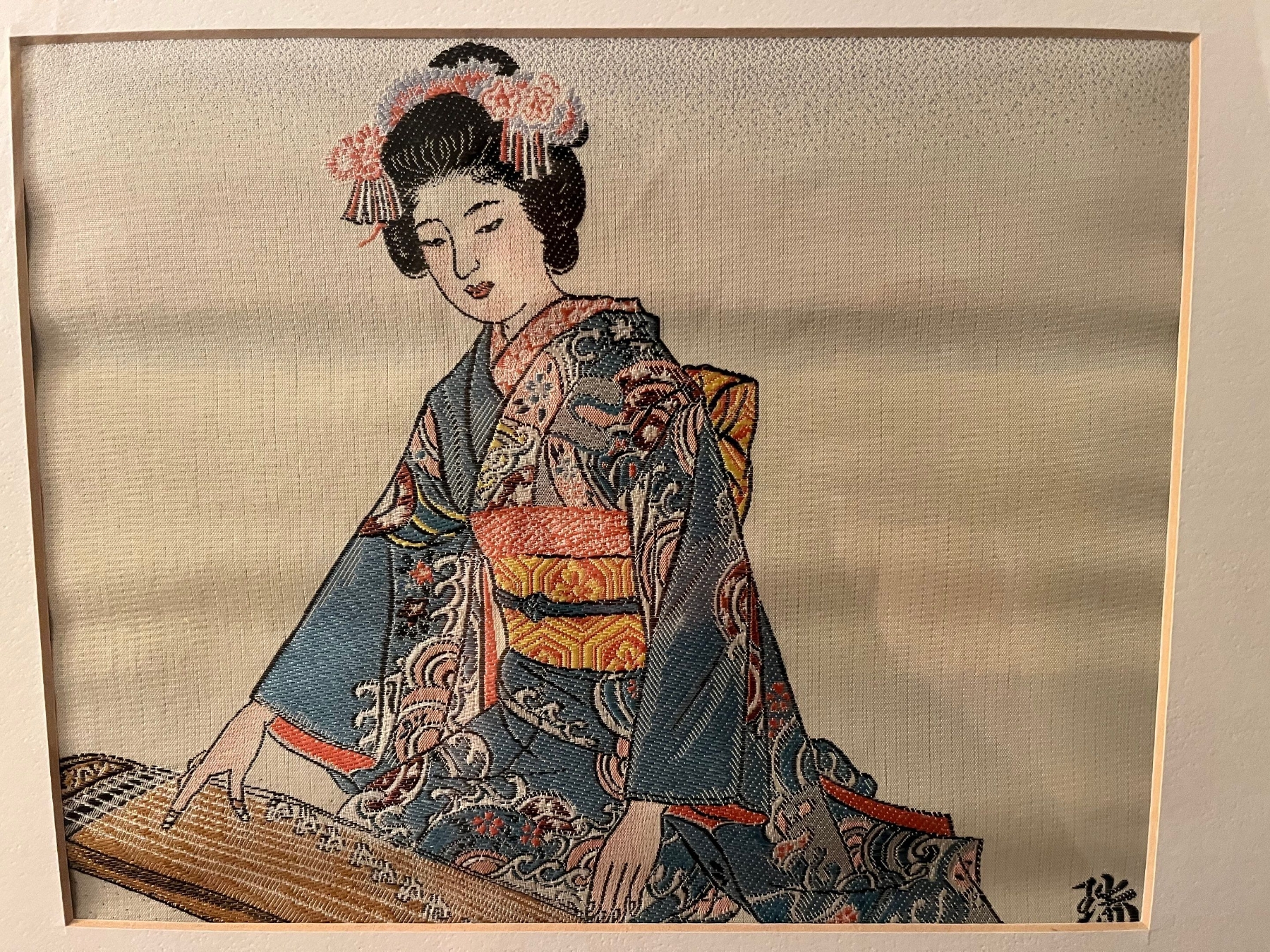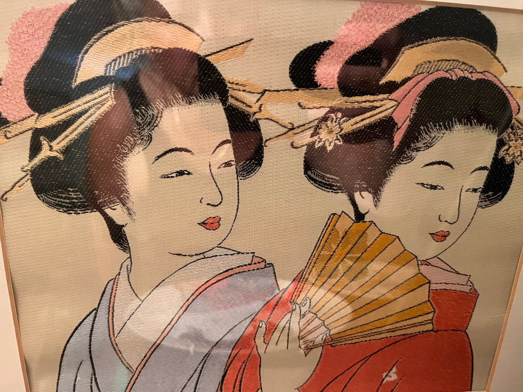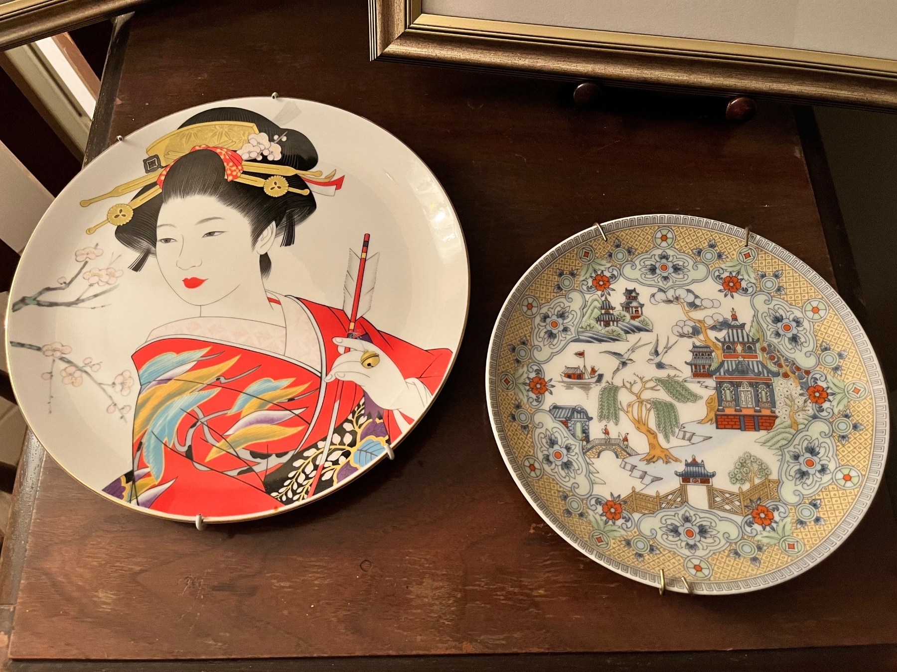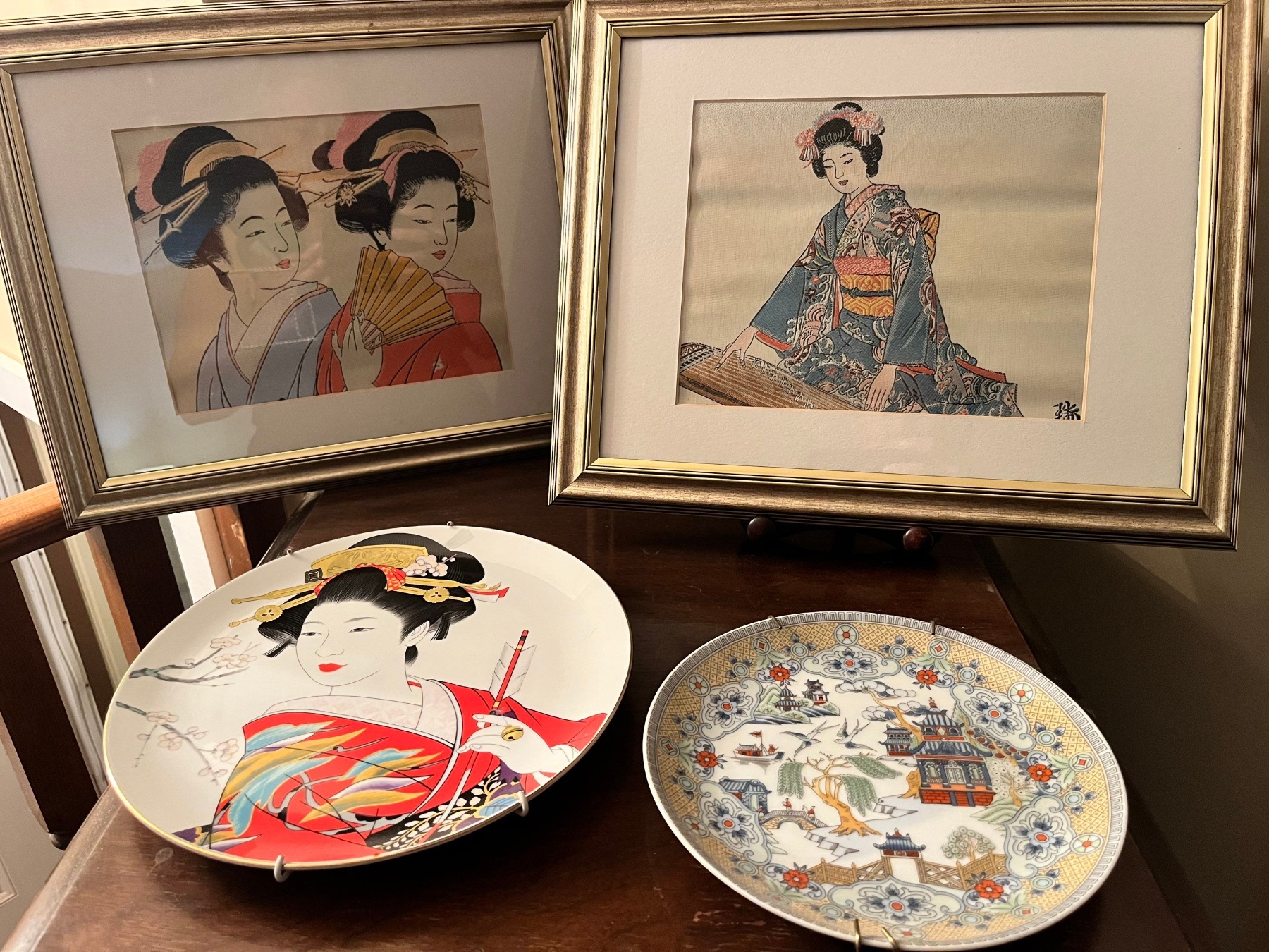 Two beautiful cross stitched Asian themed silk pictures with collectors plate