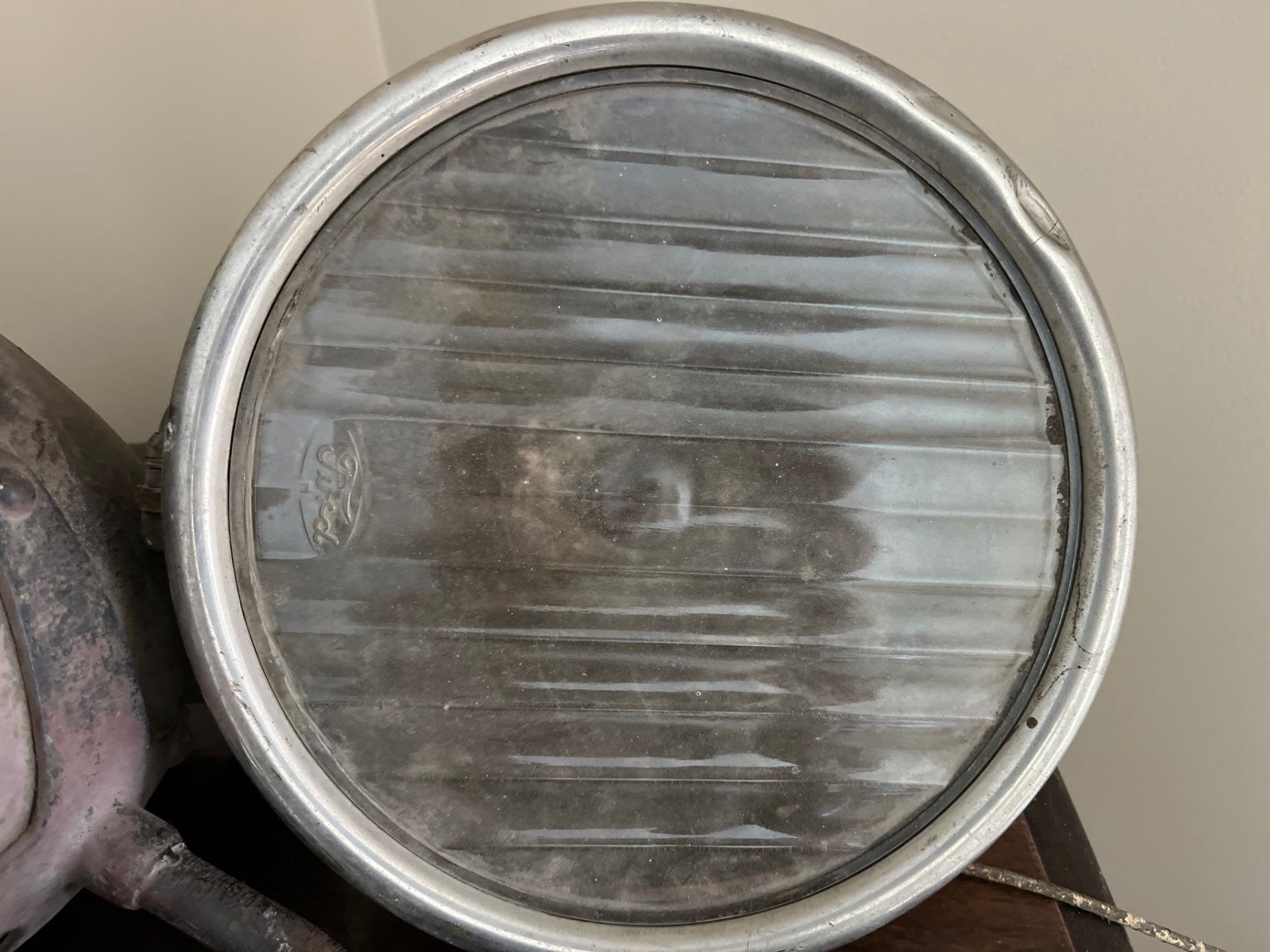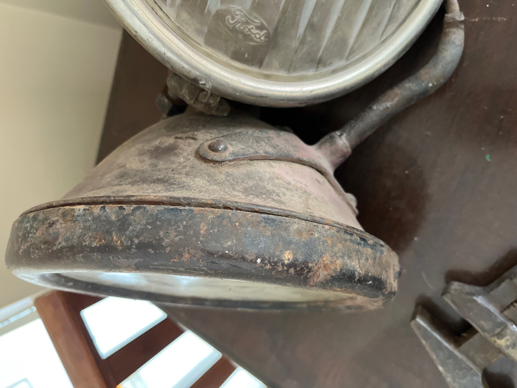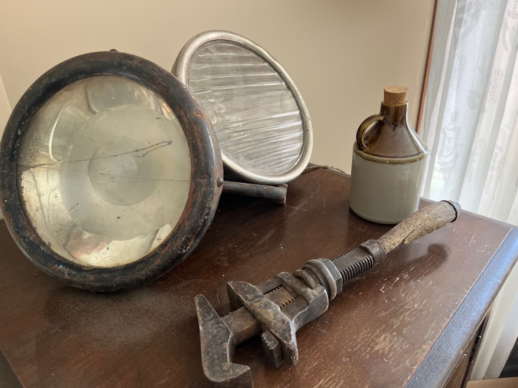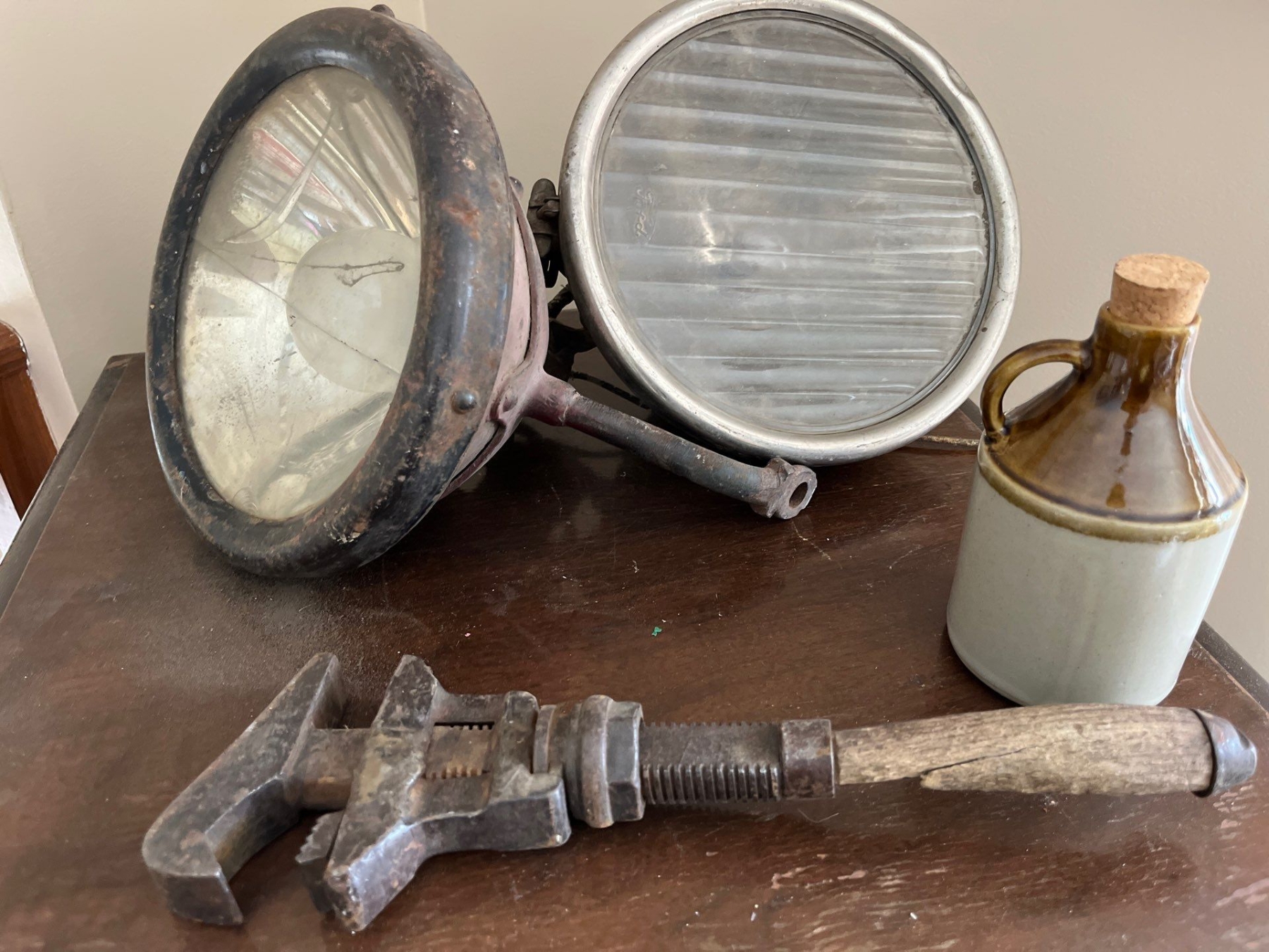 Two large brass and stainless steel headlamps possibly from Ford model A’s along with the vintage antique small whiskey, jug and a vintage pipe wrench