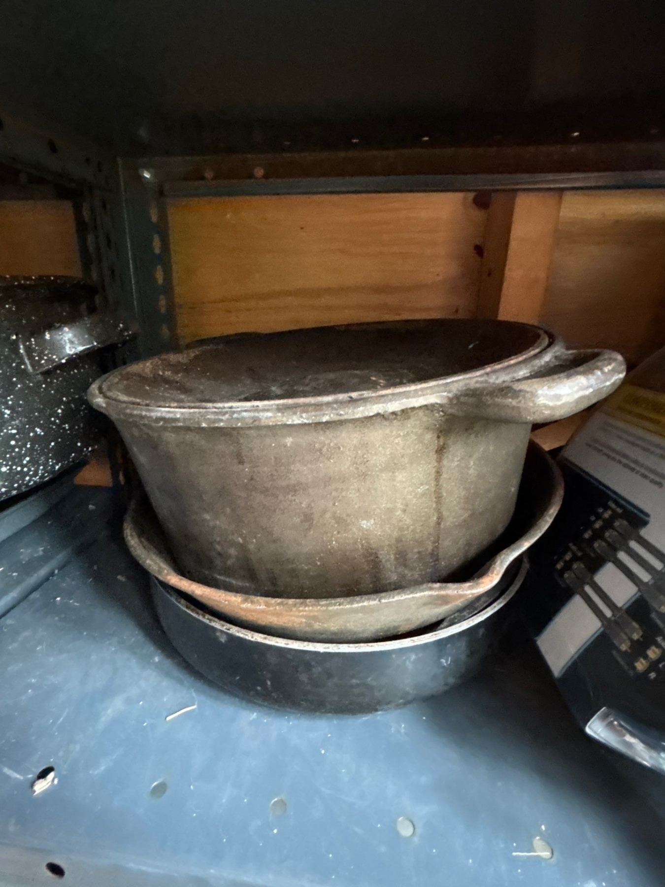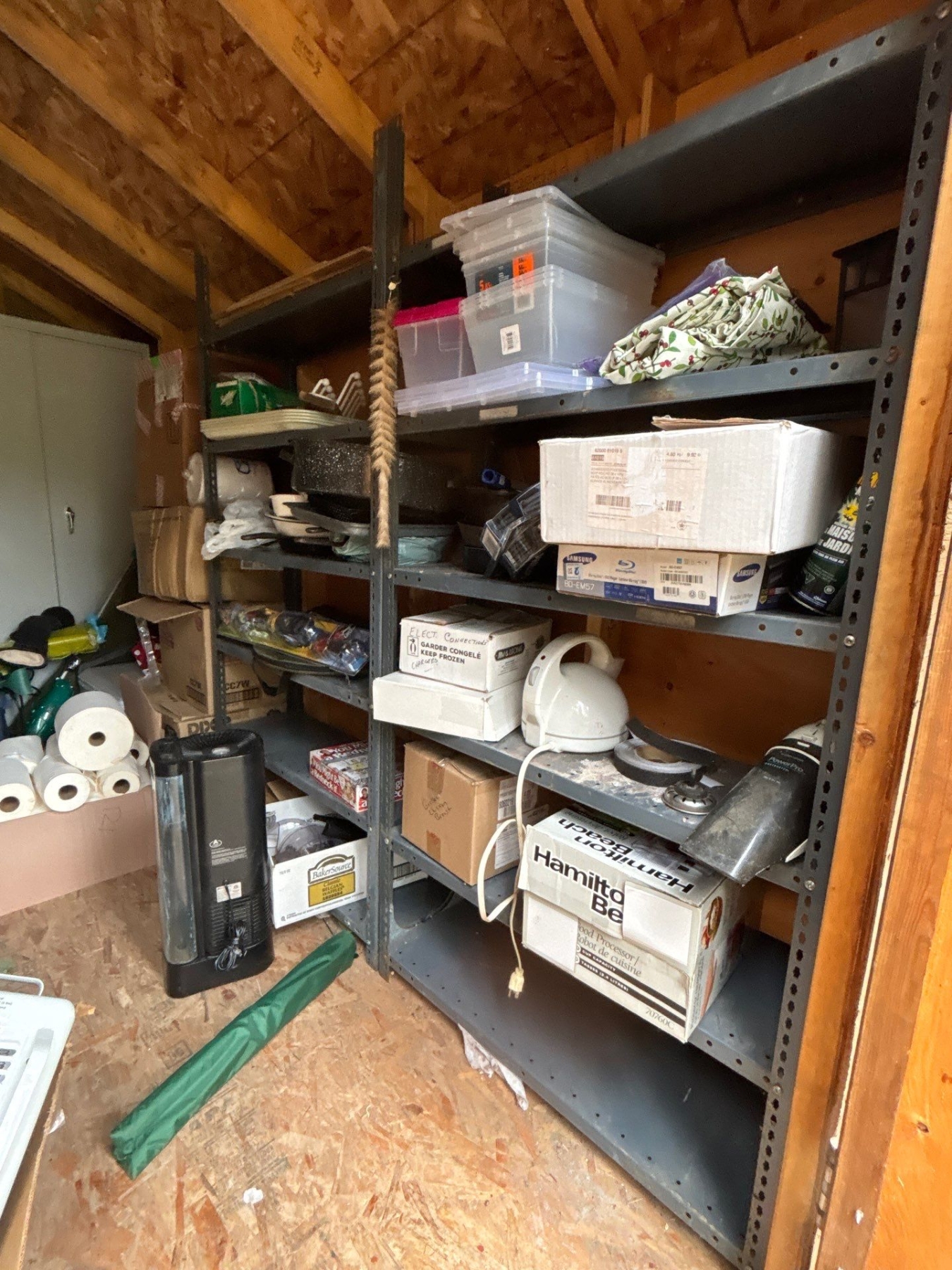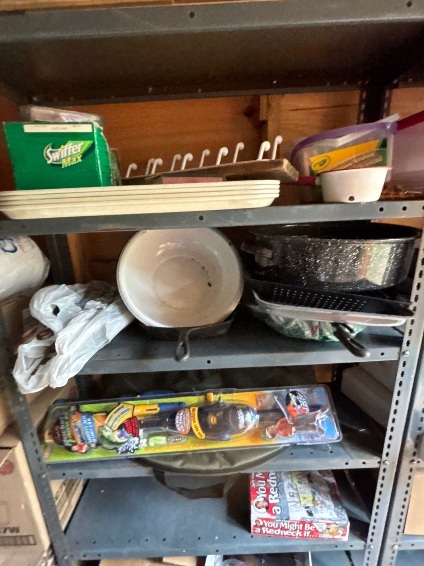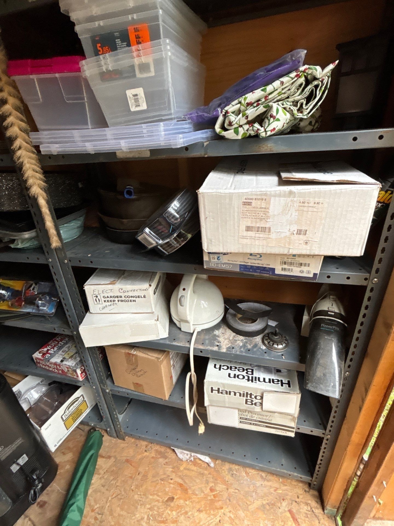 Two metal shelves with contents, kitchen supplies, vacuum several small bins, enamel cookware, kids,