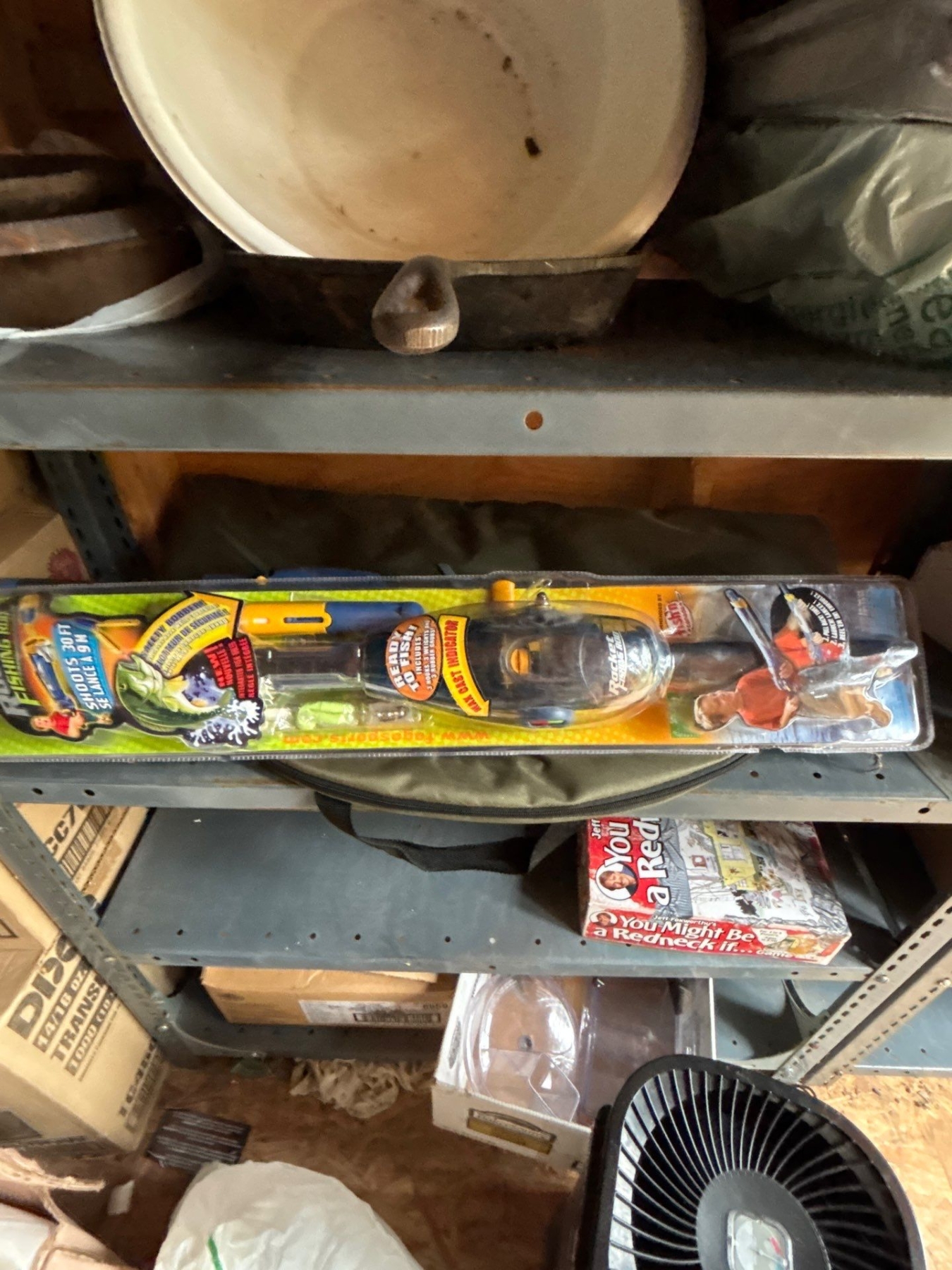 Two metal shelves with contents, kitchen supplies, vacuum several small bins, enamel cookware, kids, fishing rod, food processor, and humidifier