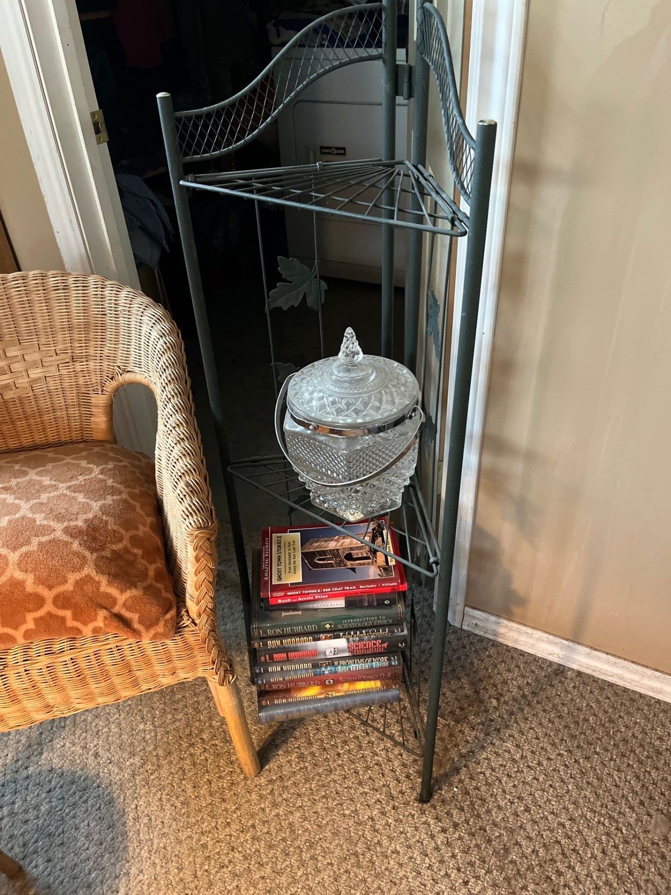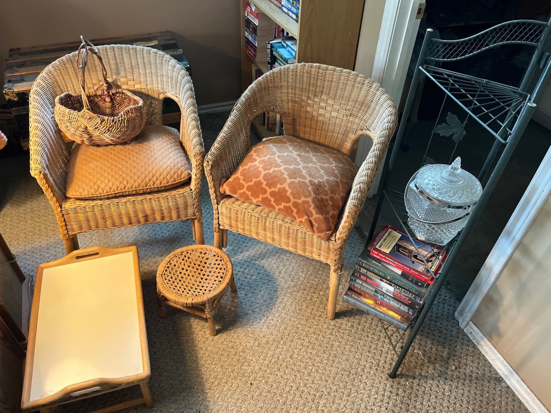 Two vintage wicker chairs with a TV tray, a small wicker foot rest and two wicker baskets and a lovely wire stand with a beautiful glass ice chest