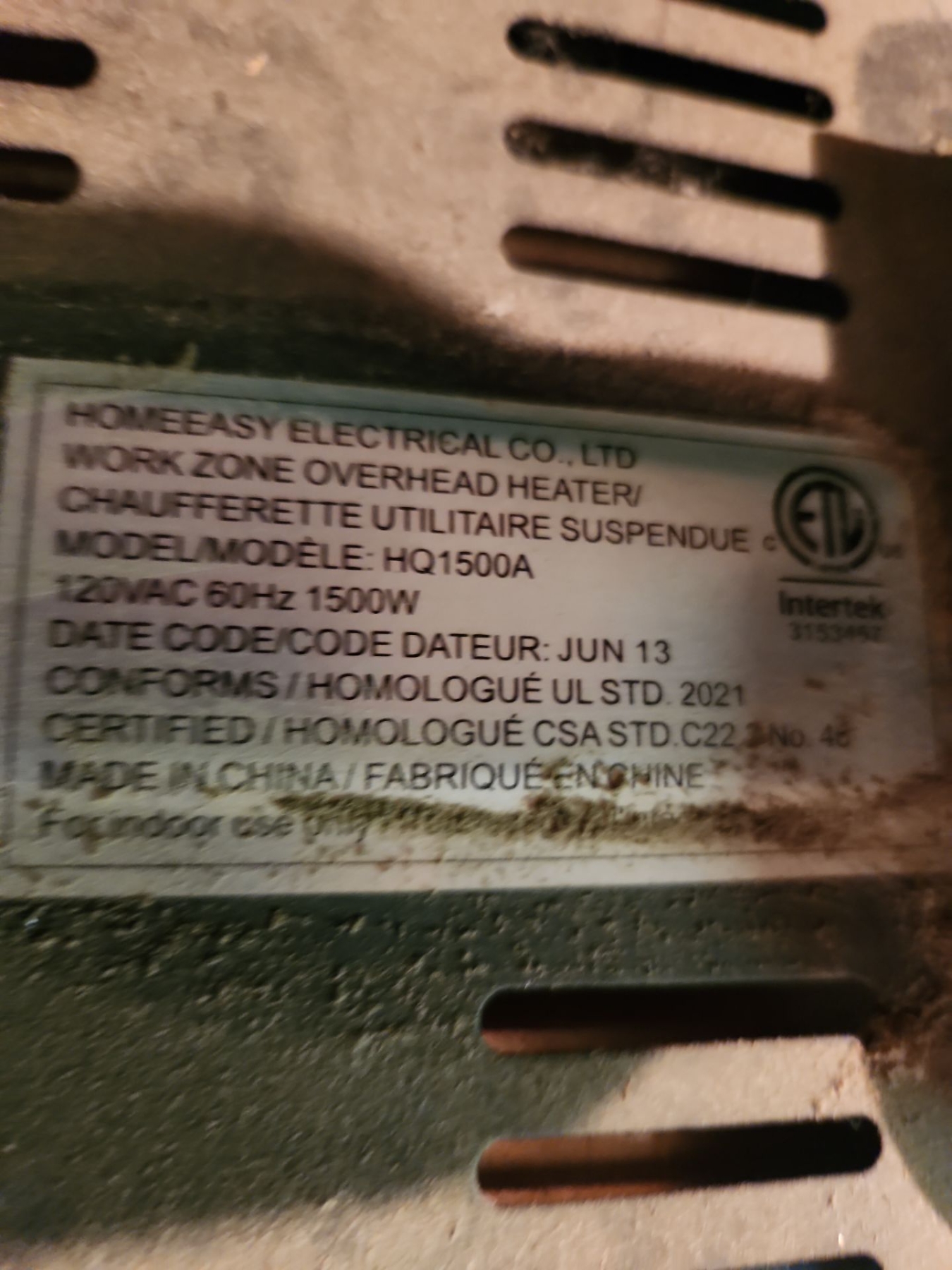 Uberhaus Overhead Garage Heater Home Easy Model HQ1500 A