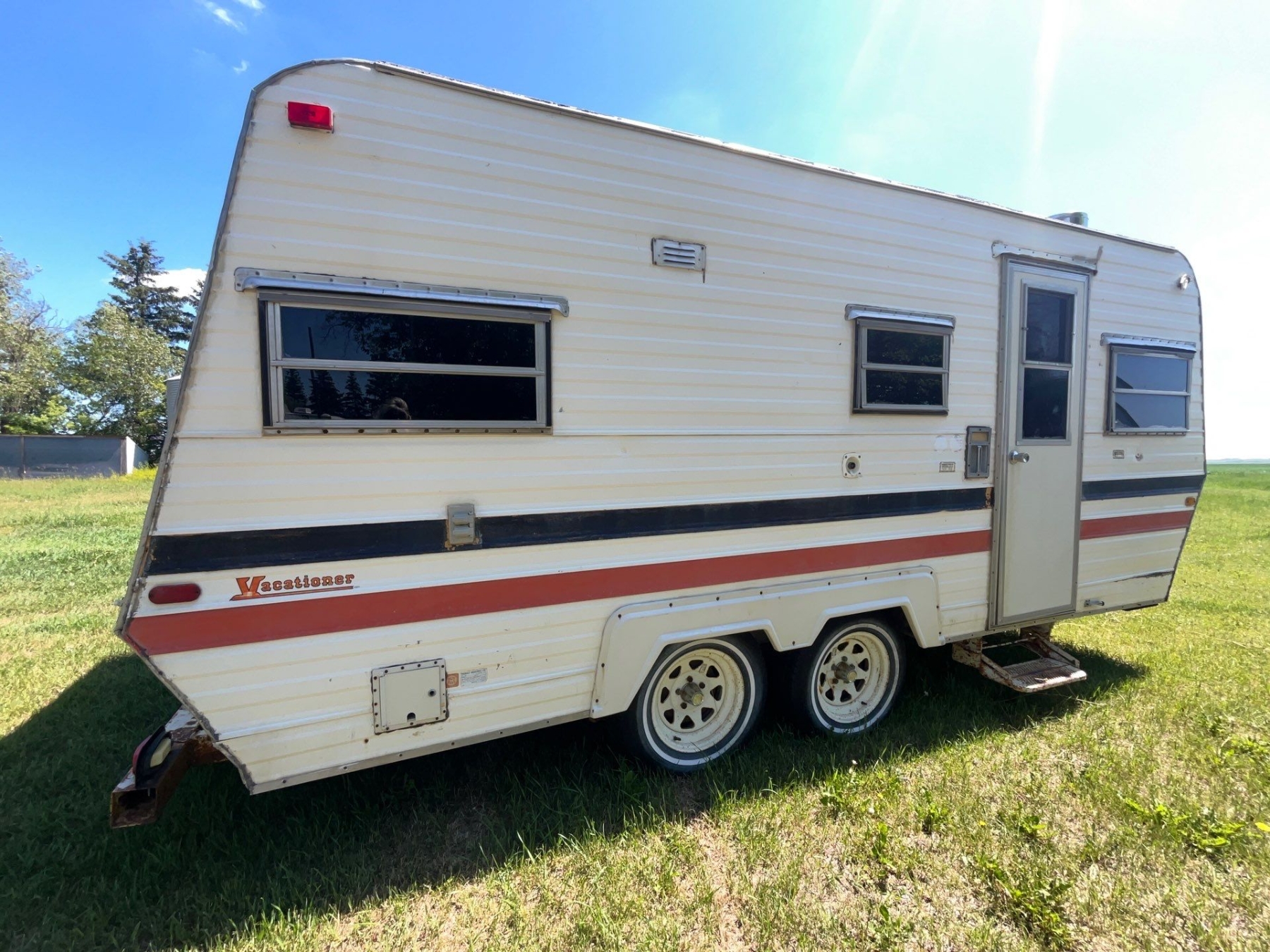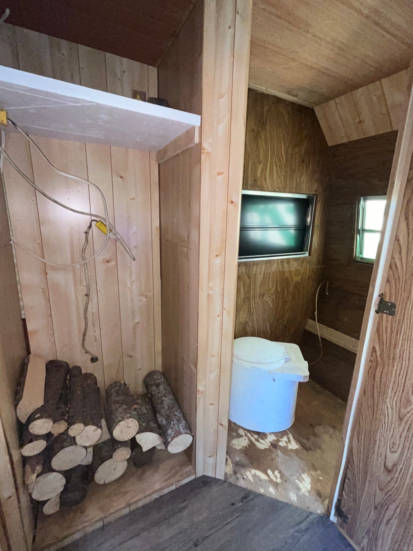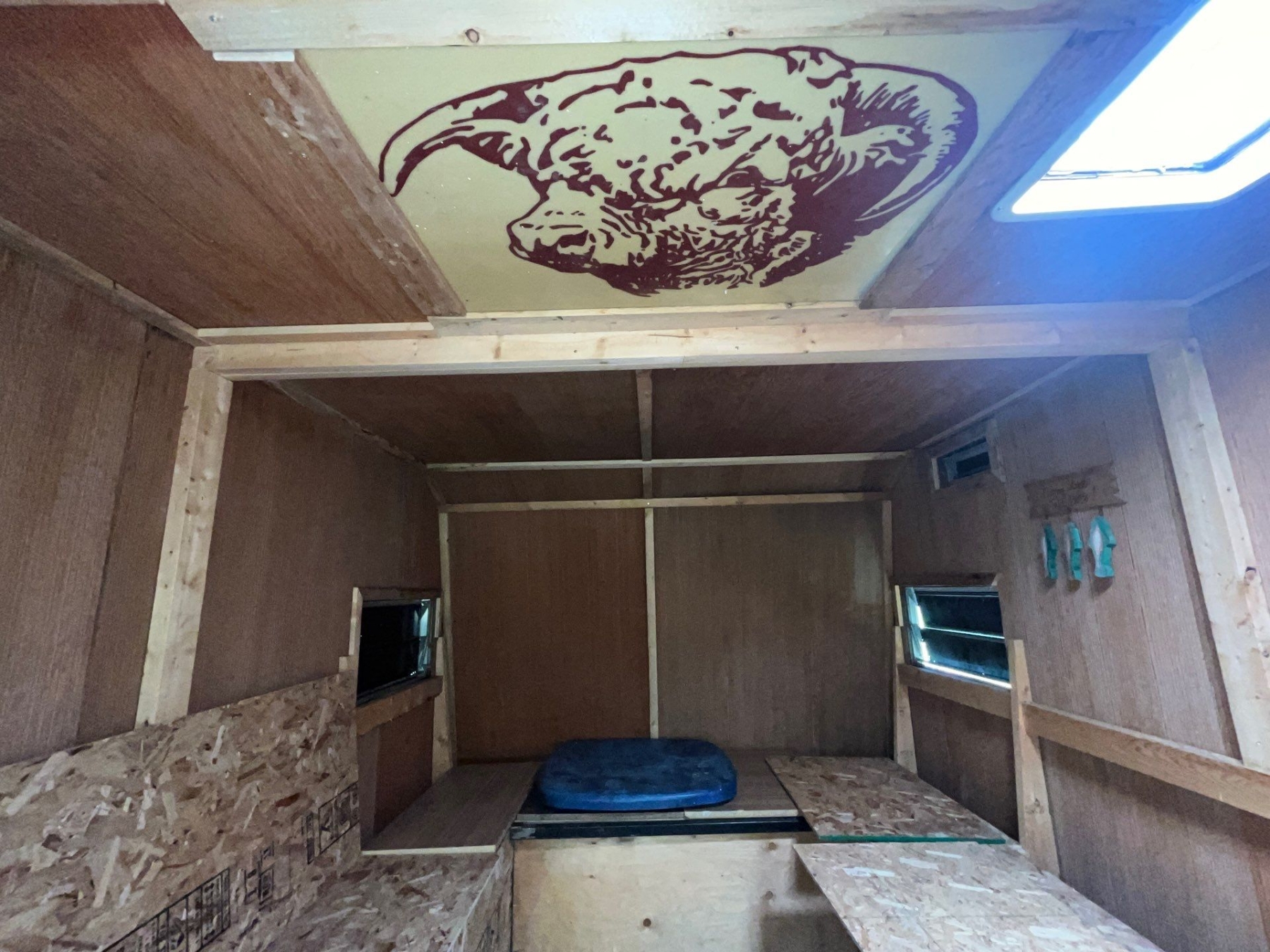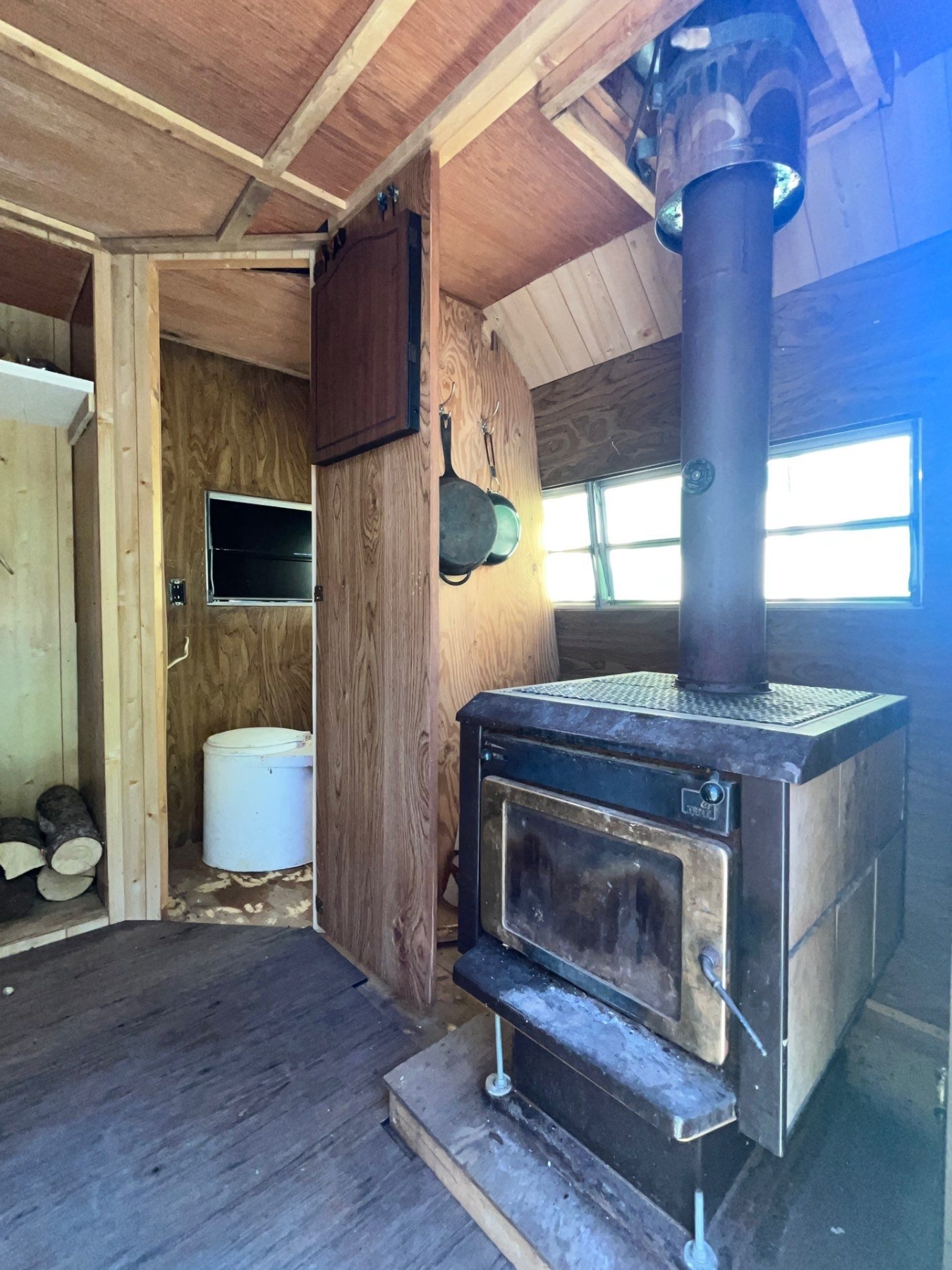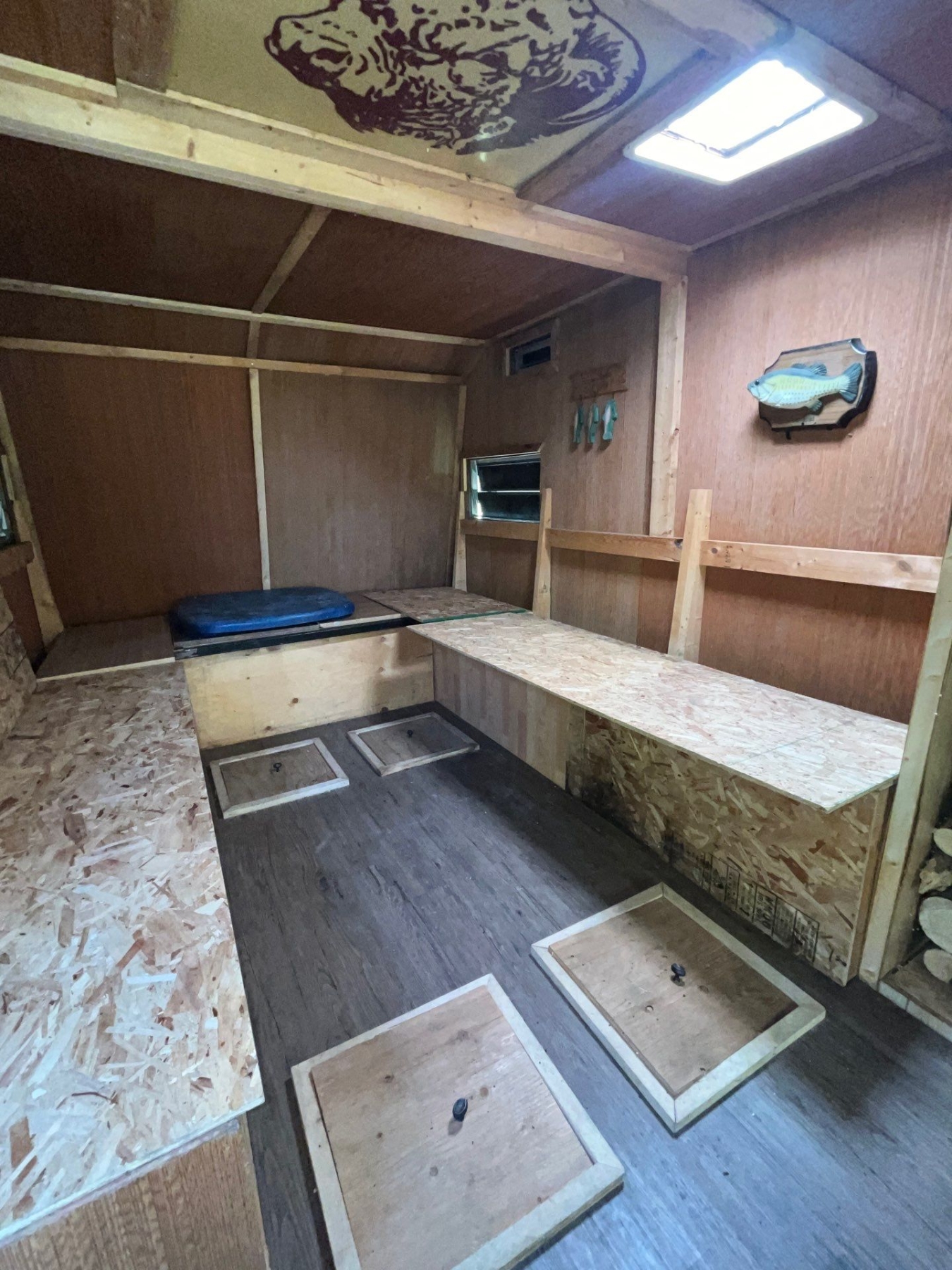 Ultimate Fishing Hut Built In A Vacationer Travel Trailer with 5 Pre made Fishing Holes Wood Burning Heater & Bathroom . Amazing Set Up For Those Cold Days Fishing