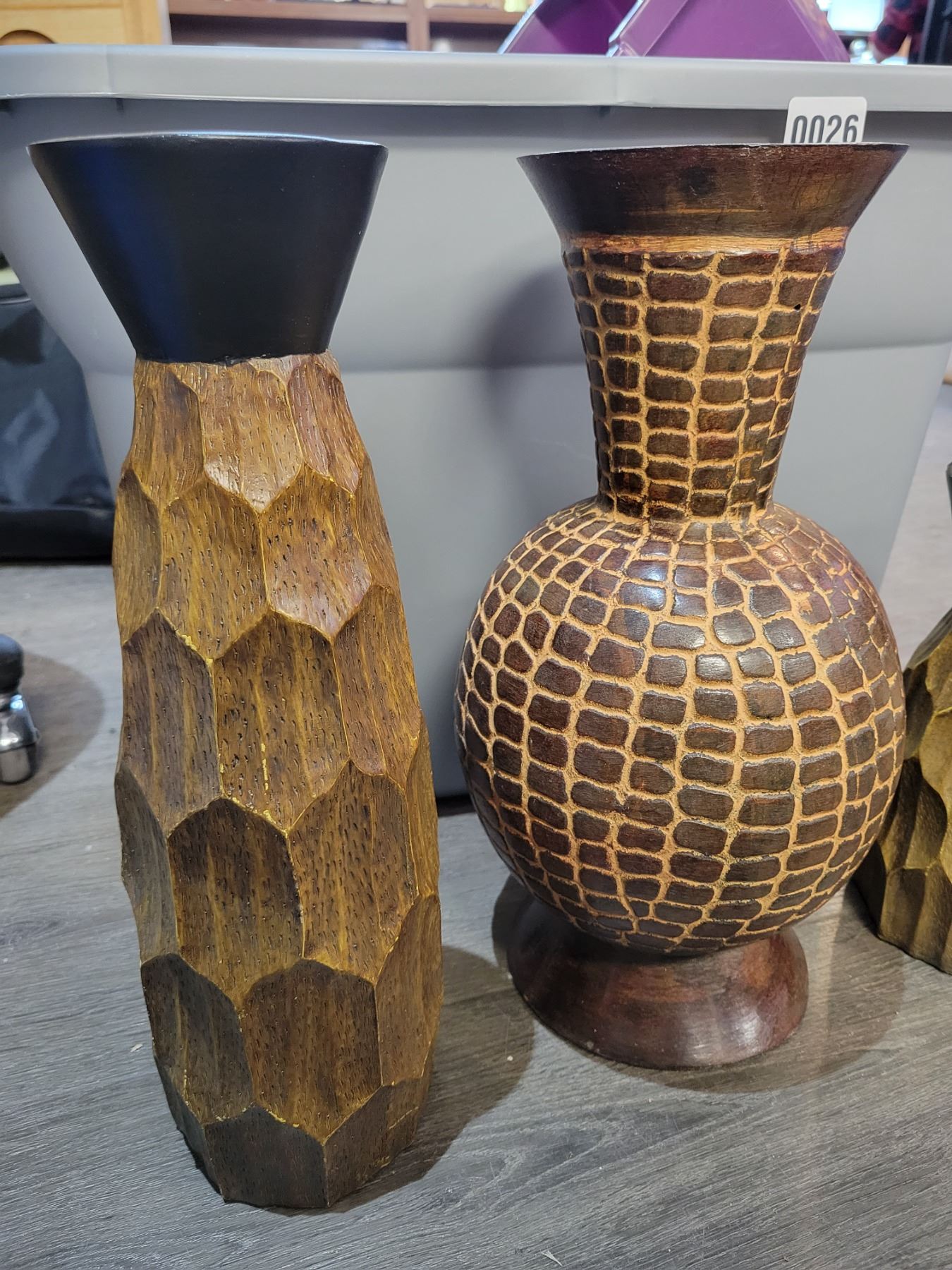 Uniquely Carved Large & Small Wooden Vases 20"h & 12"h - Ceramic Bulbous body Vase 20"h