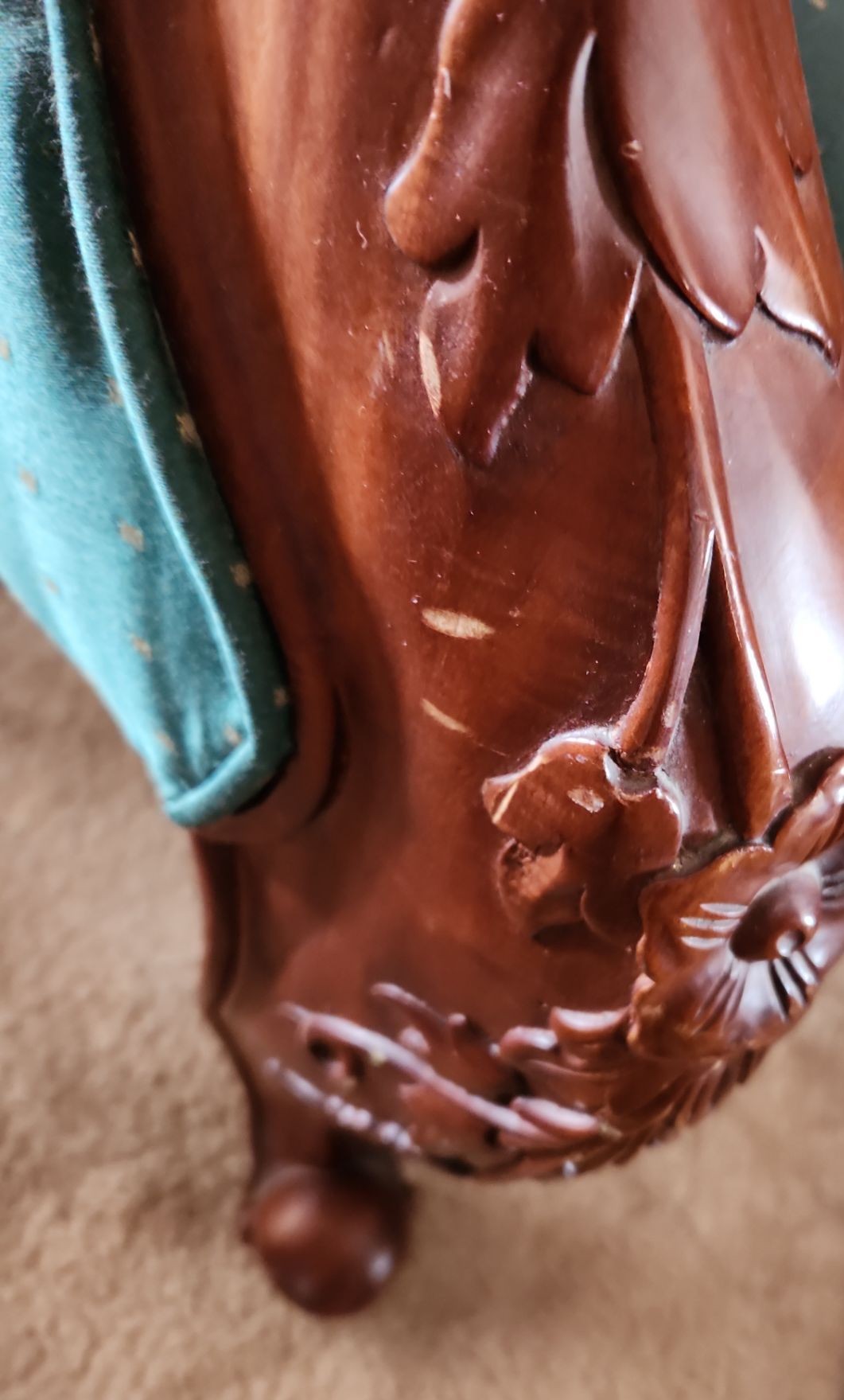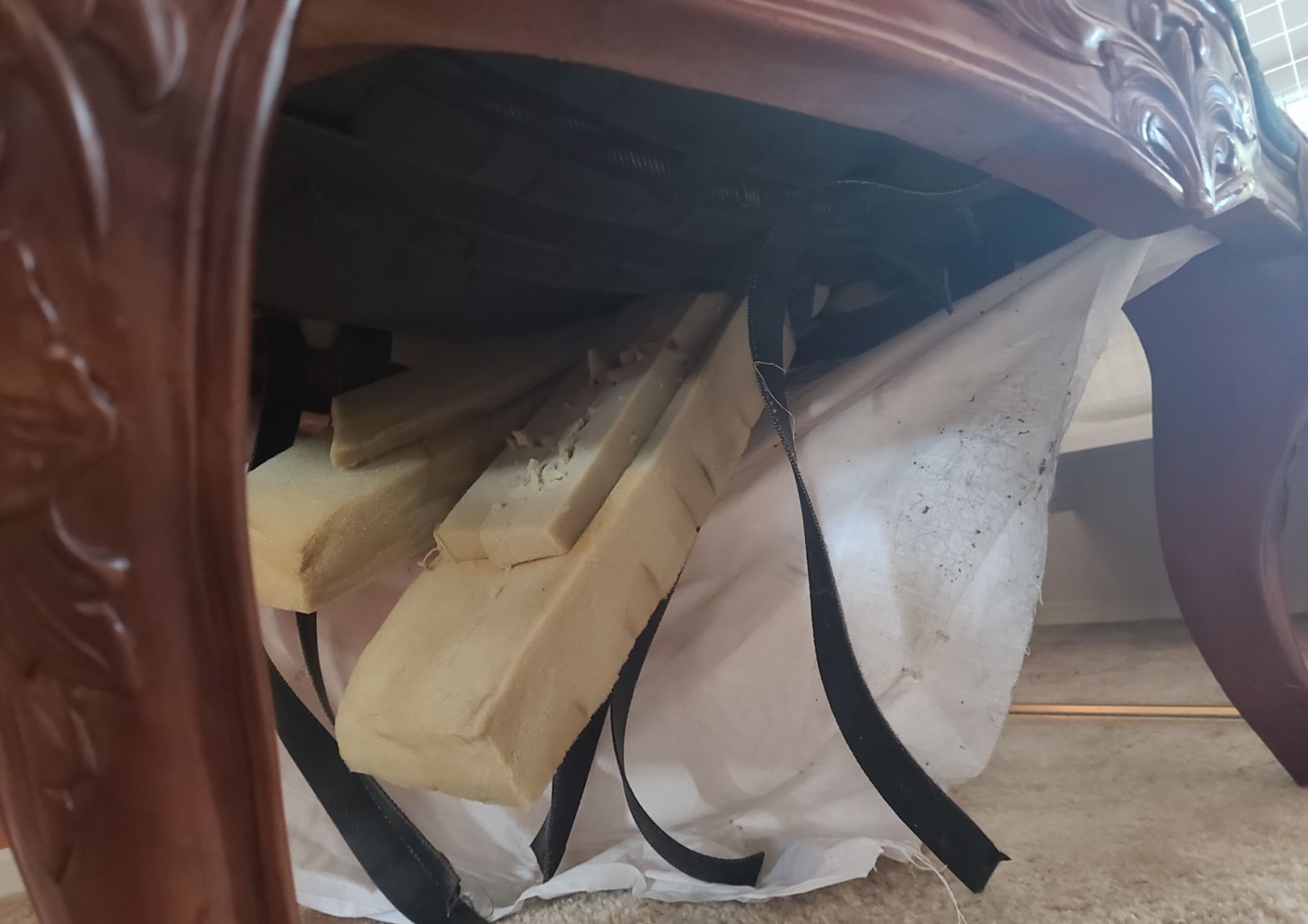 Wood is Scuffed, Seat Cushion is Saggy, Some Seam Issues, Underside Repairs Required
