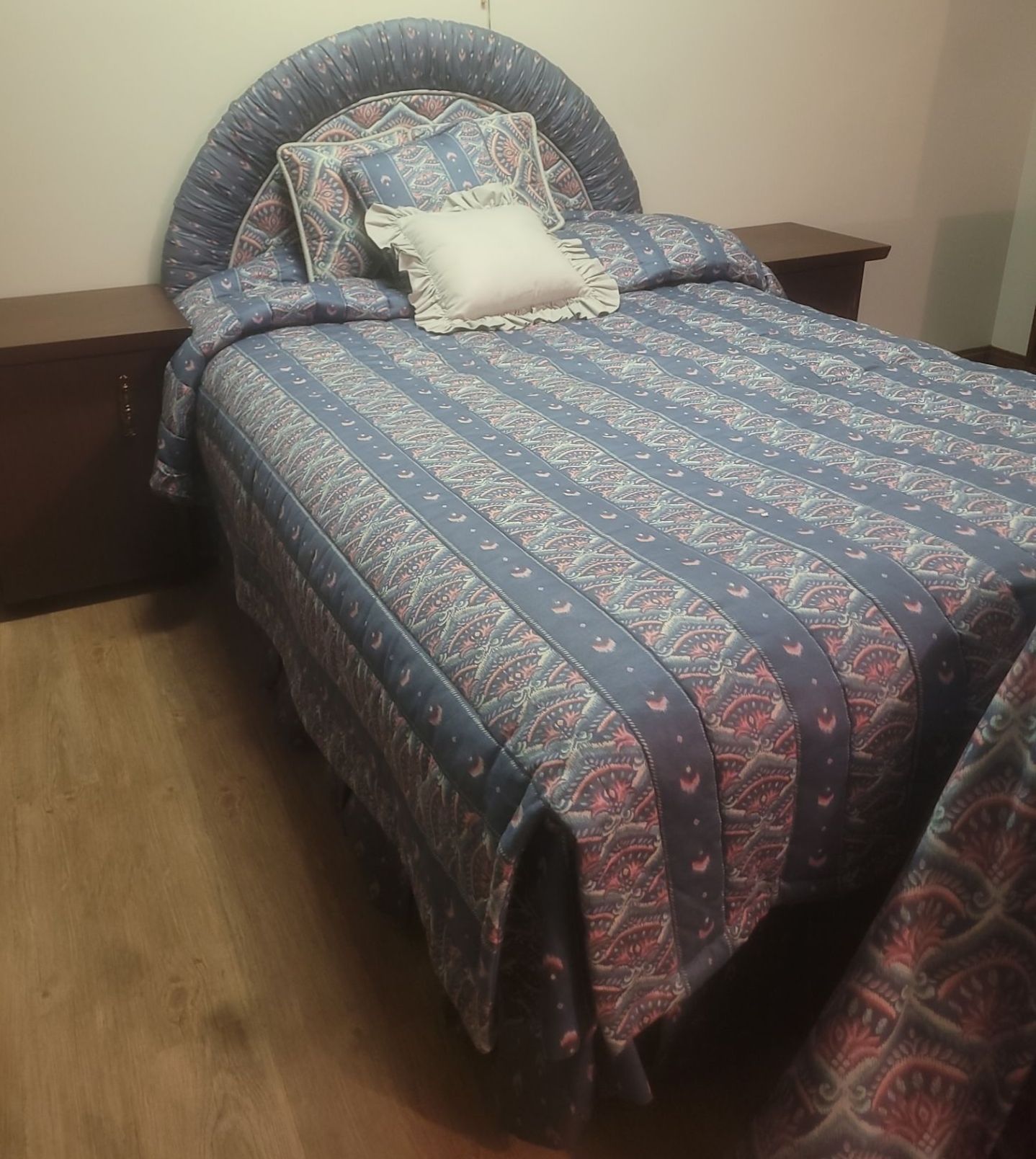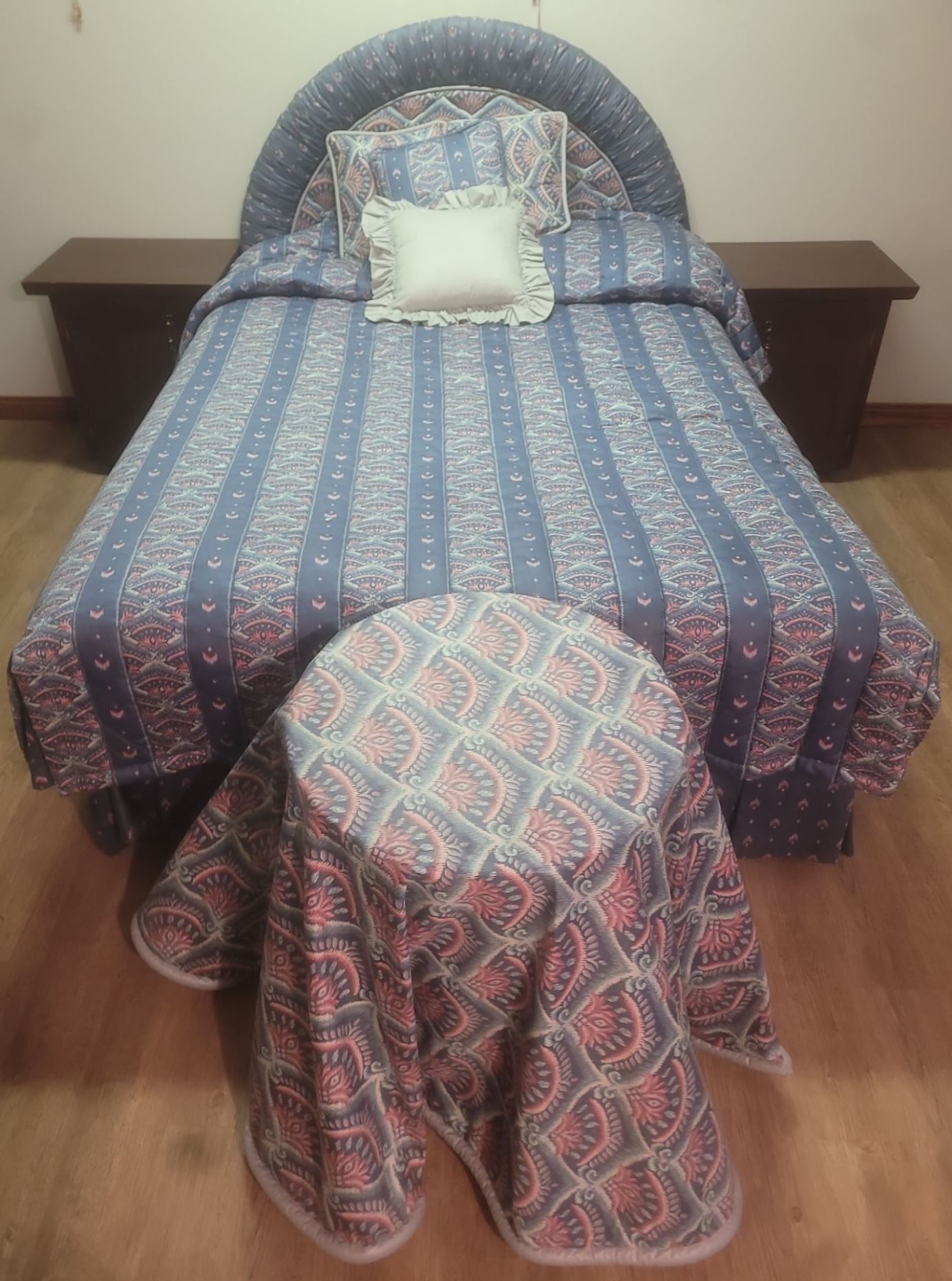 Upholstered Double Bed & Mattress  w/ two Hand made solid wood side tables and Linen  included