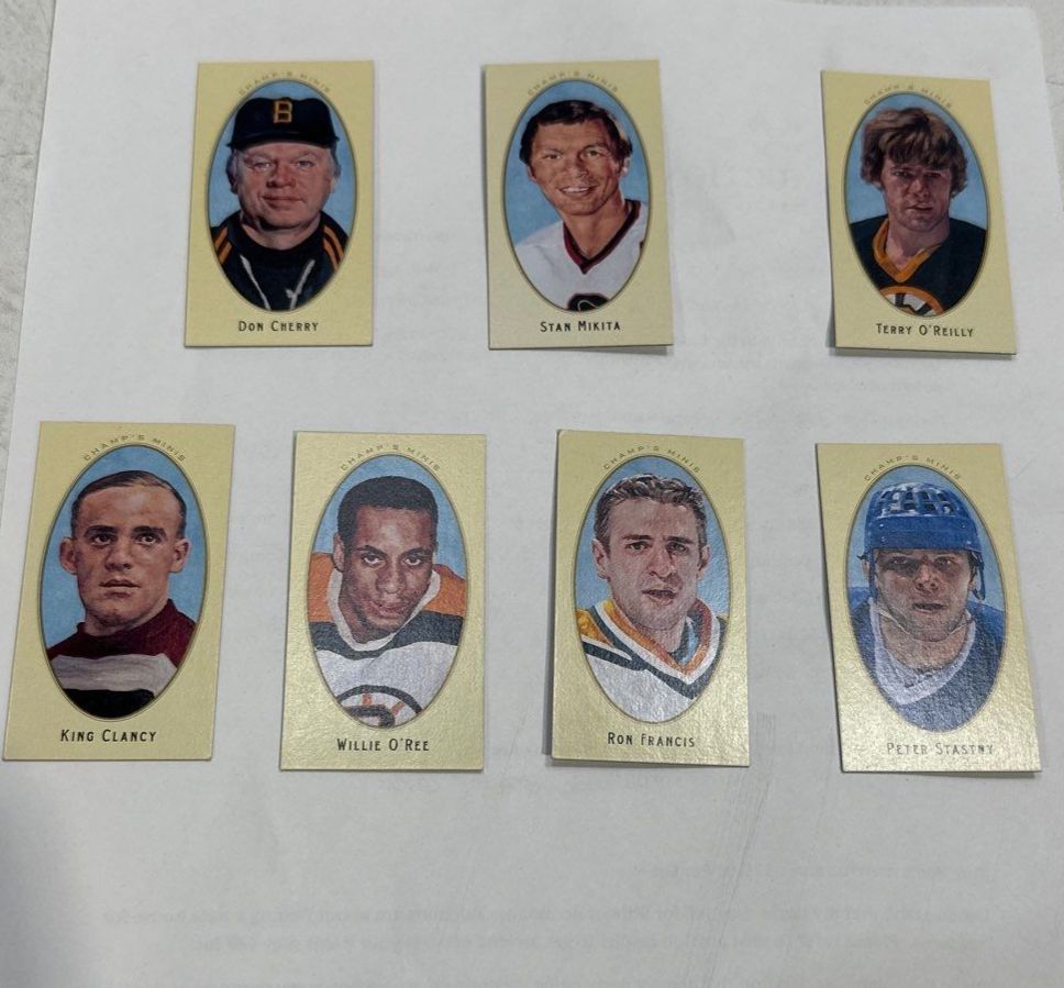 Cards include Don Cherry, Perter Stastiny, King Clancy, Willie O'Reee, Stan Mikita, Terry O'Reilly, Ron Francis
