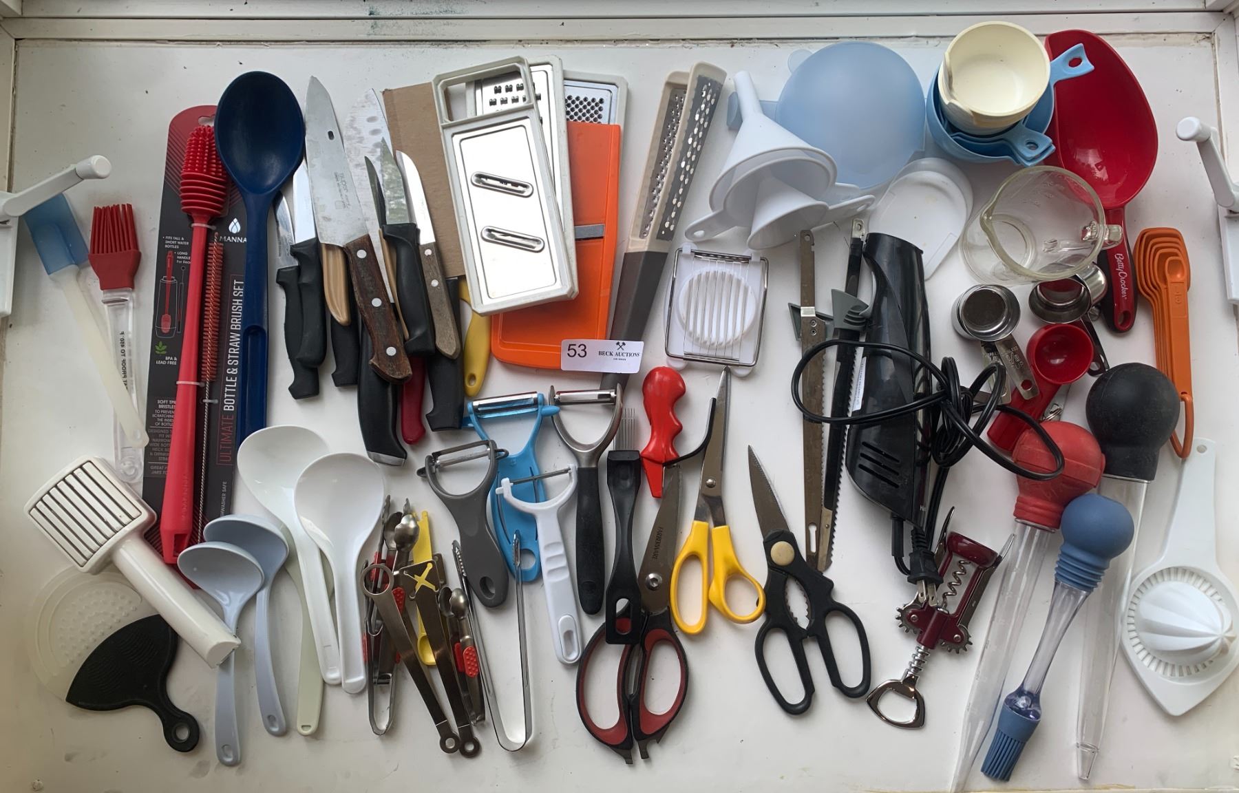 Useful Kitchen Utensils Lot. Includes measuring cups, measuring spoons, basters, spatuals, knives, graters.