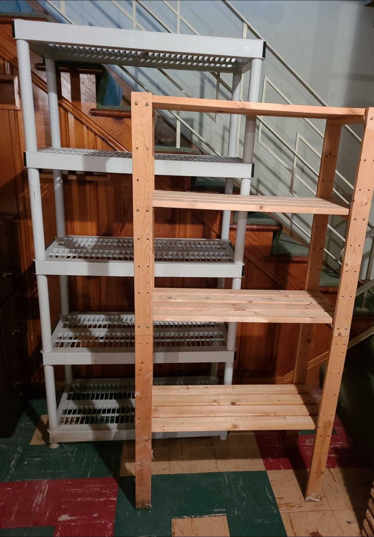 Utility Shelving  Includes: Heavy- Duty Plastic 4 Shelf 73 T, 35 L, 18 W and Wooden 3 Shelf