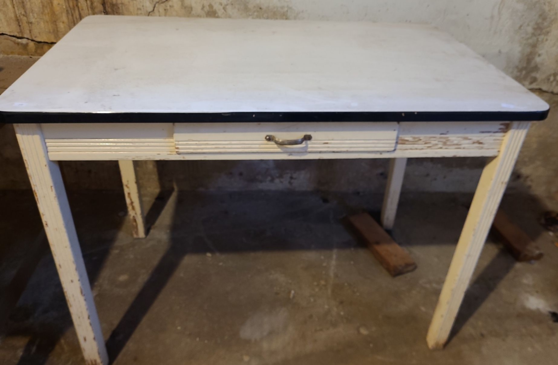 Utility Table with Wooden Legs, Metal Top, and 1 Drawer 40 L, 30 T, 25 W