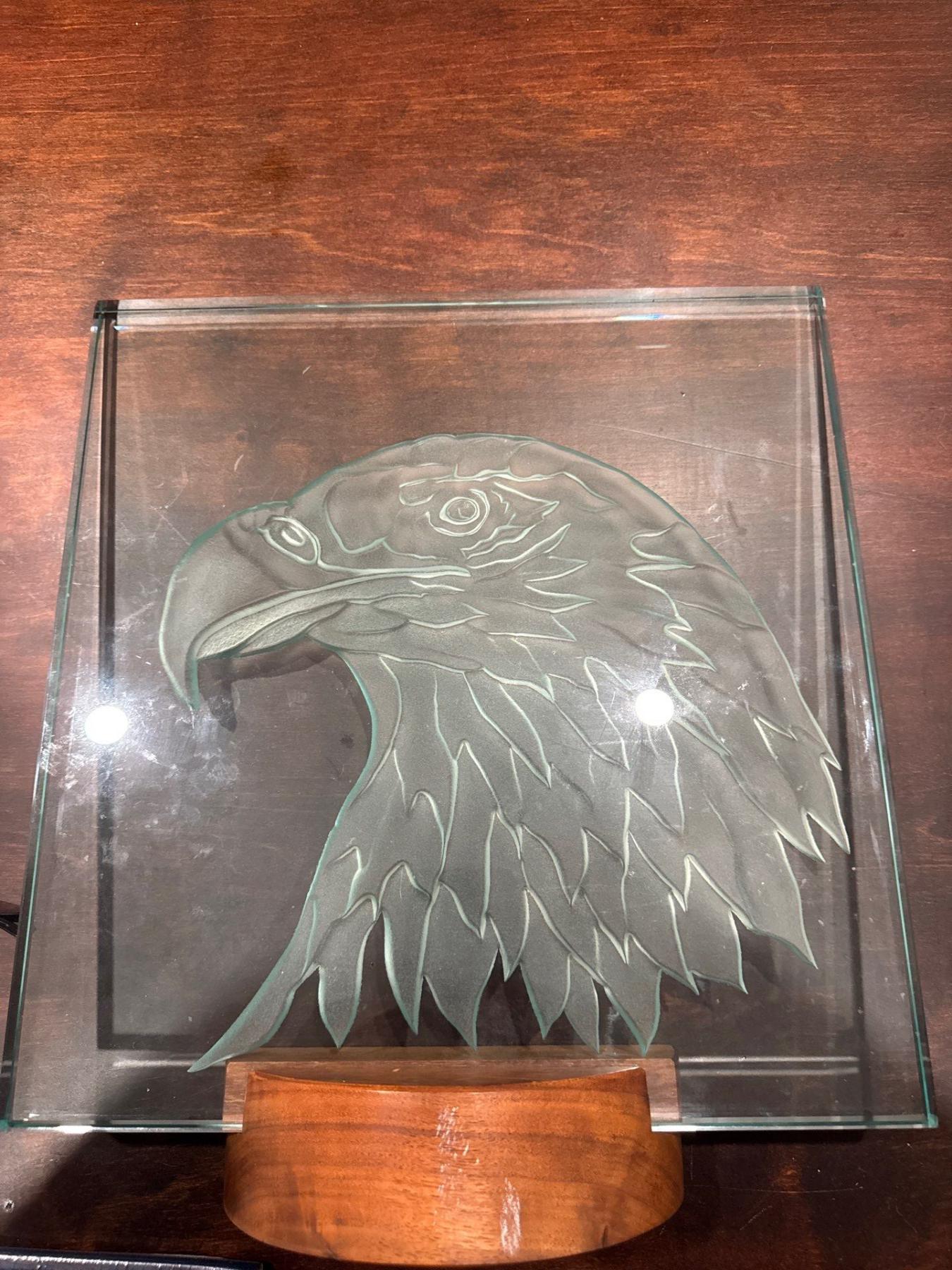 VERY NICE Large etched glass eagle. Very nice. In wood base. 12 inches by 13 inches.