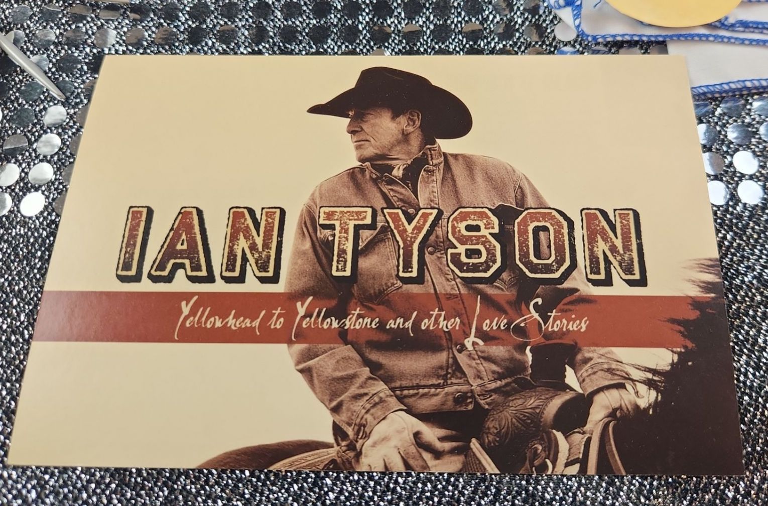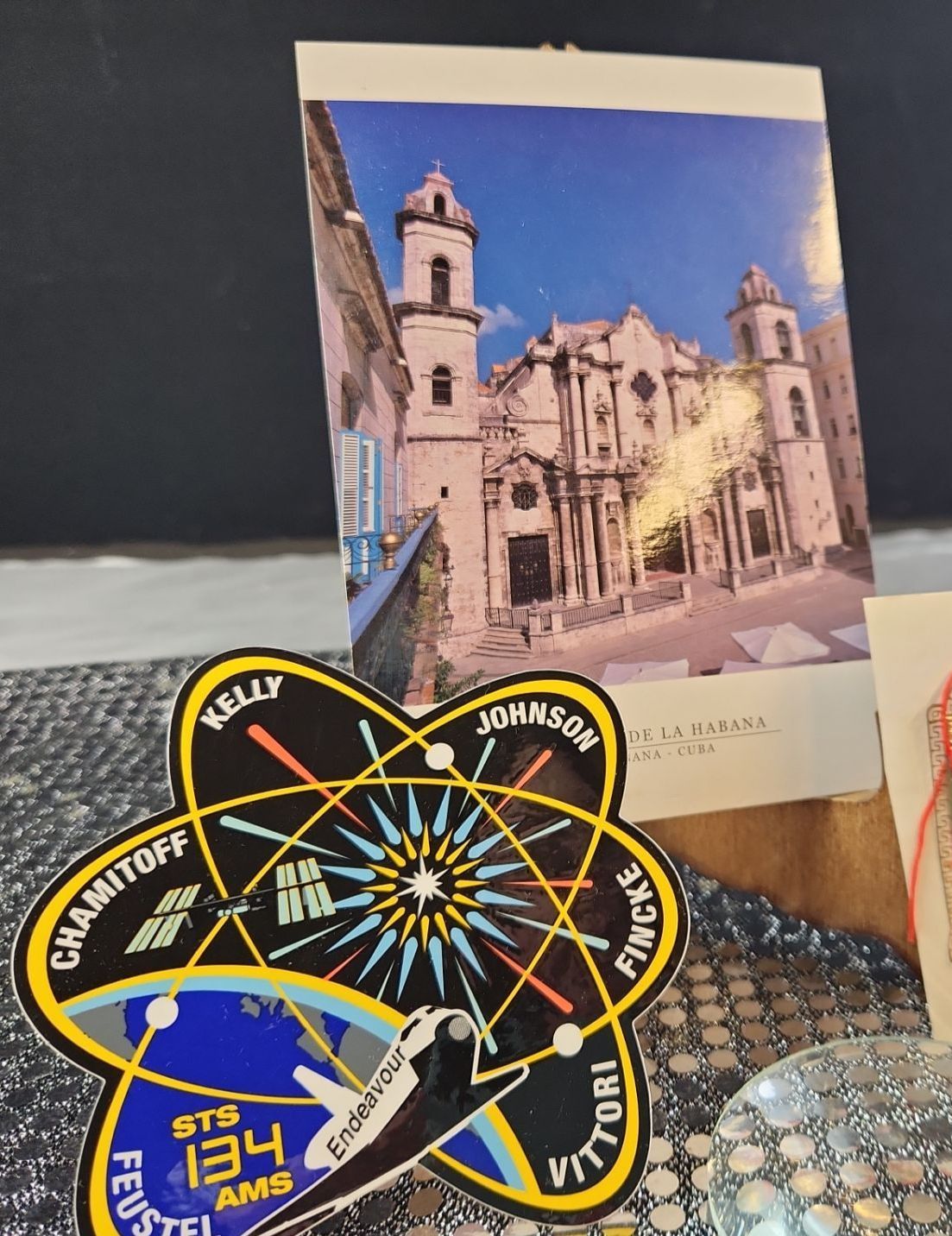 This collection of mixed memorabilia includes Ian Tyson books & promotional photos, a mission patch from the Space Shuttle Endeavour STS-134 mission, embroidered linens and other trinkets.