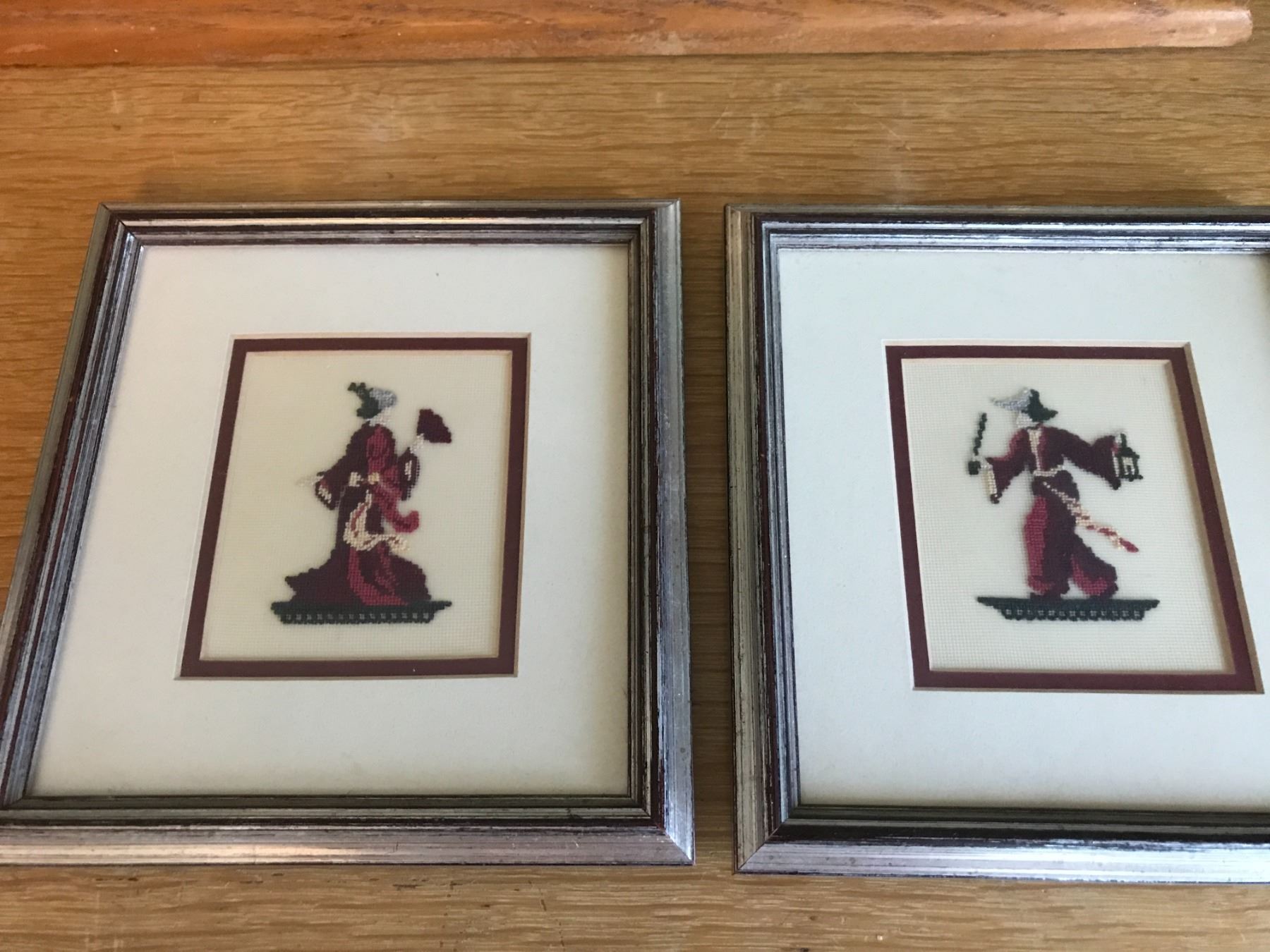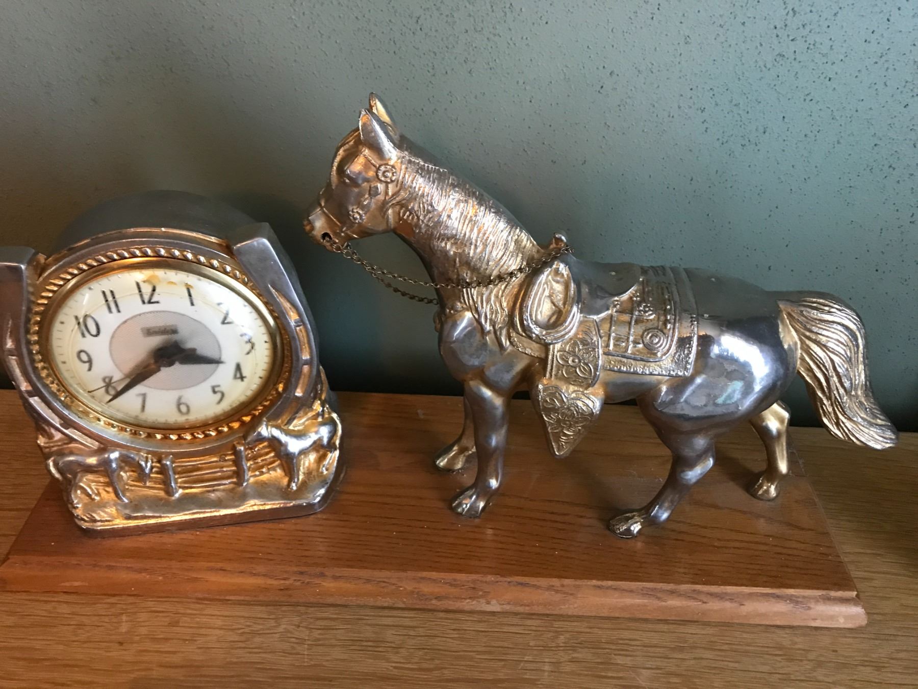 Various Carlton Ware Plate, 2 Asian Petit Point, Snider Horse Clock & Assorted Glassware