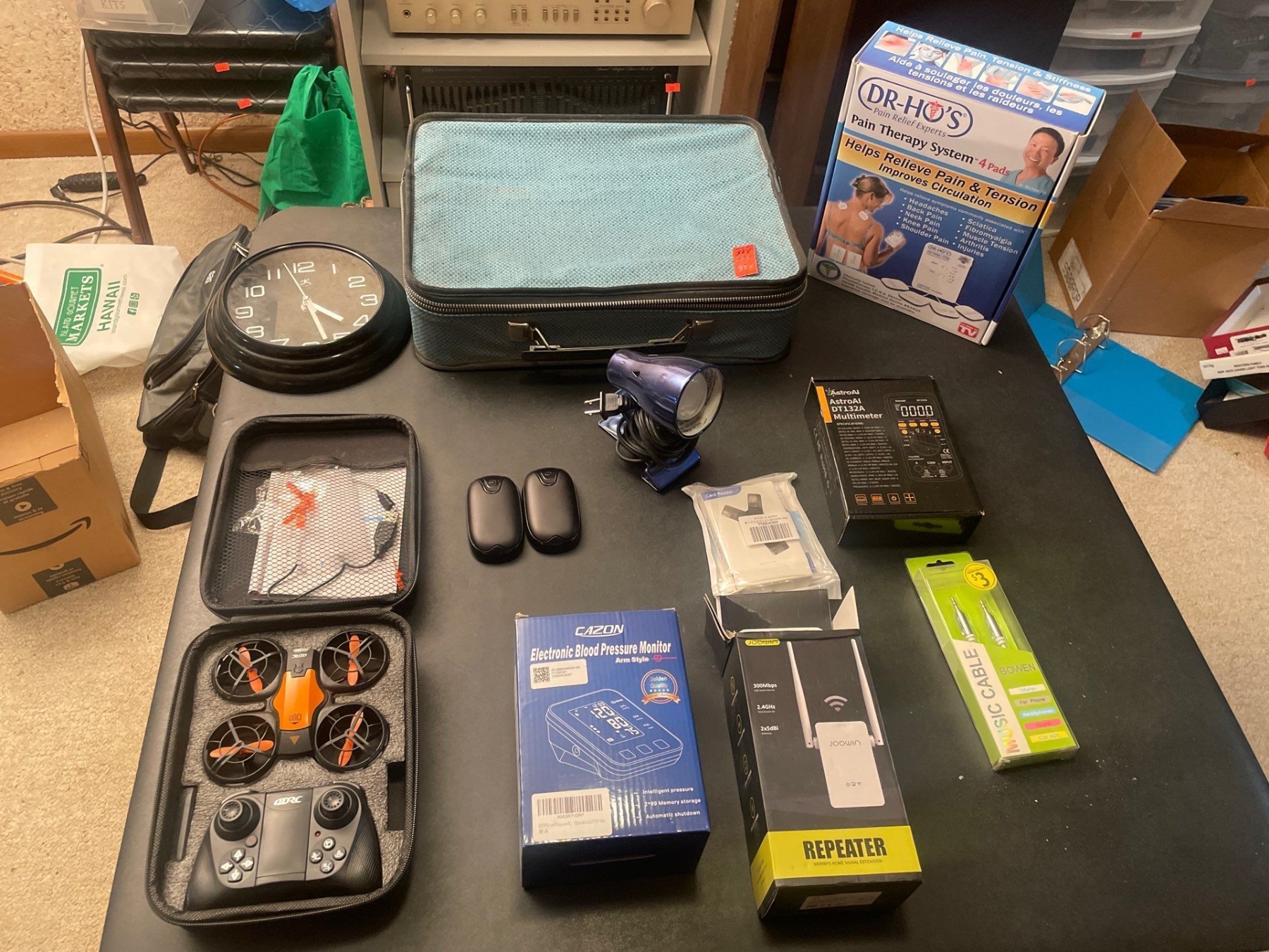 Various Electronic Equipment, Mini Drone, Clock, Desklamp, Blood Pressure Monitor, Multimeter, Pain Management System, Handwarmers, Case