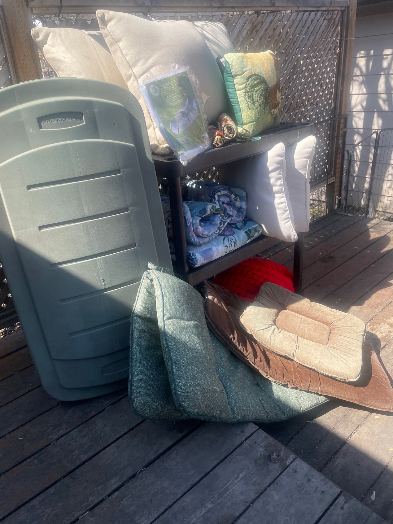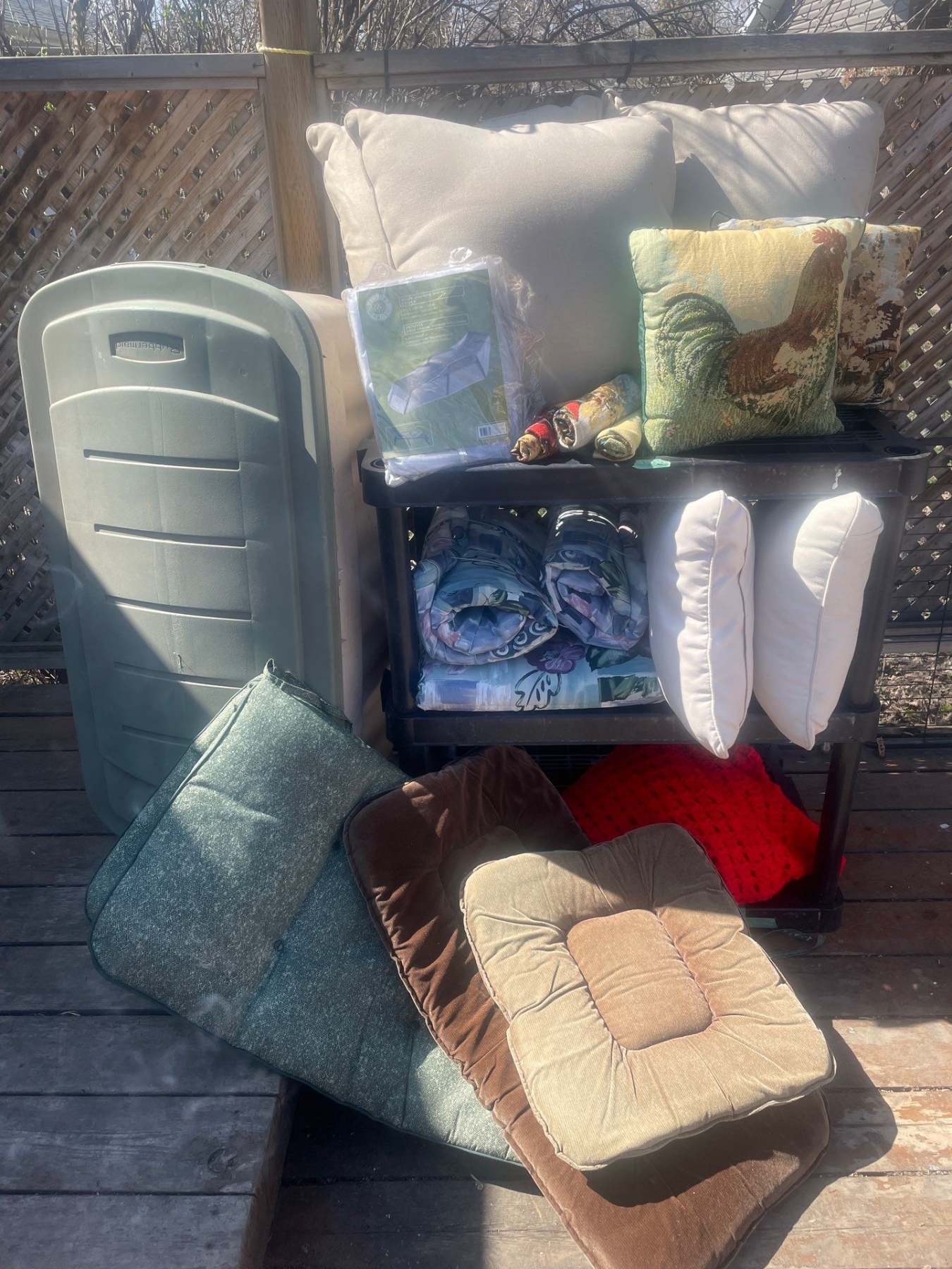 Various Outdoor Cushions and furniture coverings, Storage Tote Included.SHELVING NOT INCLUDED.