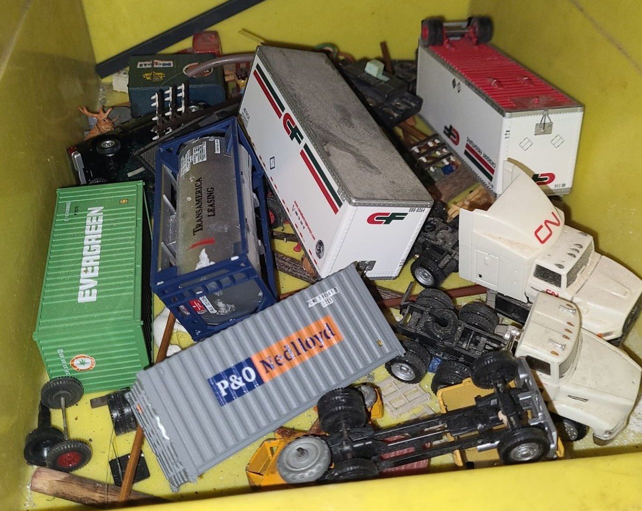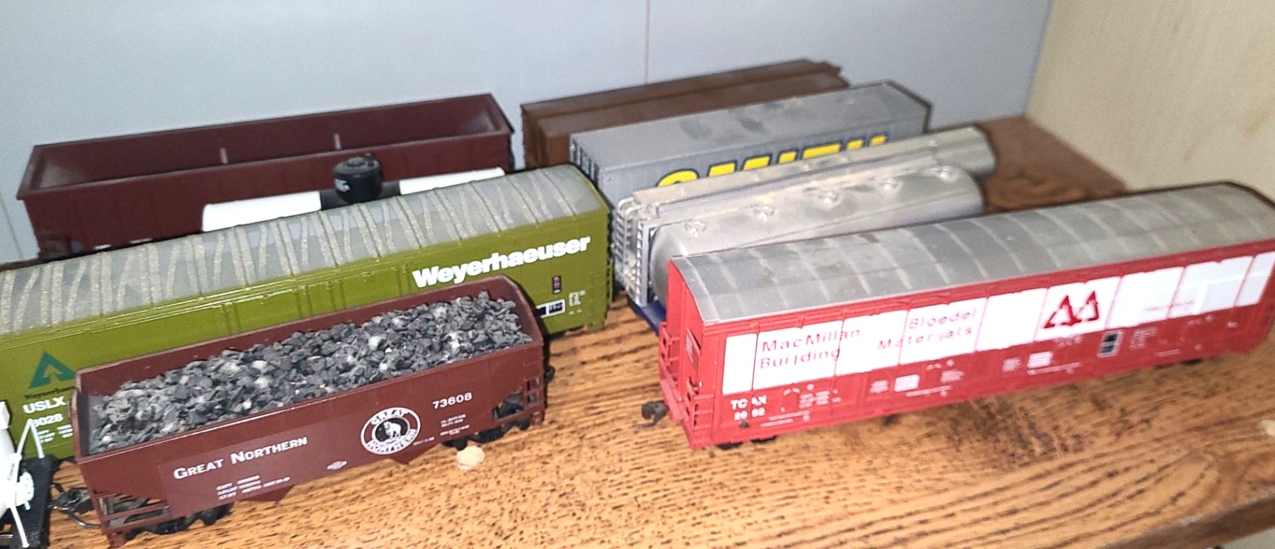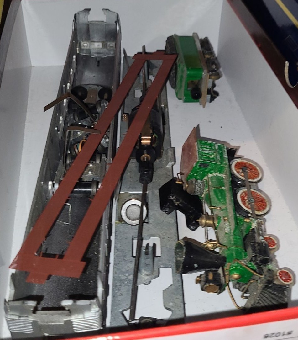 Various Railcars, Small Box of Parts, Small Metal Locomotive & Asst Open Cargo Cars