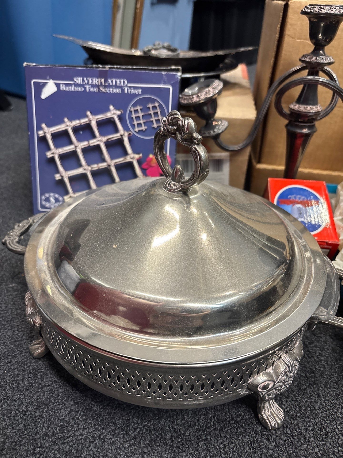 Various Silver Plated Dishes, Servings Trays, Cups, Candle Holder