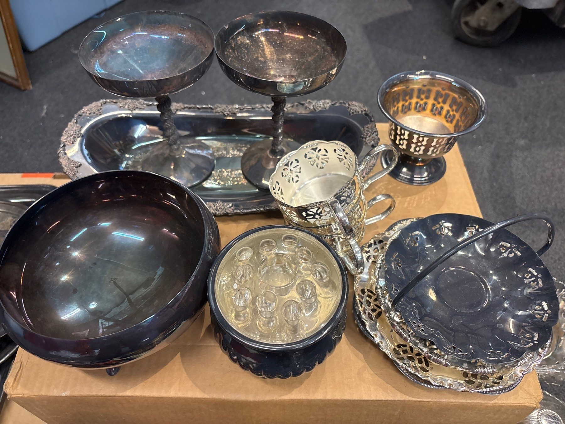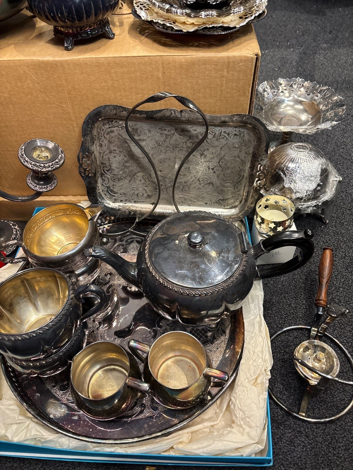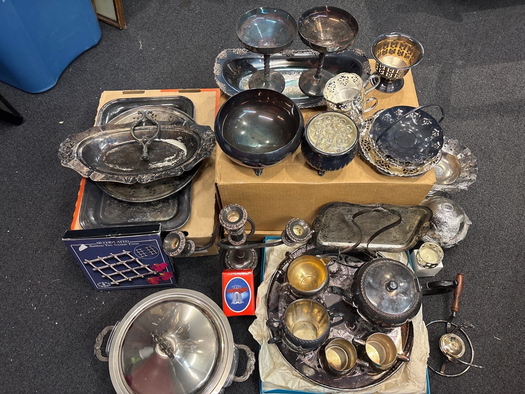 Various Silver Plated Dishes, Servings Trays, Cups, Candle Holder, Teapot