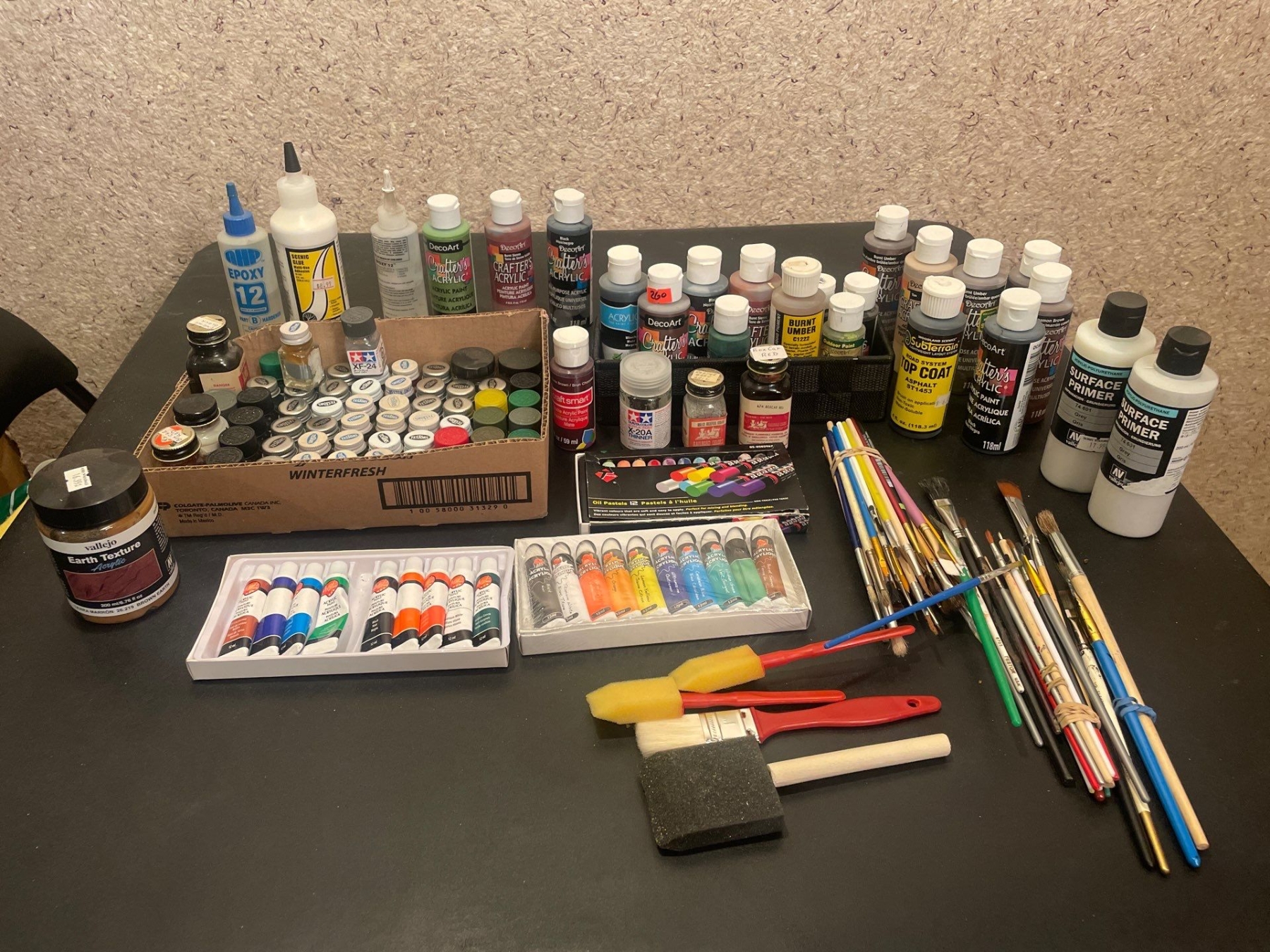 Various art/craft supplies, Artist Series Acrylics, Testors Paints, Oil Pastels, Primers and coatings, Assorted Brushes..