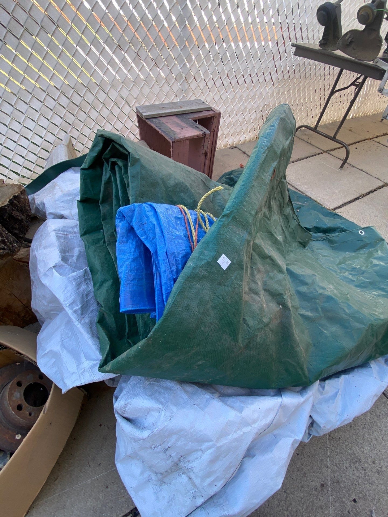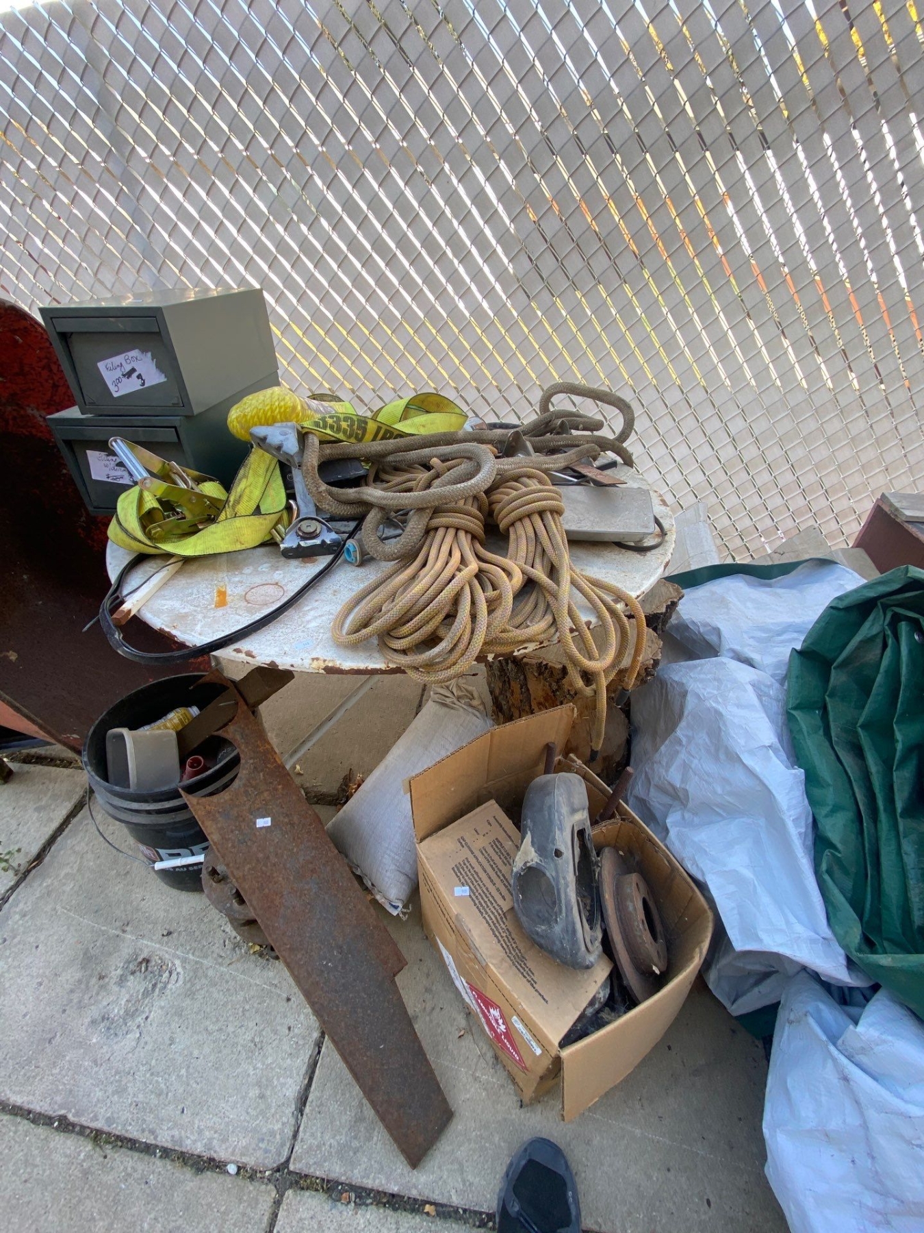 Various ropes, tarps wheel barrel, steel boxes, scrap metal and sandbags and more