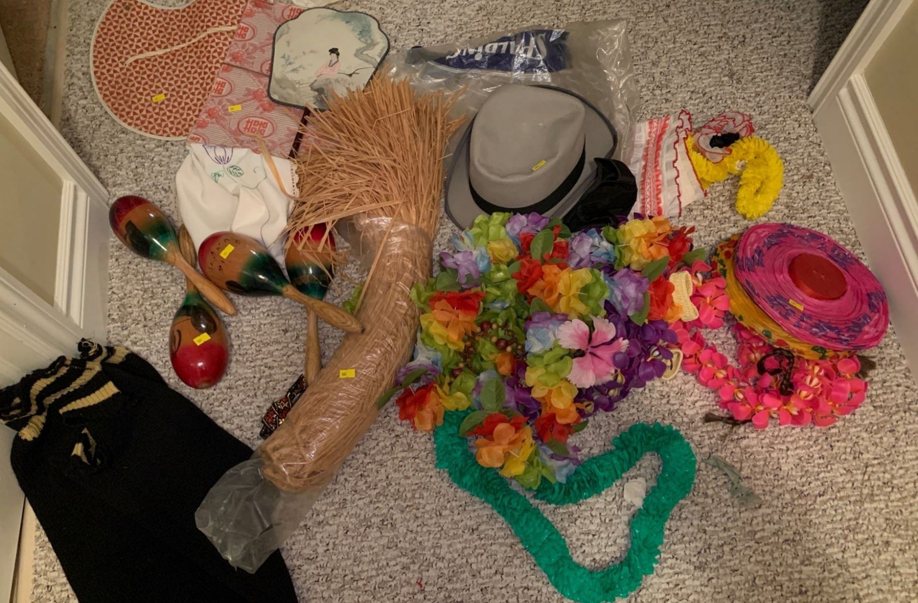 Various vacation mementos; hats, a sweater, maraca, Asian fan, and more!