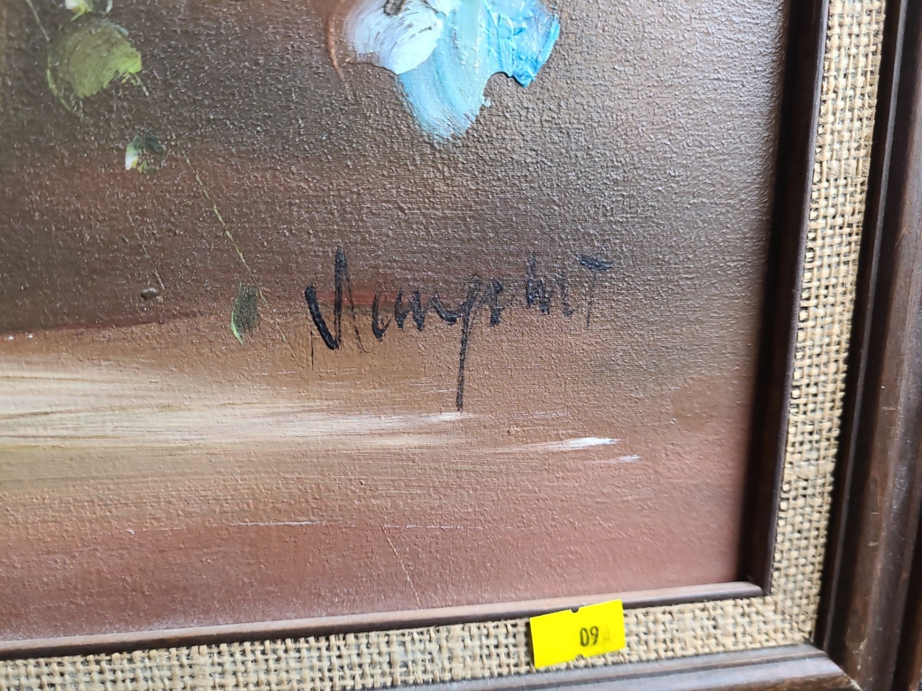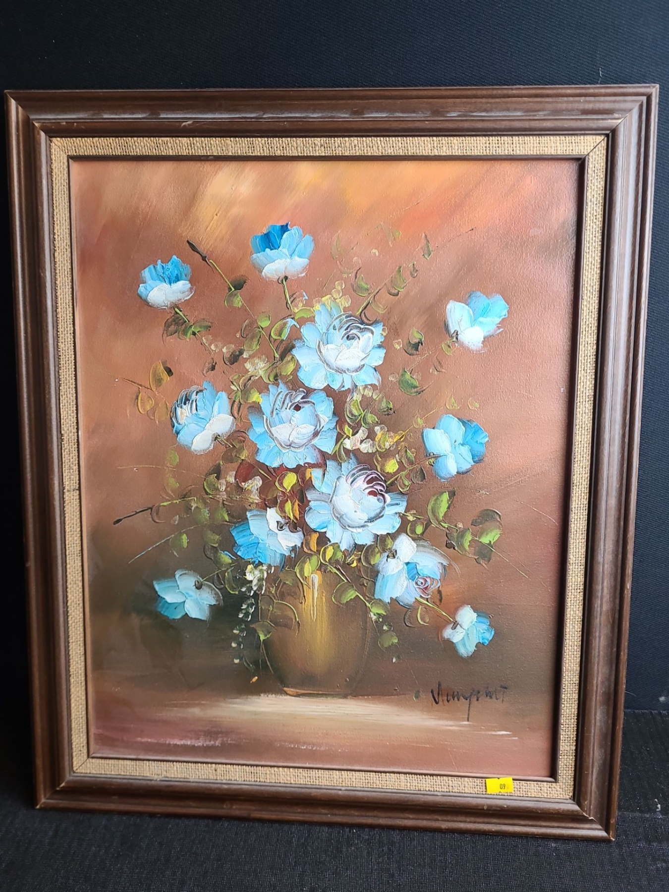Vase w/ Blue Flowers Painting, Signed: Artist Name Illegible, Framed, 19.5 X 24