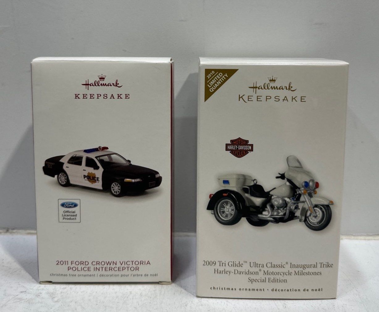 Vehicles- 2011 Crown Victoria Police Interceptor, 2009 Tri-Glide Ultra Classic Hallmark Ornaments