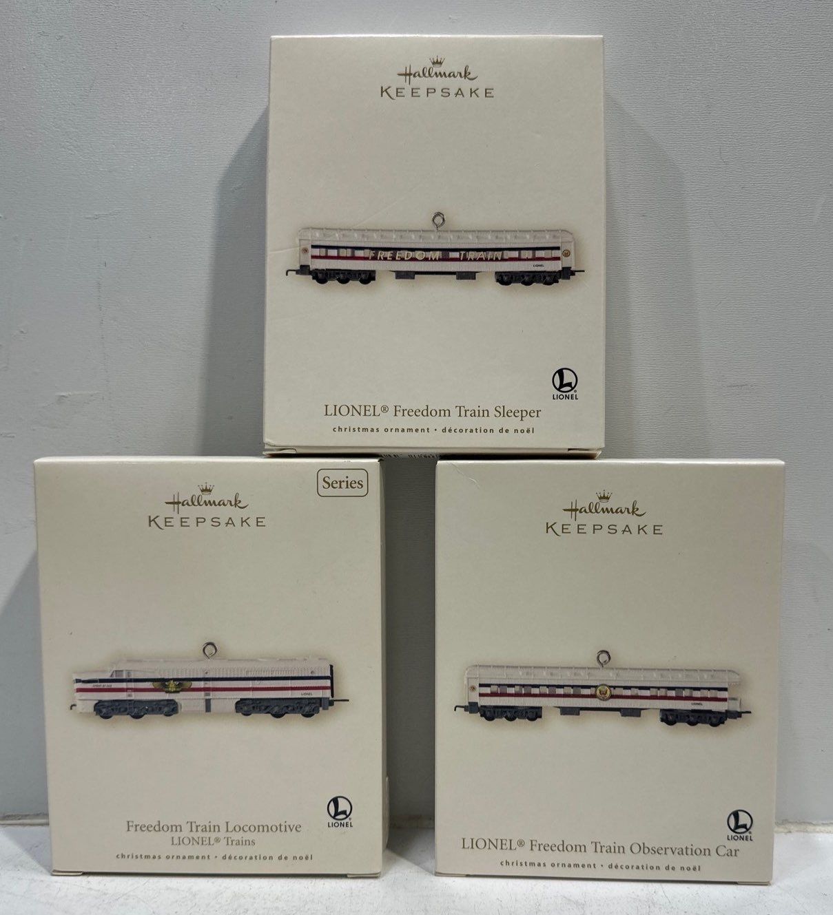 Vehicles-Freedom Train Locomotive, Sleeper, Observation Car Hallmark Ornaments