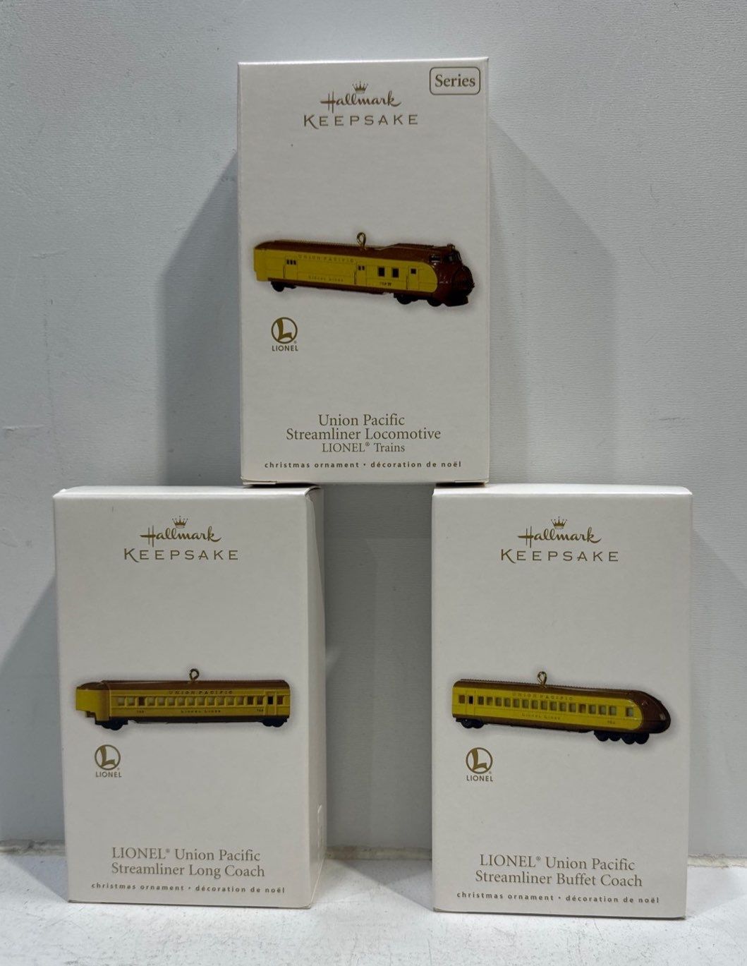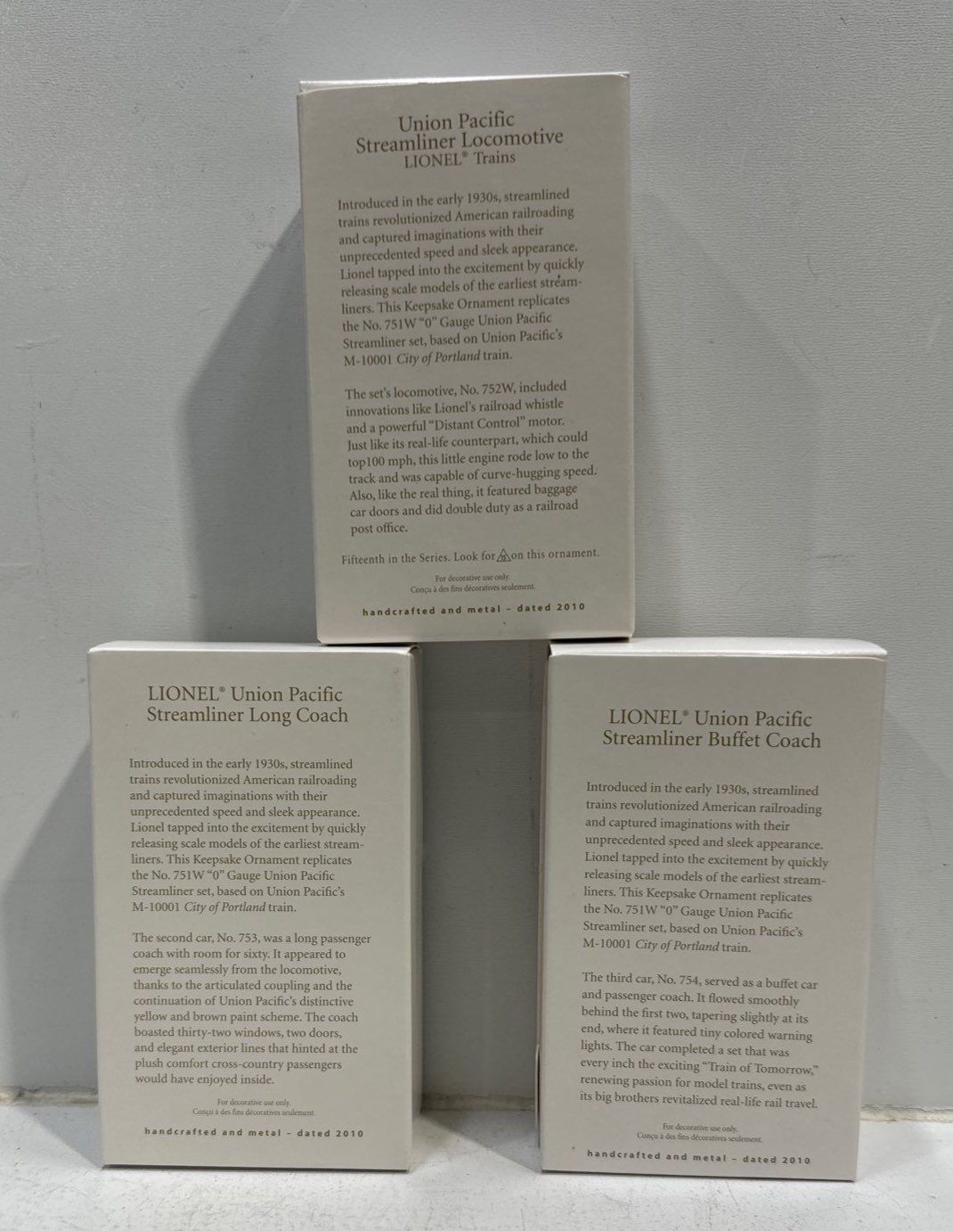 Vehicles-Union Pacific Streamliner Locomotive, Long Coach, Buffet Coach Hallmark Ornaments