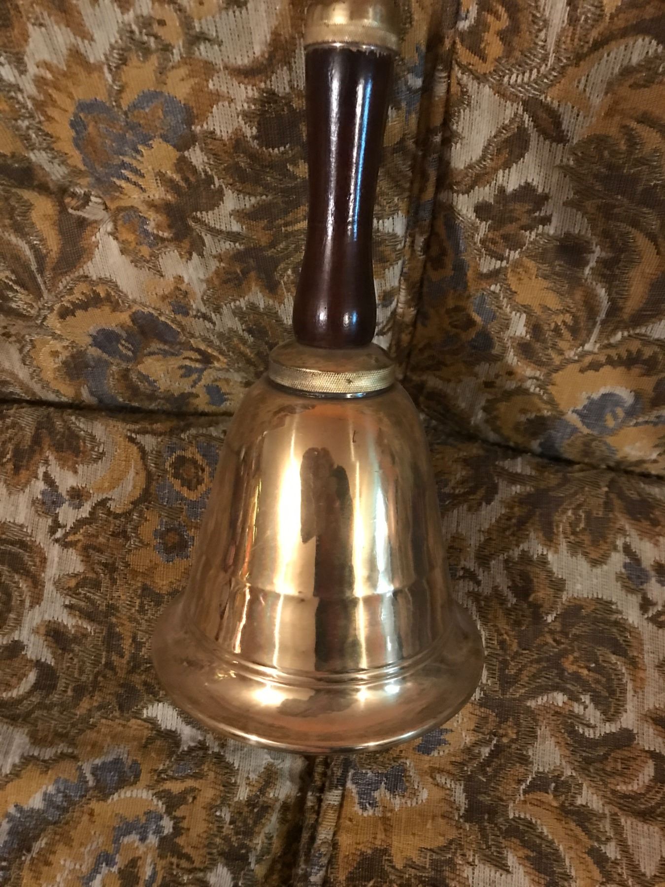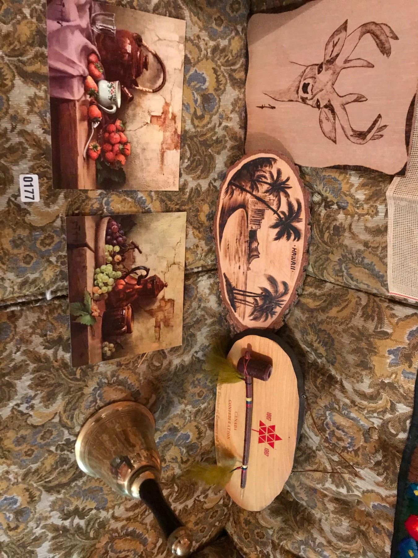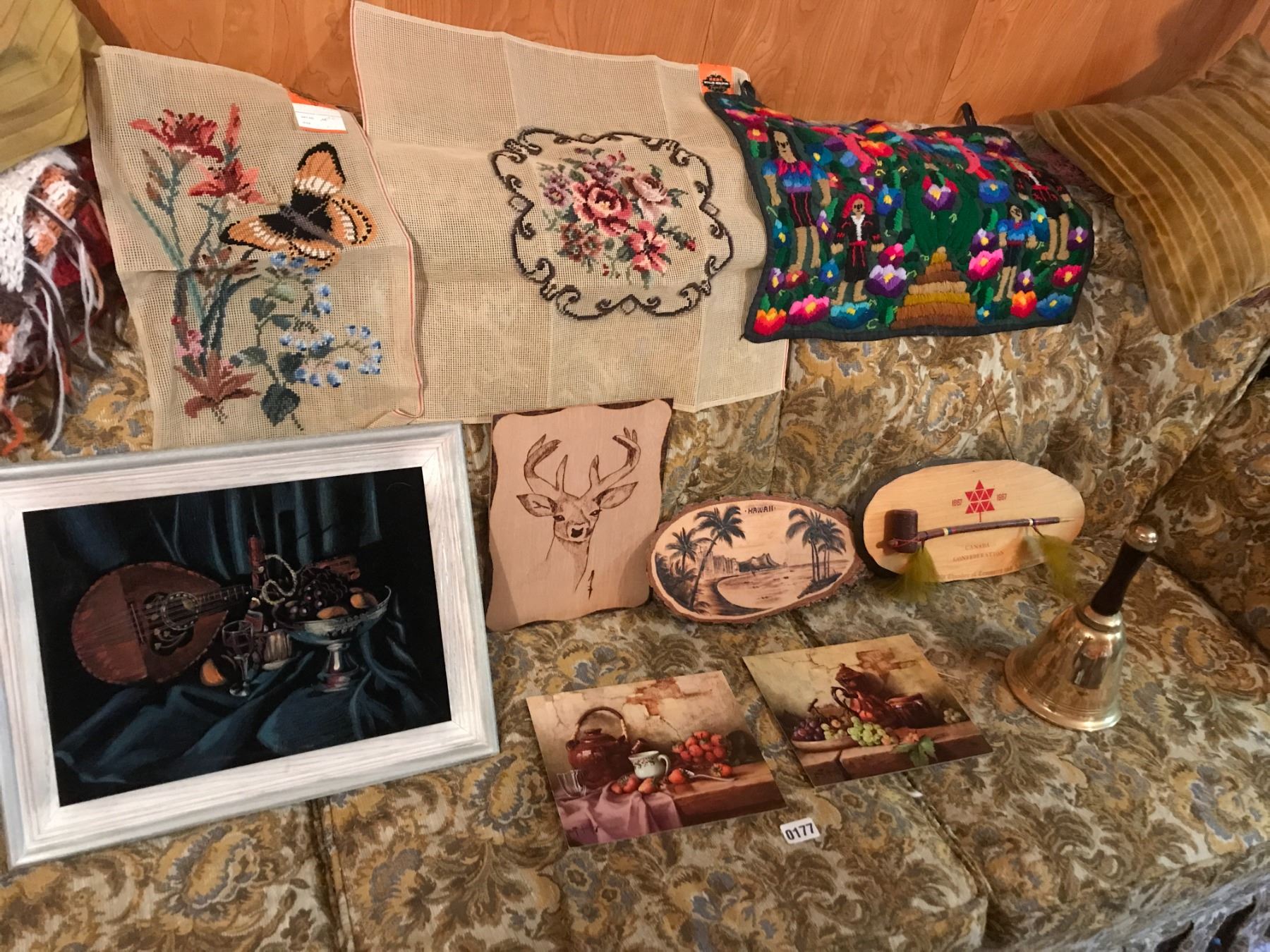 Velvet Wall Art, Needlepoint Tapestry, Wood Art & Large Brass School Bell