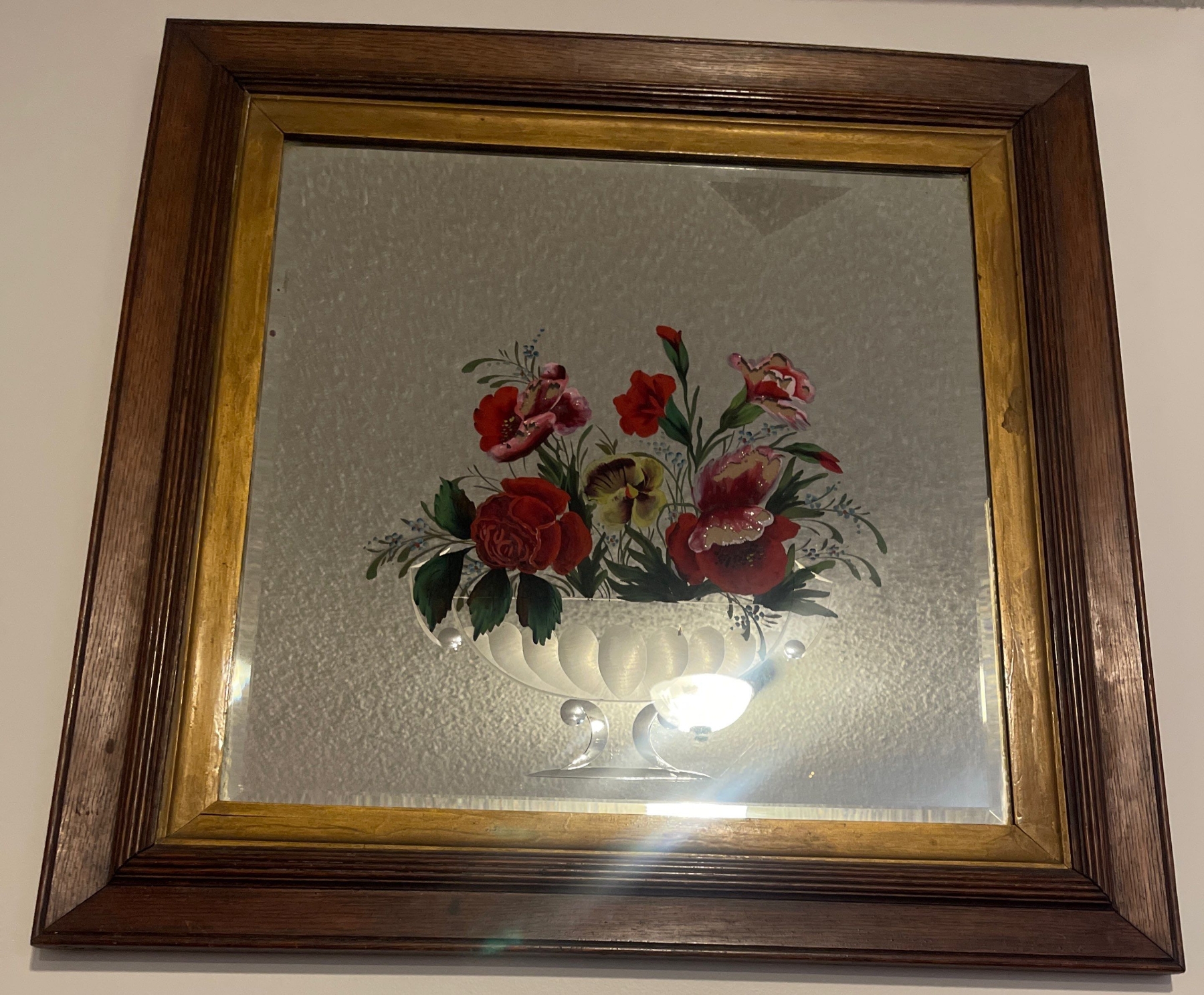Victorian Reverse Painted Mirror Encased in Walnut Beveled Frame 30x30