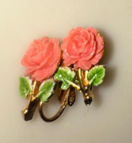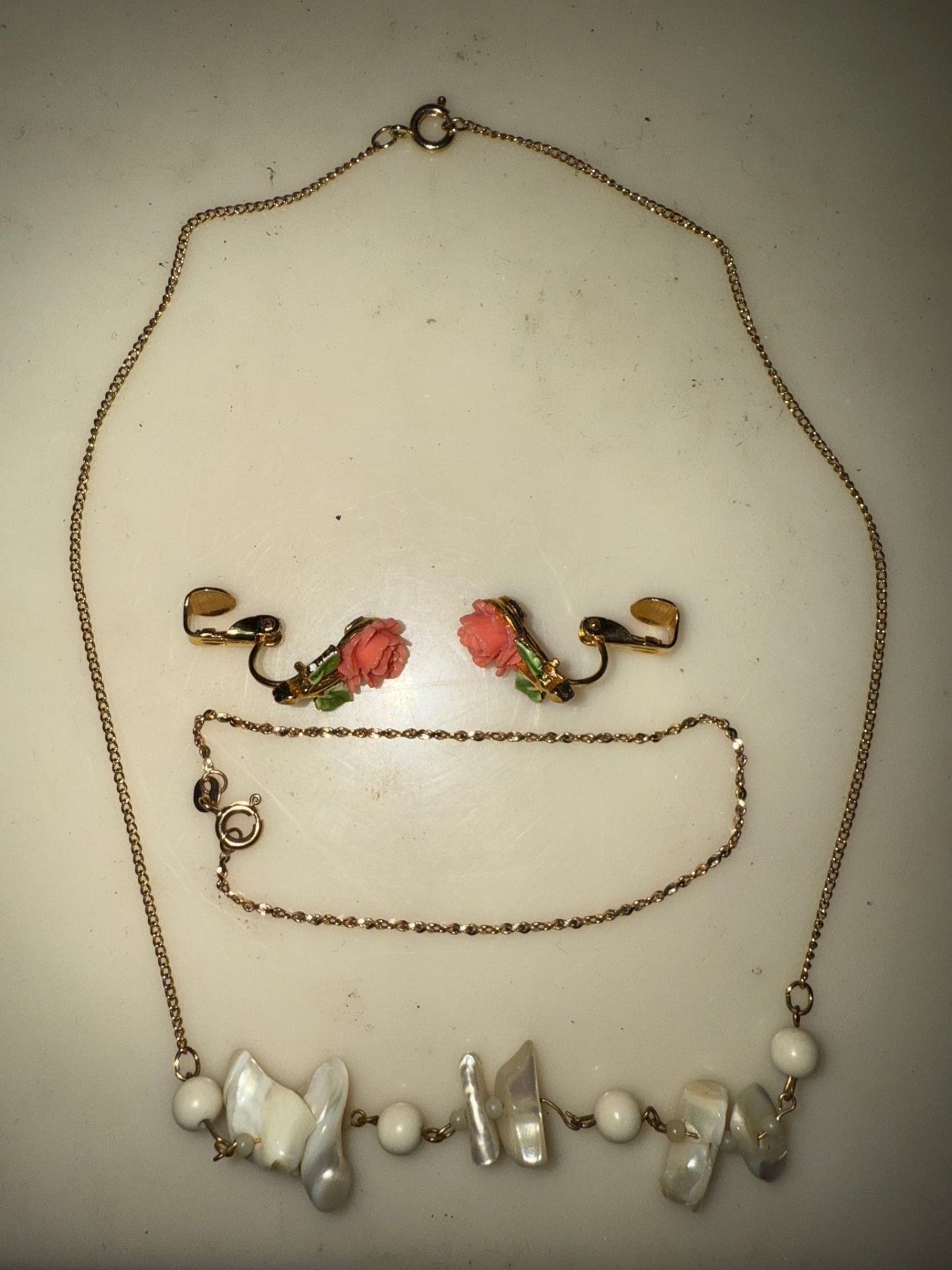 Vintage 10k Gold Bracelett & Necklace w/ Rose Floral Clip On Earrings