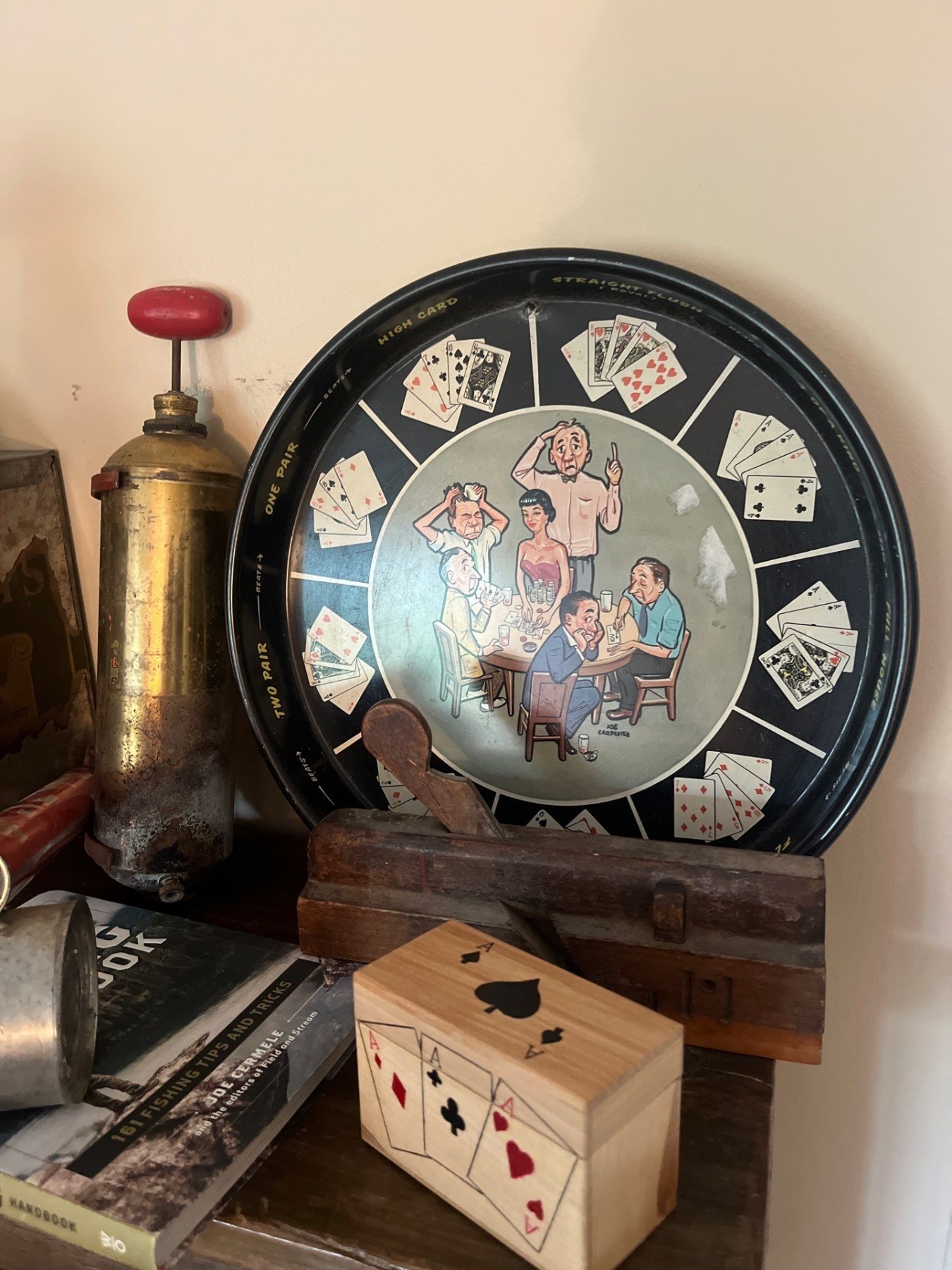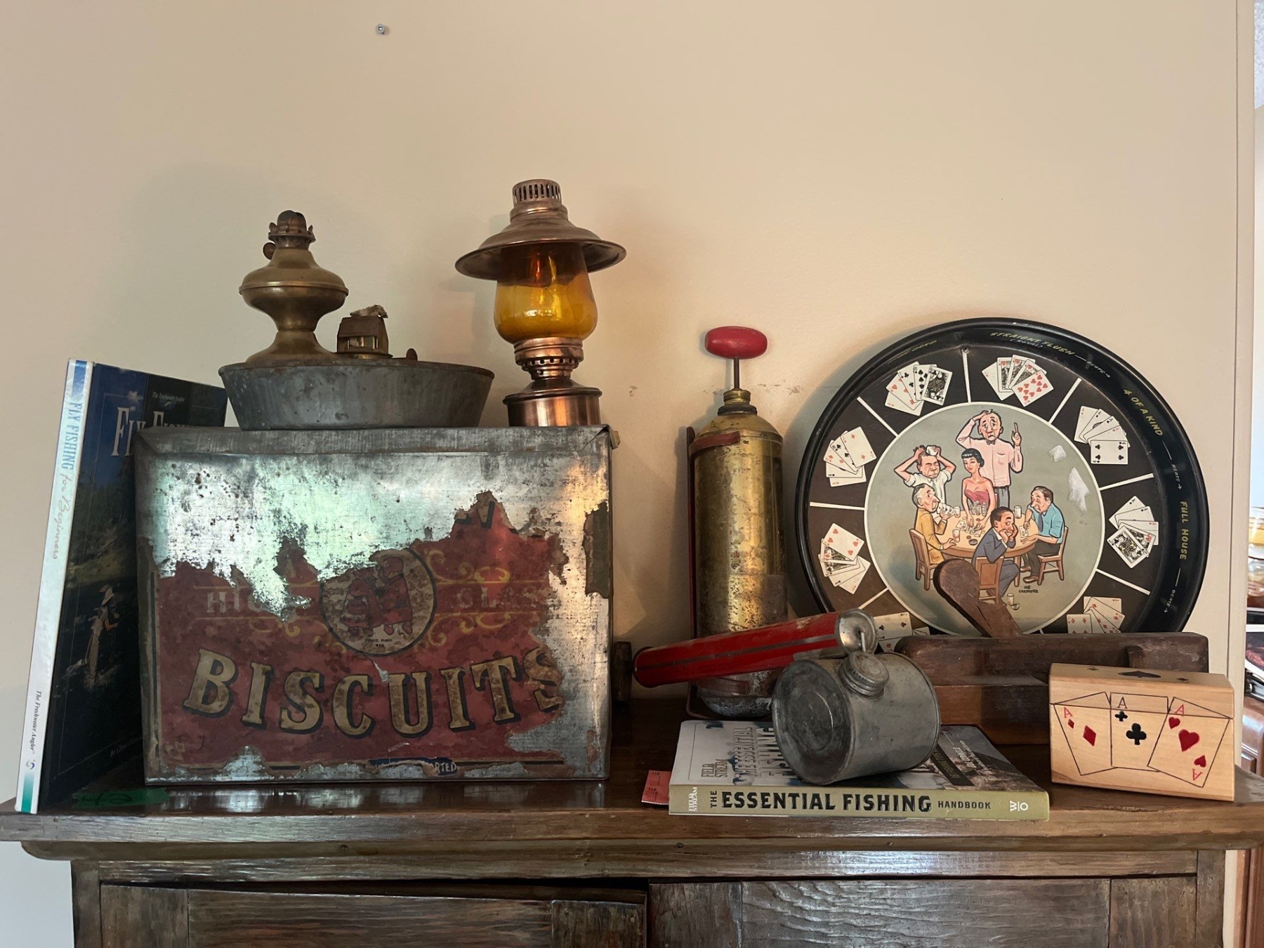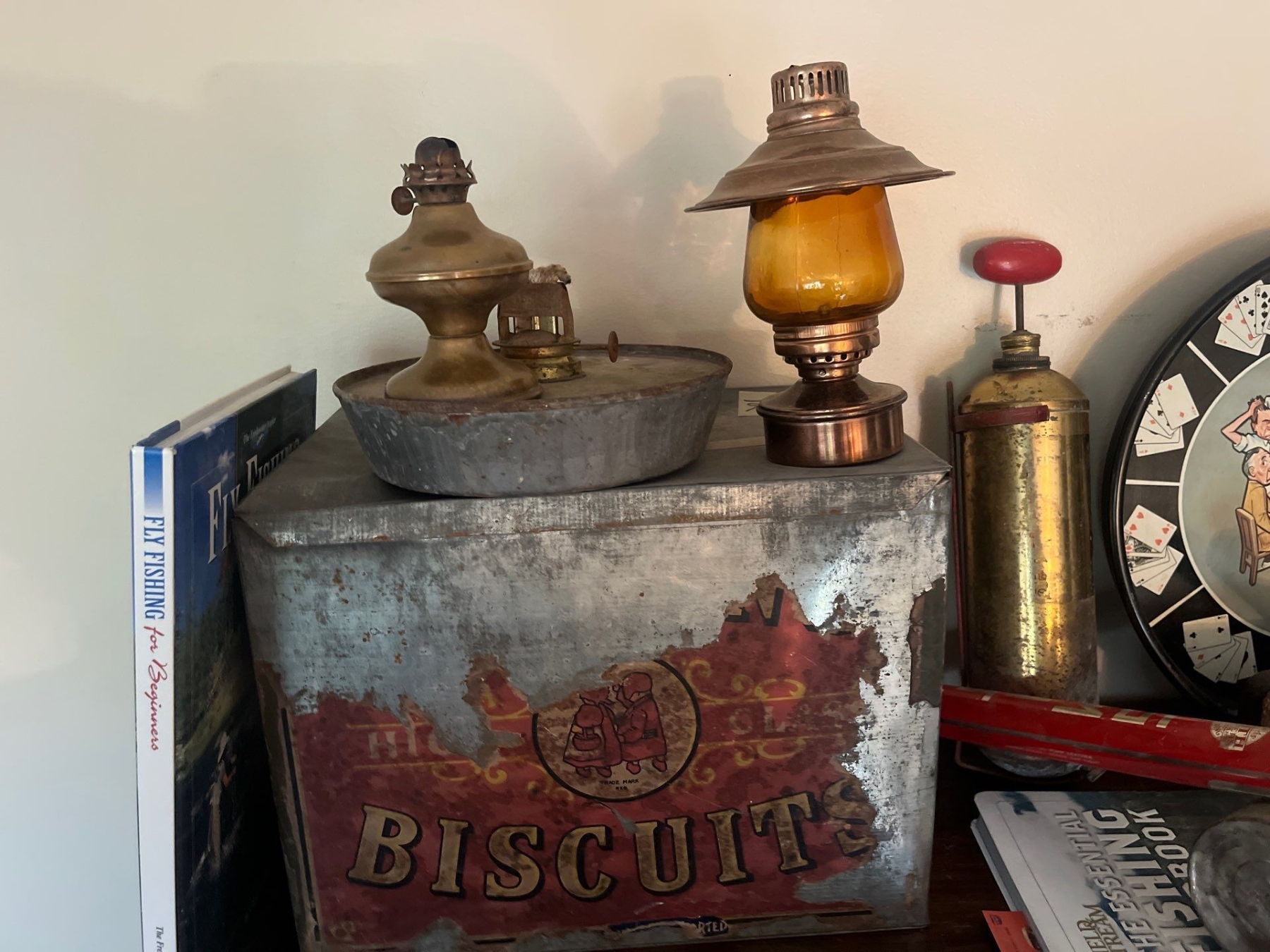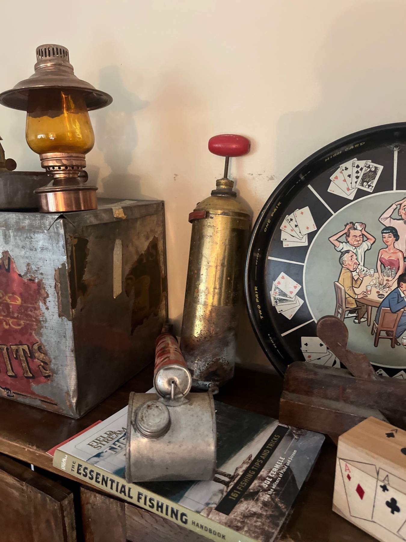 Vintage 1950s serving dish/poker vintage tins and lanterns along with antique aerosol sprayers
