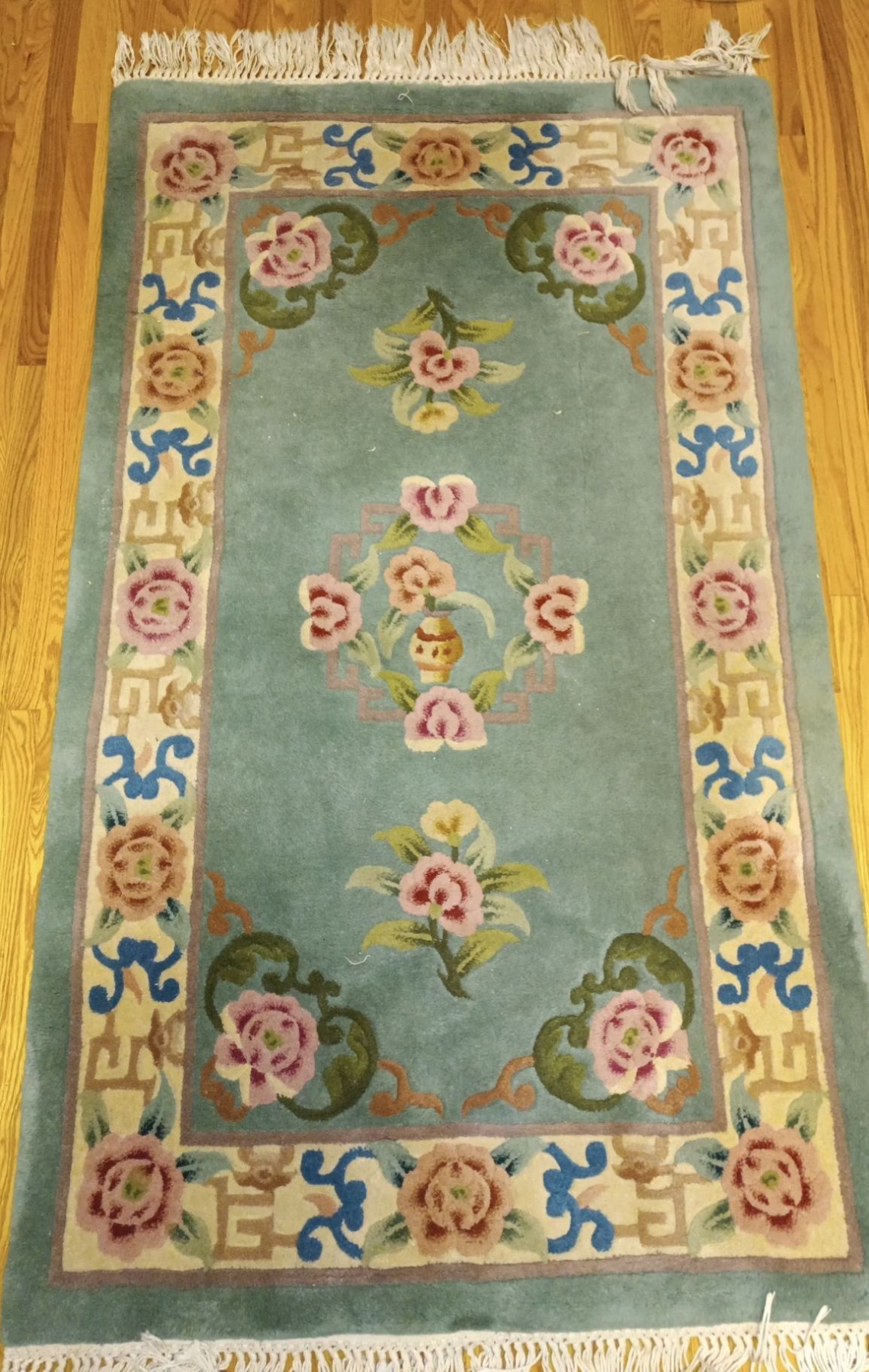 Vintage 1980's Chinese Wool Floral Deco Style Rug Hand Woven & Knotted