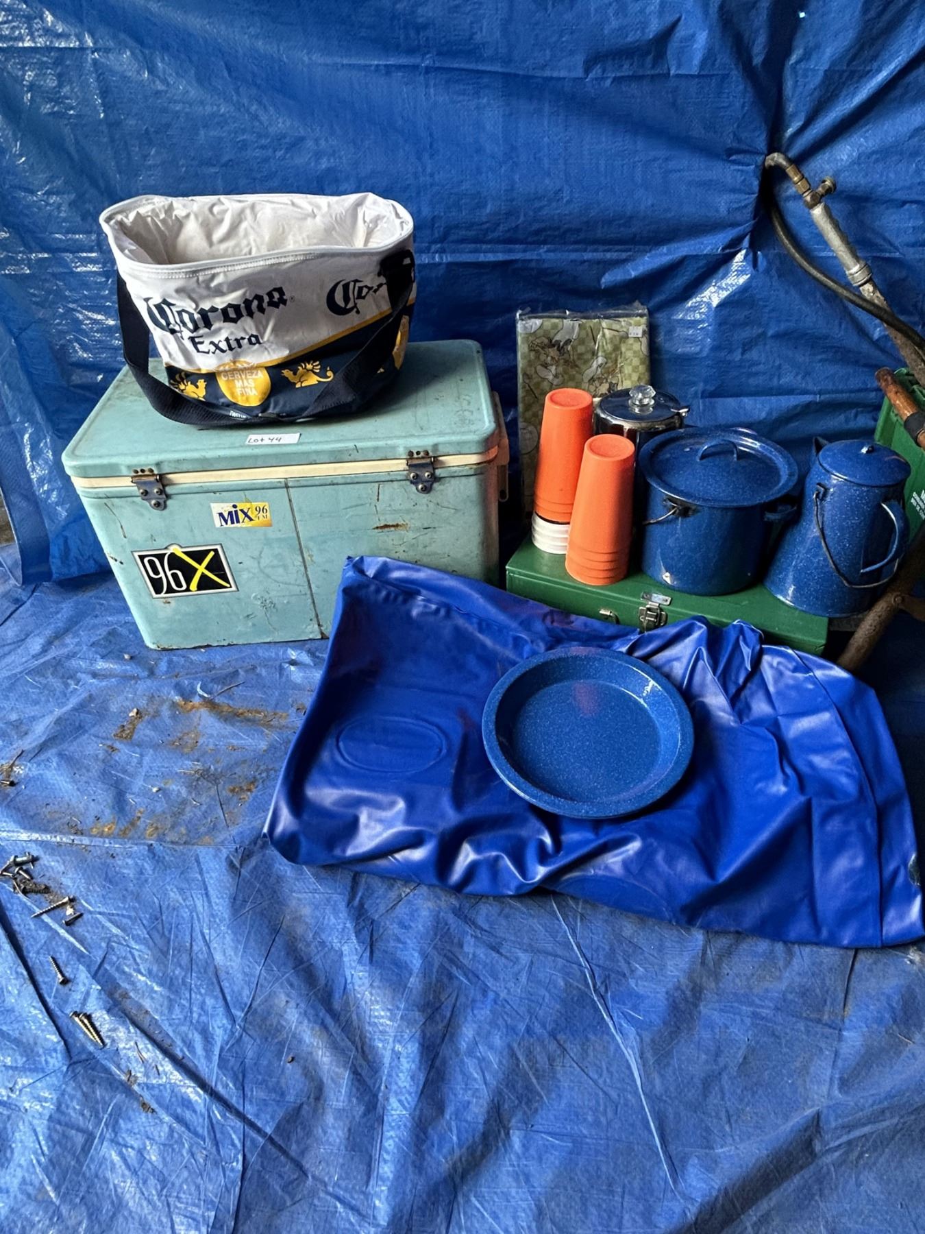 Vintage Baby Blue Used Cooler With Air Mattress And Camping Gear